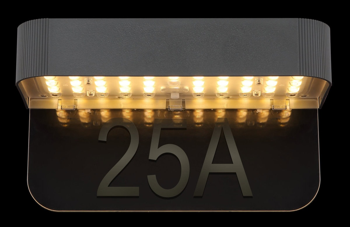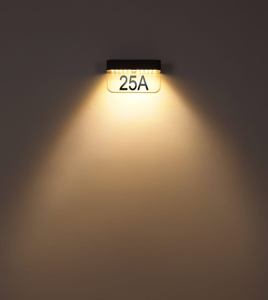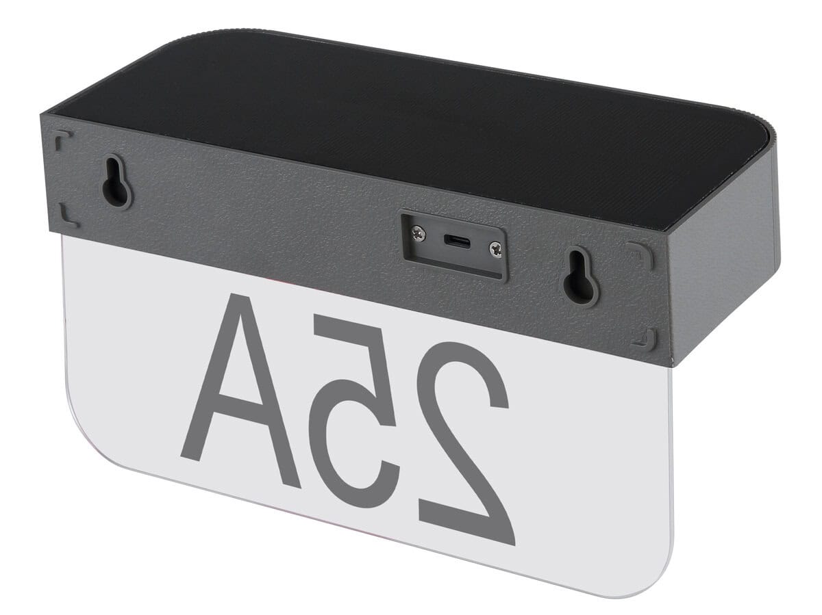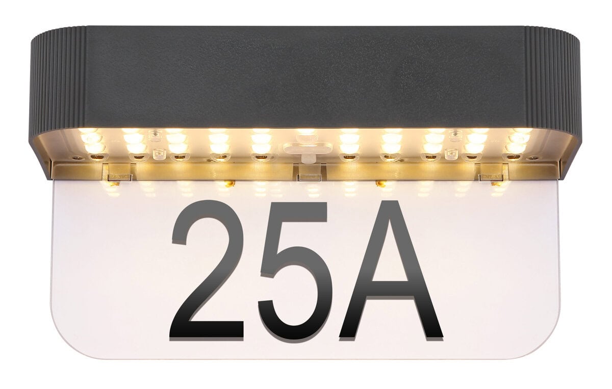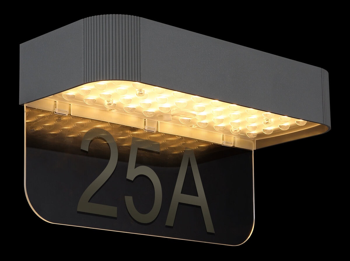 Ravna solarna zidna lampa sa kućnim brojem kombinuje moderan dizajn sa visokom funkcionalnošću. Tijelo izrađeno od mat sive plastike i prozirna akrilna nijansa osiguravaju elegantan, suvremen izgled. Opremljeno snažnom LED-om, svjetlo postiže do 1000 lumena s ugodnom toplom bijelom bojom svjetlosti od 3000 K. Zahvaljujući integriranom detektoru pokreta, možete birati između tri načina osvjetljenja: 1) trajno stanje pripravnosti sa 100 lm, 2) 100 lm pripravno stanje – sa pokretom standby 500 lm, ili 05 sekundi bez pokreta, ili 05 sekundi lm 25 sekundi. Step prekidač na prekidaču pritiska omogućava jednostavno podešavanje. Punjenje se odvija putem sunčeve svjetlosti (cca. 8 sati) ili putem USB-C (cca. 5 sati), a osvjetljenje traje do 12 sati. Obim isporuke uključuje naljepnice za kućne brojeve (1x A-E i 3x 0-9). Sa klasom zaštite IP65, svjetlo je otporno na vremenske uvjete i savršeno za vanjsku upotrebu.