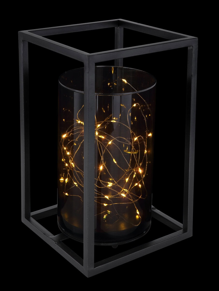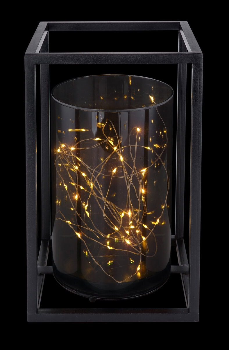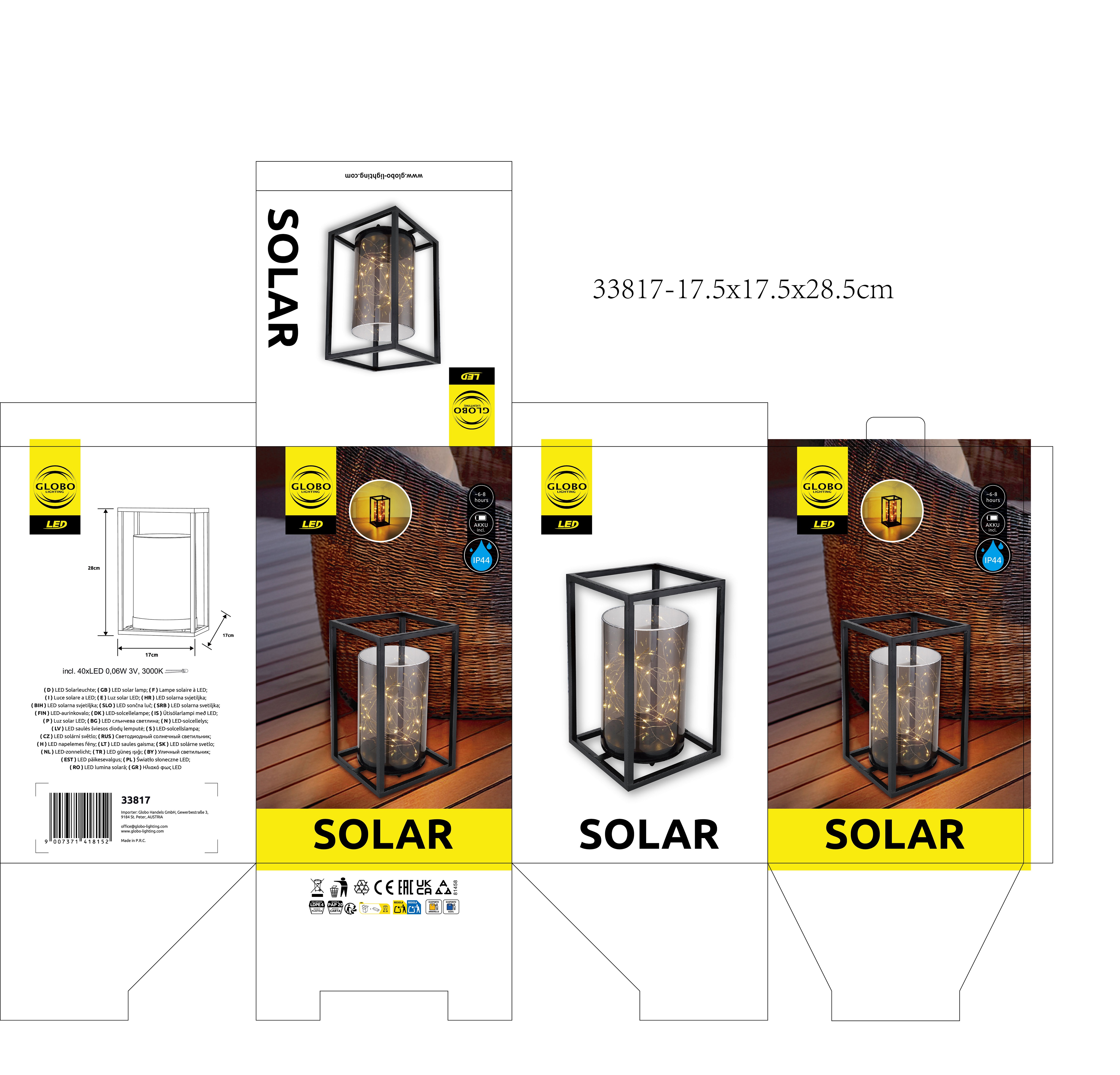 Ova kockasta solarna lampa od crnog metala (17×17 cm) savršena je za Vaš vrt, terasu ili balkon. Unutar 28 cm velikog metalnog okvira nalazi se cilindrično akrilno staklo, koje je zauzvrat opremljeno nizom svjetala sa ukupno 40 LED sijalica. U kombinaciji s ugodno toplim bijelim svjetlom (3000 Kelvina) LED sijalica na solarni pogon, ovo solarno svjetlo može pružiti moderan ambijent u vašem vanjskom prostoru.