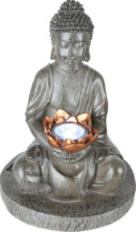 Istovremeno lijepa dekoracija i lampa. Ovaj Buda od sive plastike, koji u ruci drži cvijet, zrači ugodnim štihom. Sa stepenom zaštite IP44, ova lampa od 30 cm može se koristiti i na otvorenom.