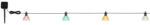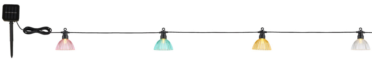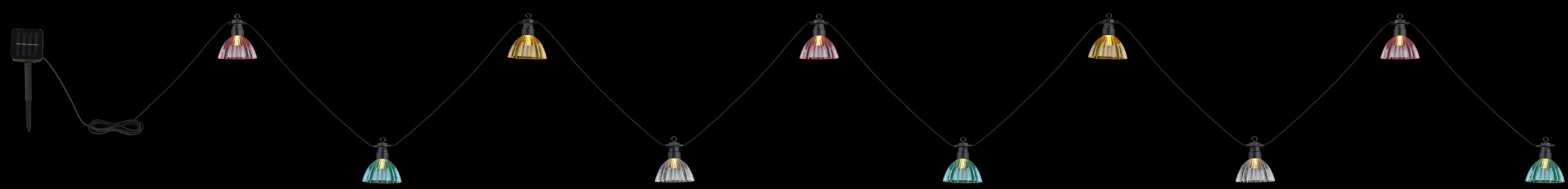 Ovaj sjajni solarni svjetlosni lanac od crne mat plastike je prekrasan dodatak vašem vrtu, terasi ili balkonu. Zahvaljujući IP44 ocjeni, ovaj niz svjetala možete bezbedno postaviti na otvorenom. Deset plastičnih svetiljki (prečnika 8,5 cm svaka) plus kabl imaju ukupnu dužinu od 3,6 m. Nijanse u ružičastoj, zelenoj, bistroj i žutoj boji imaju toplo bijelo svjetlo od 3000 Kelvina i na solarni pogon. Nizom svjetala možete upravljati pomoću prekidača pritiska na priloženom kabelu za napajanje dužine 3 m.