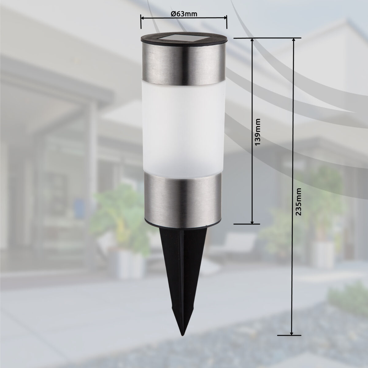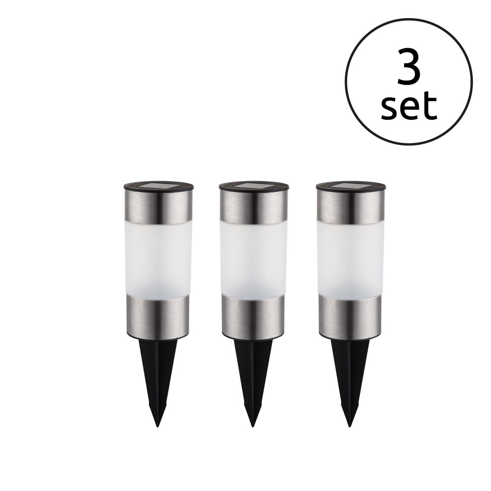 Solarne lampe od 23,5 cm iz ovog seta od 3 su napravljene od nerđajućeg čelika i satenirane plastike. Ugrađene baterije omogućavaju da LED sijalice (svaka od 0,06W) svijetle maksimalno osam sati. Sa svojim IP44 stepenom zaštite, apsolutno su pogodni za upotrebu na otvorenom.