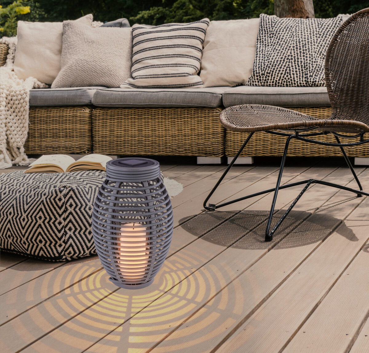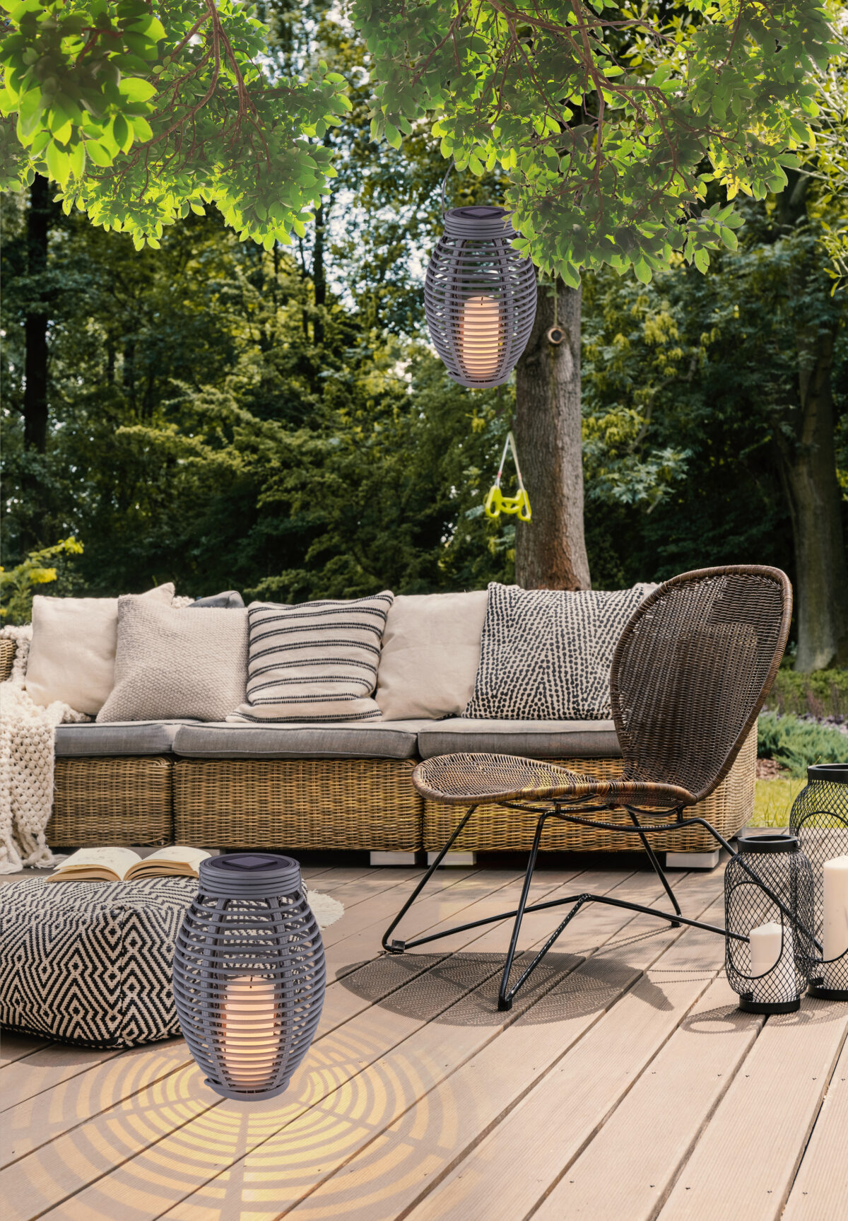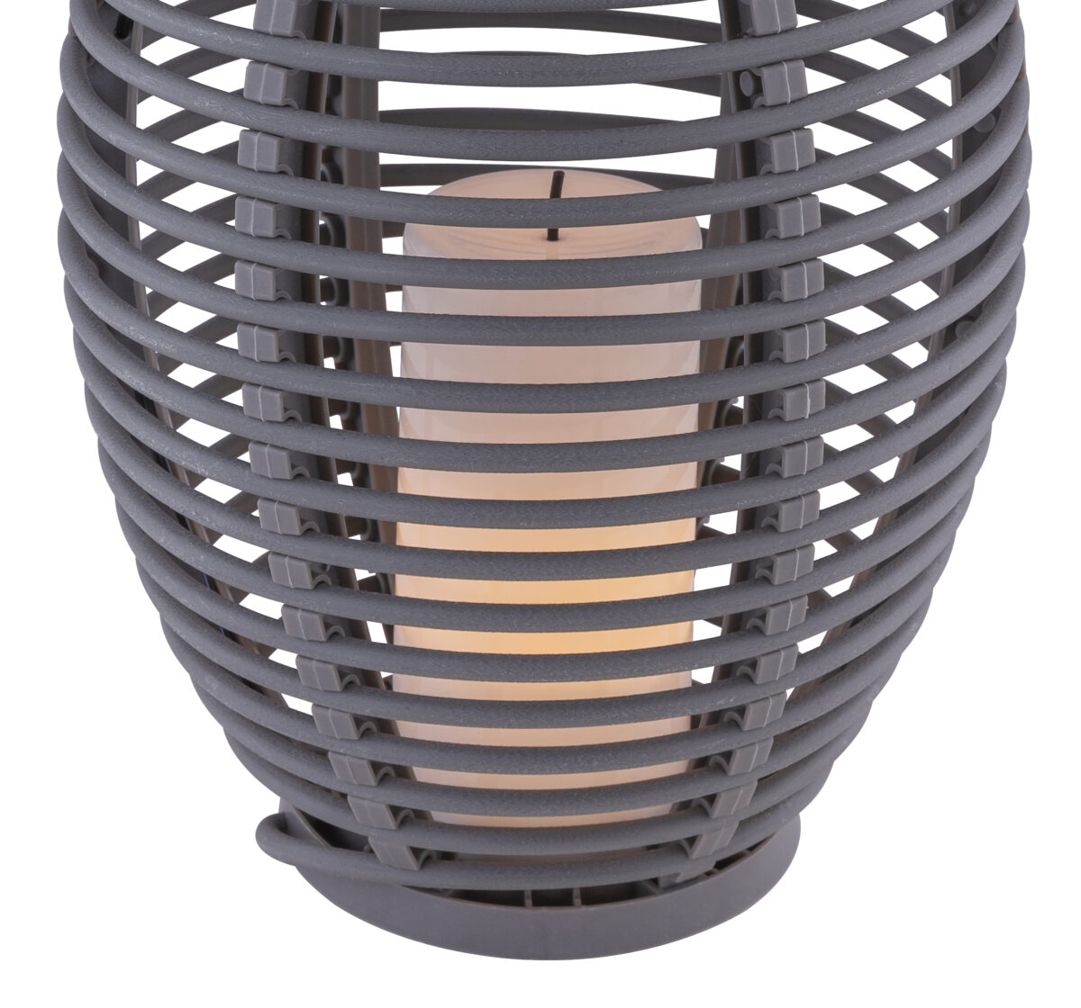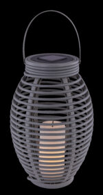 Siva solarna lampa od ratana izrađena od visokokvalitetne plastike pretvara Vaš dom u wellness oazu posebne vrste. Bilo da stoji ili visi, ova dekorativna lampa visoka 350 mm emituje romantično treperavo svjetlo do 8 sati. Prijatno toplo bijelo svjetlo od 3000K može se uključiti/isključiti prekidačem. Sa stepenom zaštite IP44, ova solarna lampa je idealna za spoljašnju upotrebu.