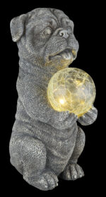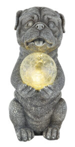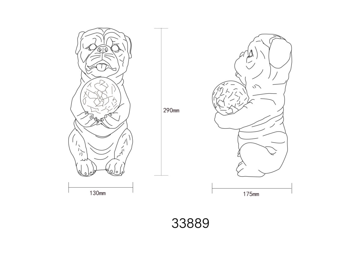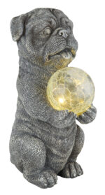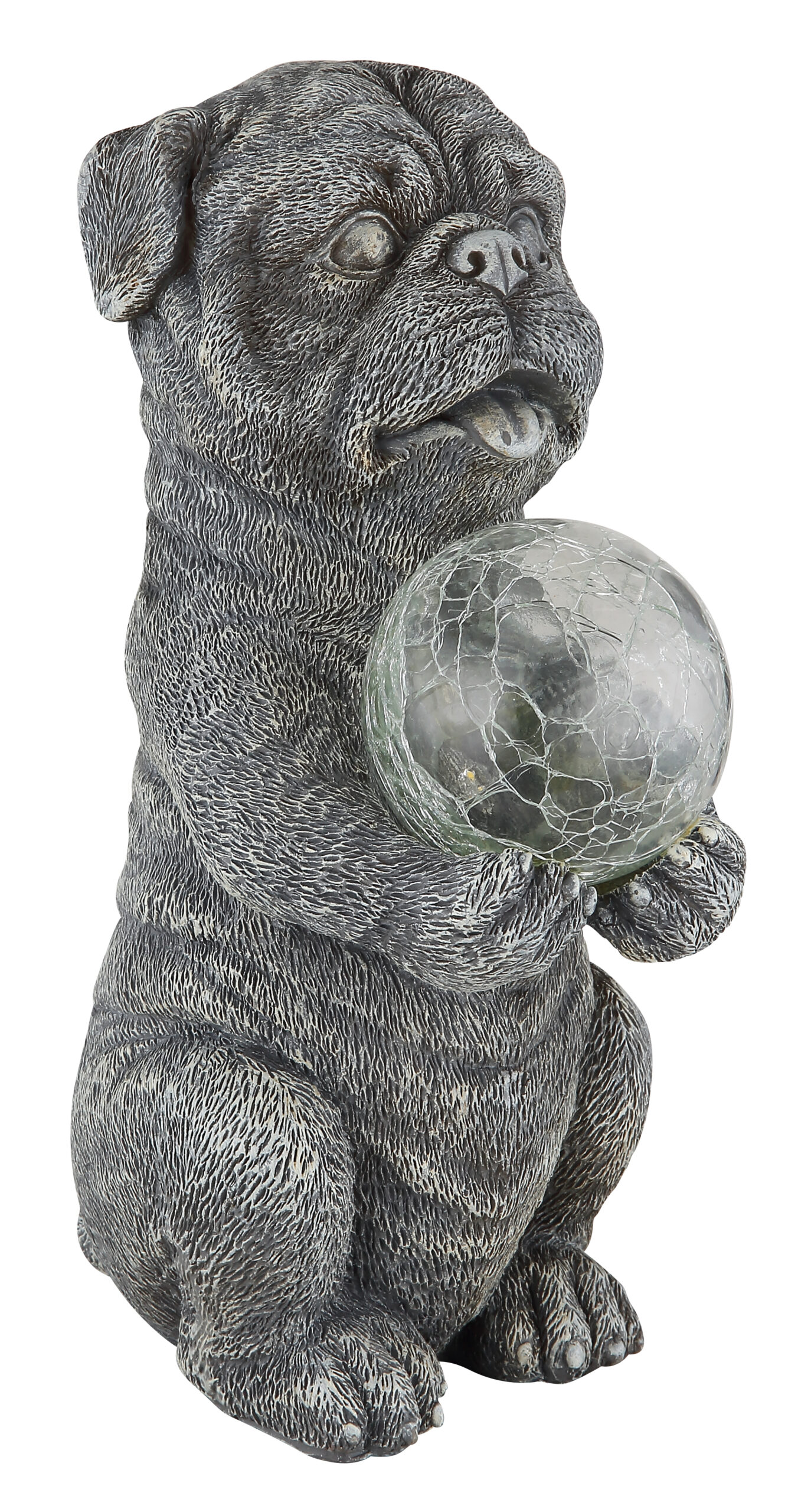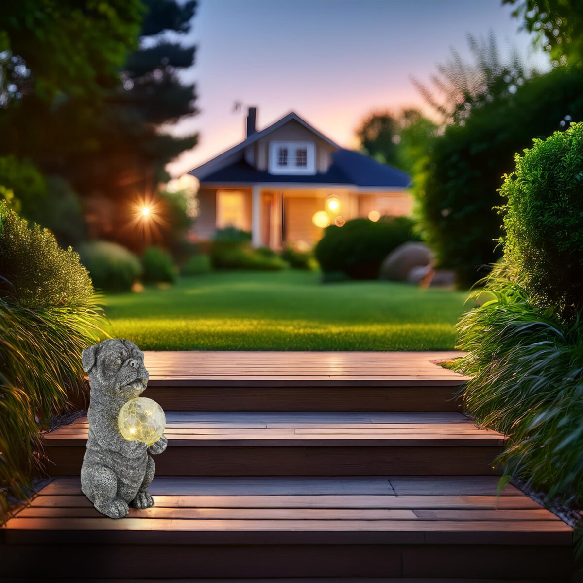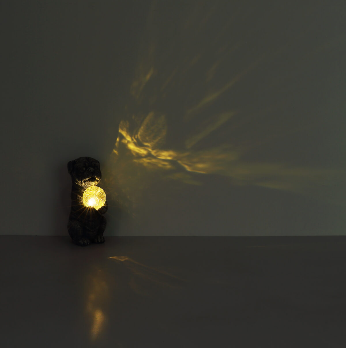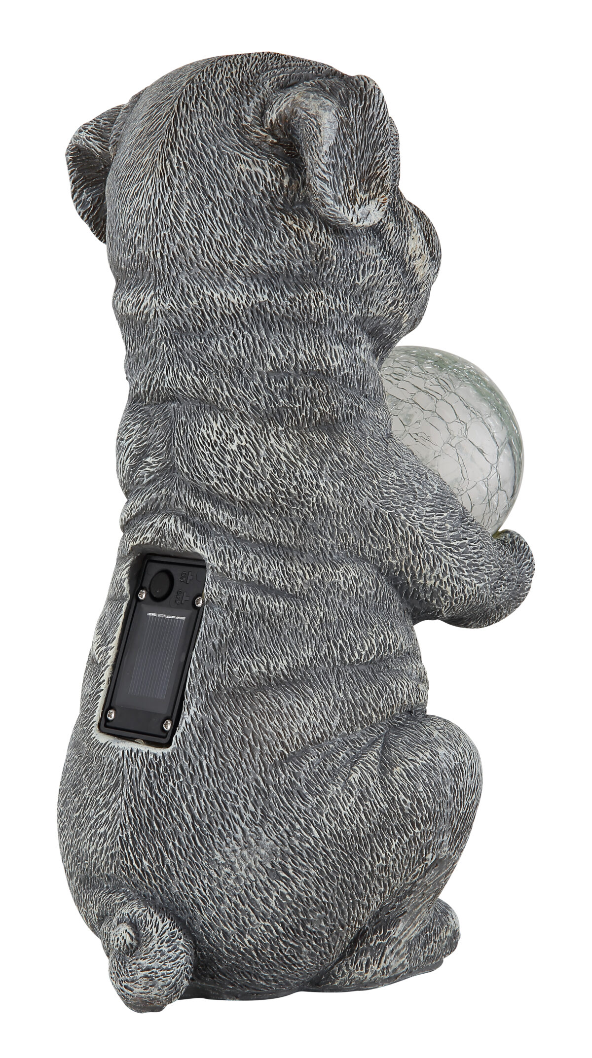 SOLAR LIGHT PLASTIC GREY u dizajnu pasa je šarmantan i funkcionalan dodatak vašem vrtu. Sivo plastično tijelo i prozirna staklena kuglasta sjenila sa efektom pucketanja pružaju atmosfersko osvjetljenje. Sa LED diodom i klasom zaštite IP44, ova svjetiljka je otporna na vremenske uvjete i idealna je za šarmantan dizajn vrta. S ljubavlju dizajniran vrhunac za ljubitelje životinja i vrtova.