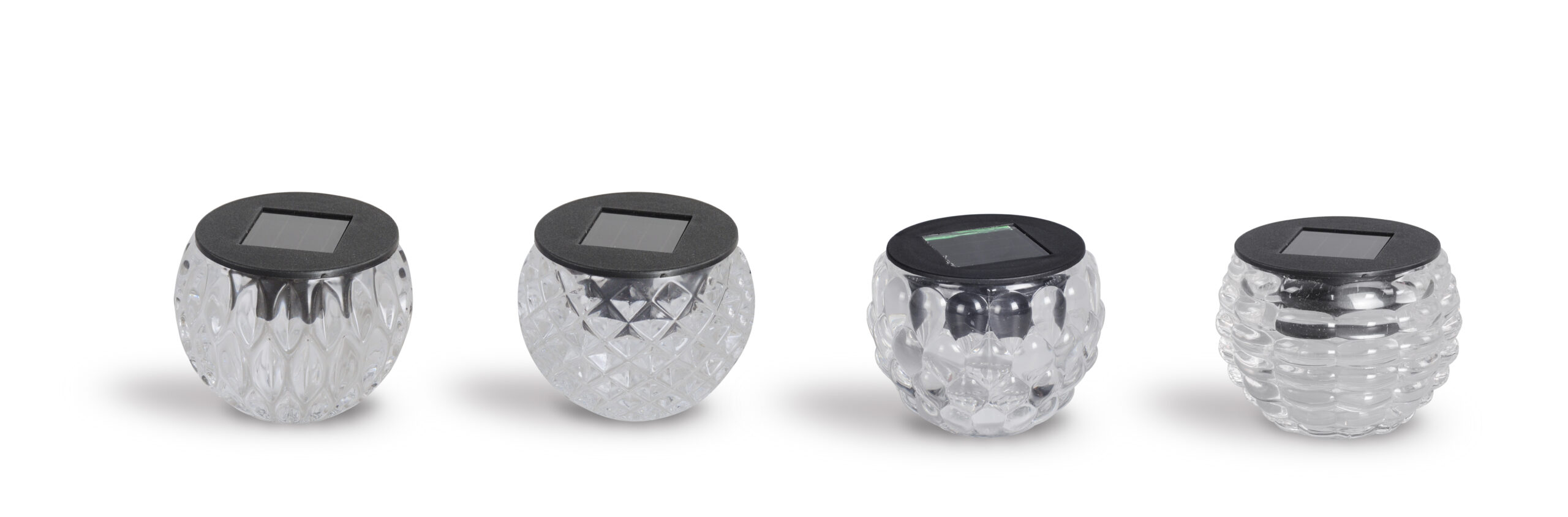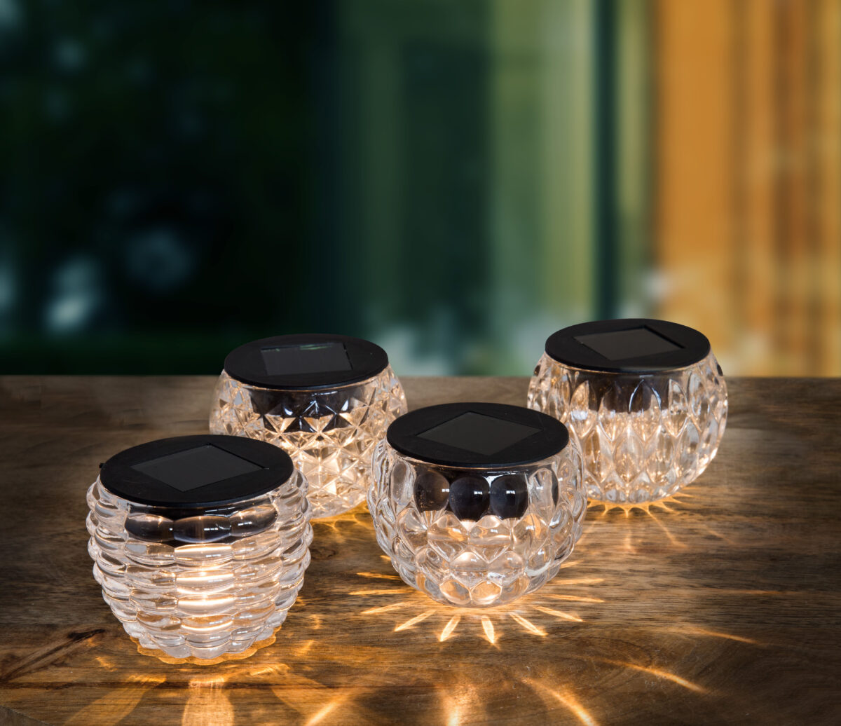 Ovaj 12 displej donosi svjetlinu u vaš vanjski prostor. Bilo na balkonu, terasi ili u paviljonu, solarna lampa se može postaviti bilo gdje na stolu i tako uljepšati blage ljetne večeri. Četiri različite čaše su ukrašene dekorom i ujedno su prekrasan ukras za vaš vanjski prostor. Zbog IP44 klase zaštite, idealno je pogodan za upotrebu na otvorenom.