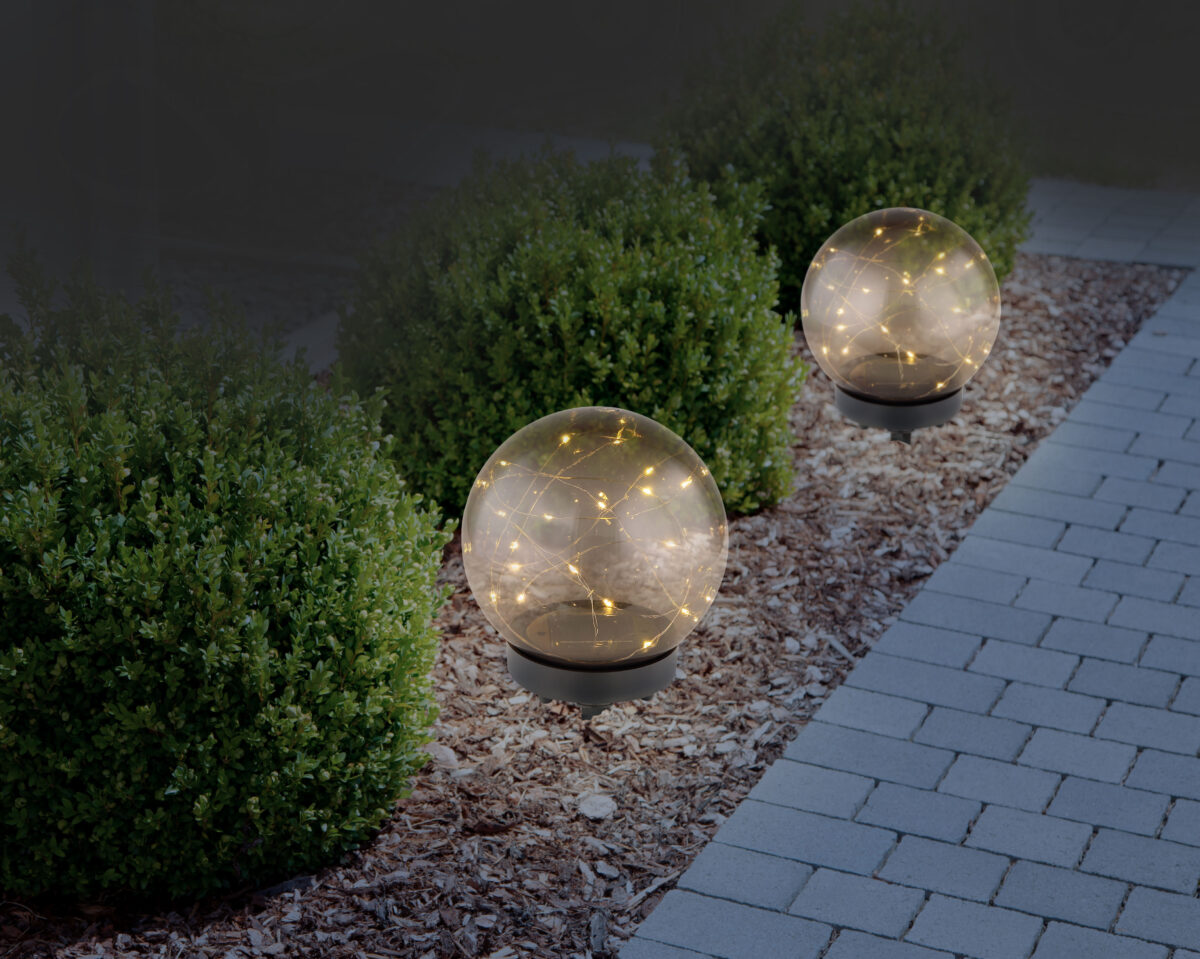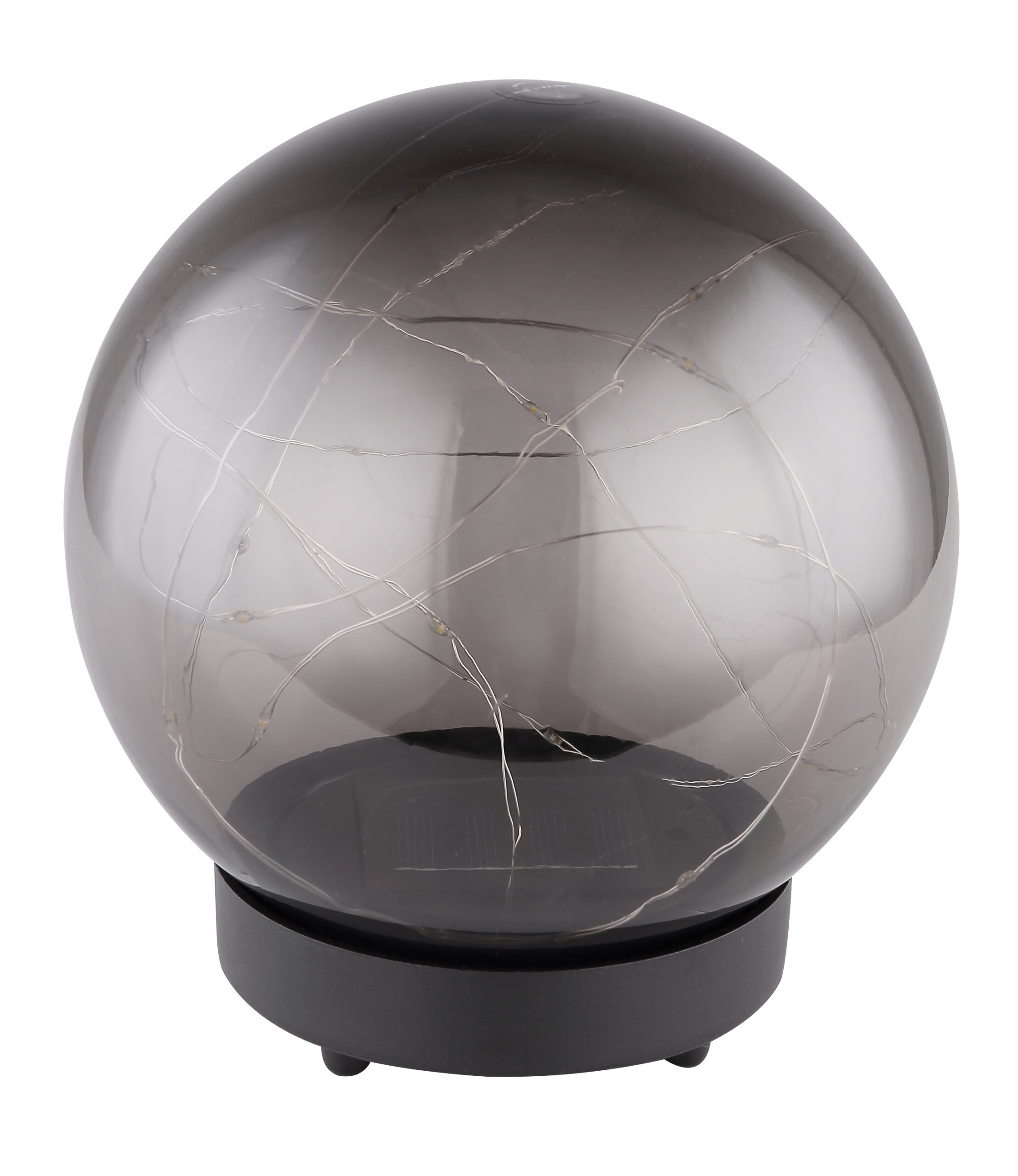 Sferna solarna lampa (Ø15cm) stvara posebnu atmosferu. LED žičano svjetlo smješteno u zadimljenom staklu može pružiti jedinstveno okruženje do 8 sati kada je potpuno napunjeno. Solarna lampa ima prekidač za uključivanje/isključivanje i dolazi sa punjivim baterijama.