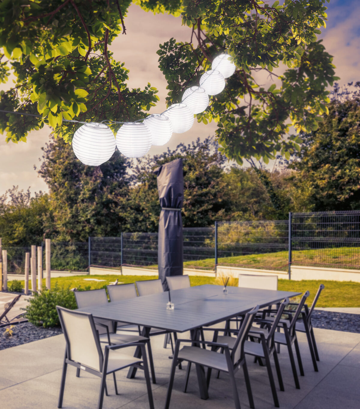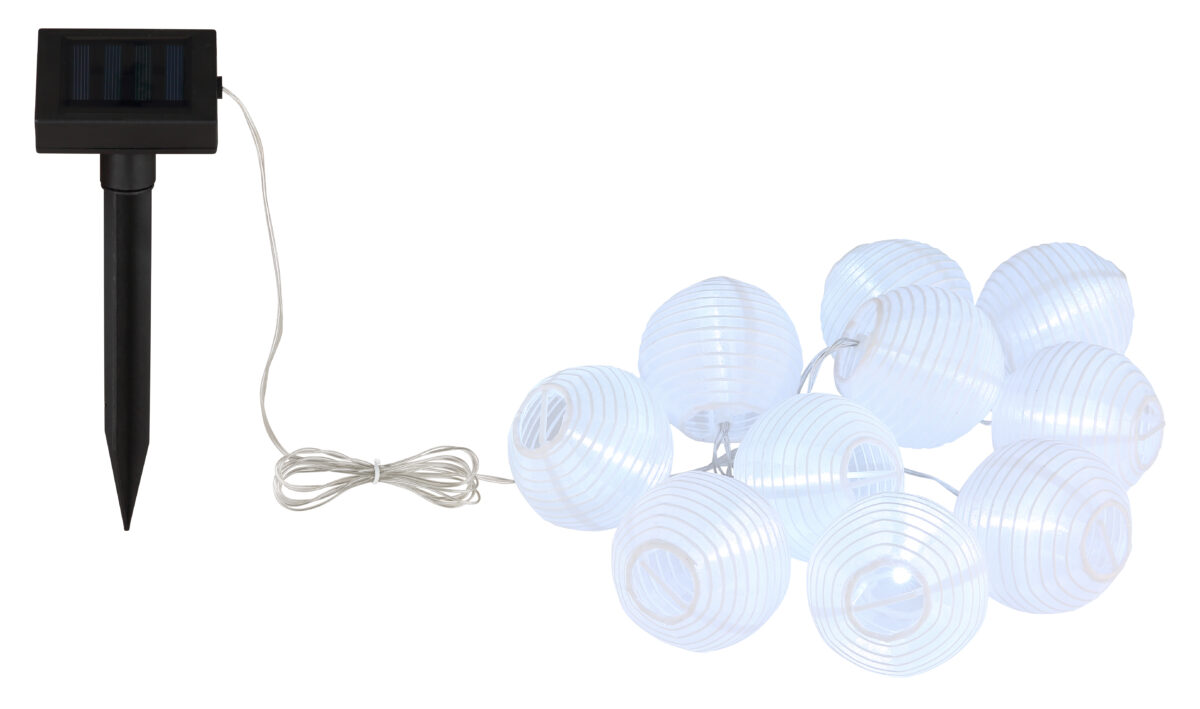 Ovaj prekrasni bijeli plastični solarni svjetlosni lanac doprinosi atmosferskoj atmosferi zahvaljujući svom ukusnom dizajnu. 10 lampiona postavljeno je na lanac dužine 3 metra koji odgovara dizajnu. Zahvaljujući IP44, ovaj proizvod se također može lako integrirati u vanjski prostor.