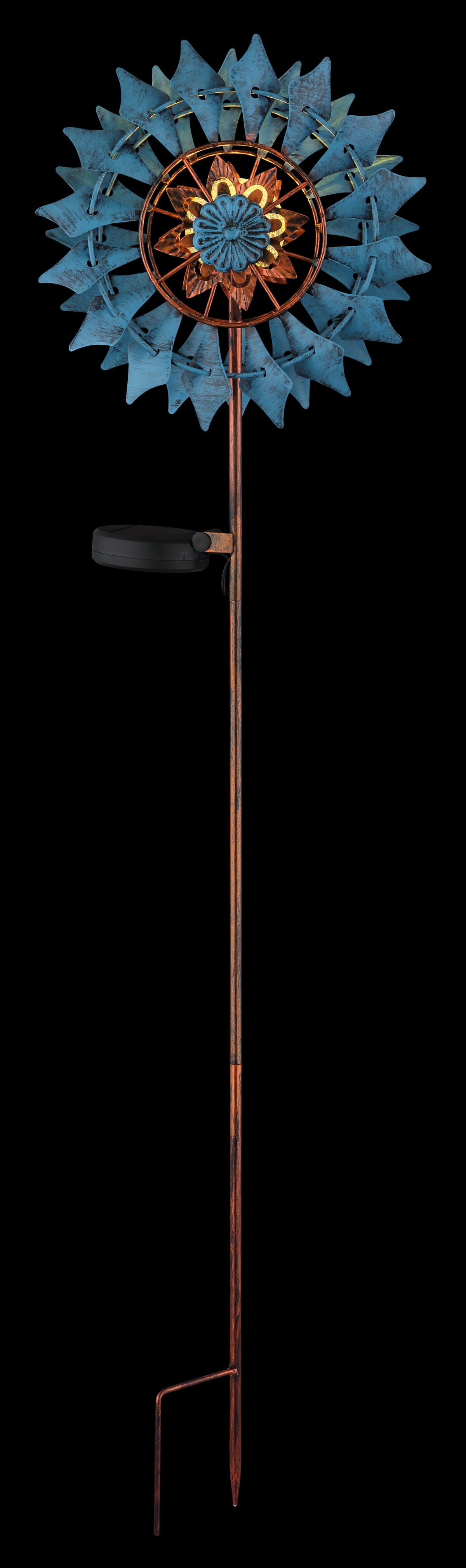 Solar Light Metal Gold Patinated kombinuje šarmantan dizajn sa modernom solarnom tehnologijom i postavlja stilske akcente u vašem vrtu ili otvorenom prostoru. Ova solarna lampa okruglog dizajna impresionira svojom jedinstvenom turbinom na vjetar na zemljinoj točki, koja je sačuvana u starinskom metalu zlatne boje. Nijansa kombinuje zlatne i antičke metalne akcente sa dodirom plavog metala, dok staklena kugla sa efektom pucketanja stvara intrigantno svetlosno raspoloženje. Svetiljka je opremljena LED diodom koja daje toplotu svjetlosti na temperaturi od 3000 K i posebno je otporna na vremenske uvjete zahvaljujući svojoj klasi zaštite IP44. Sa kompaktnim dimenzijama od 225 mm x 115 mm i praktičnim dugmetom, ova solarna lampa je funkcionalna i dekorativna. Idealno za dodavanje elegantnog i bezvremenskog dodira vašem vanjskom prostoru!