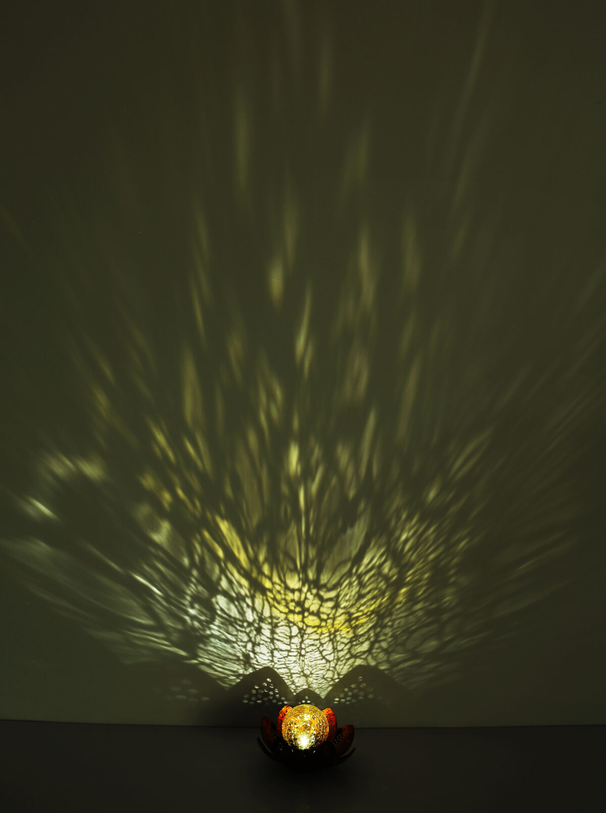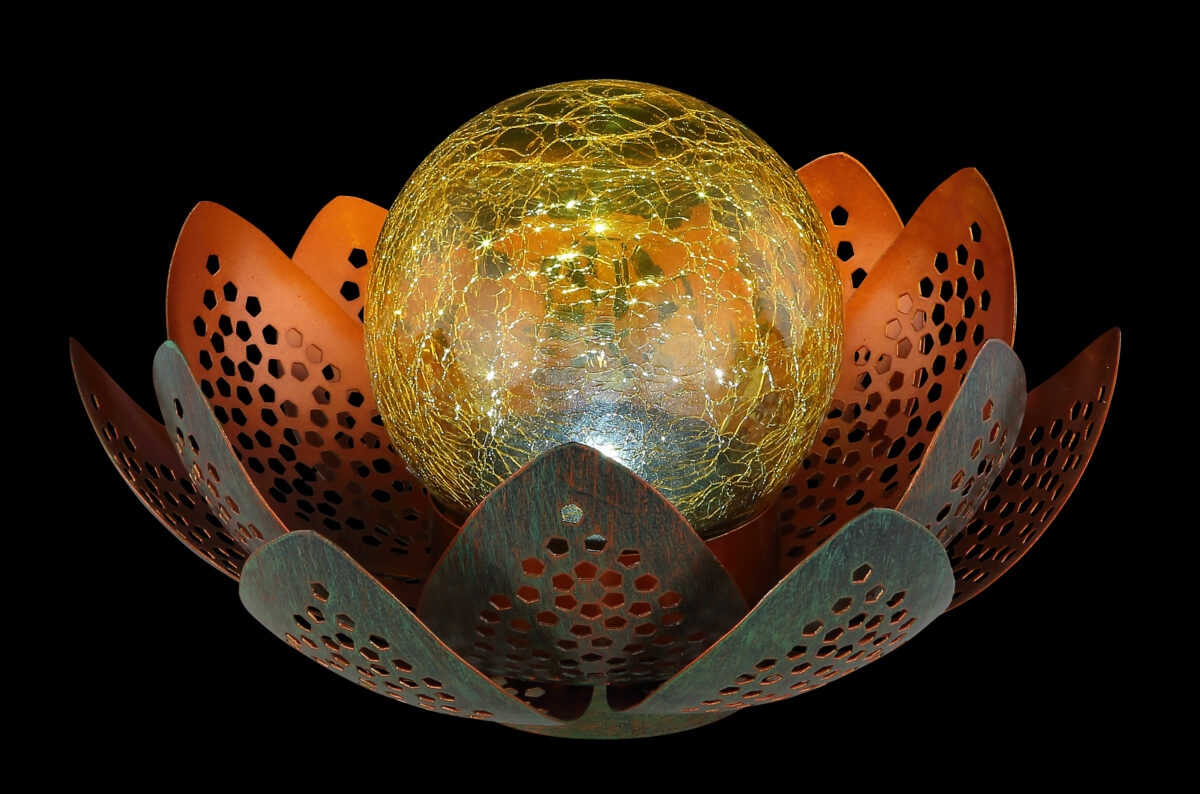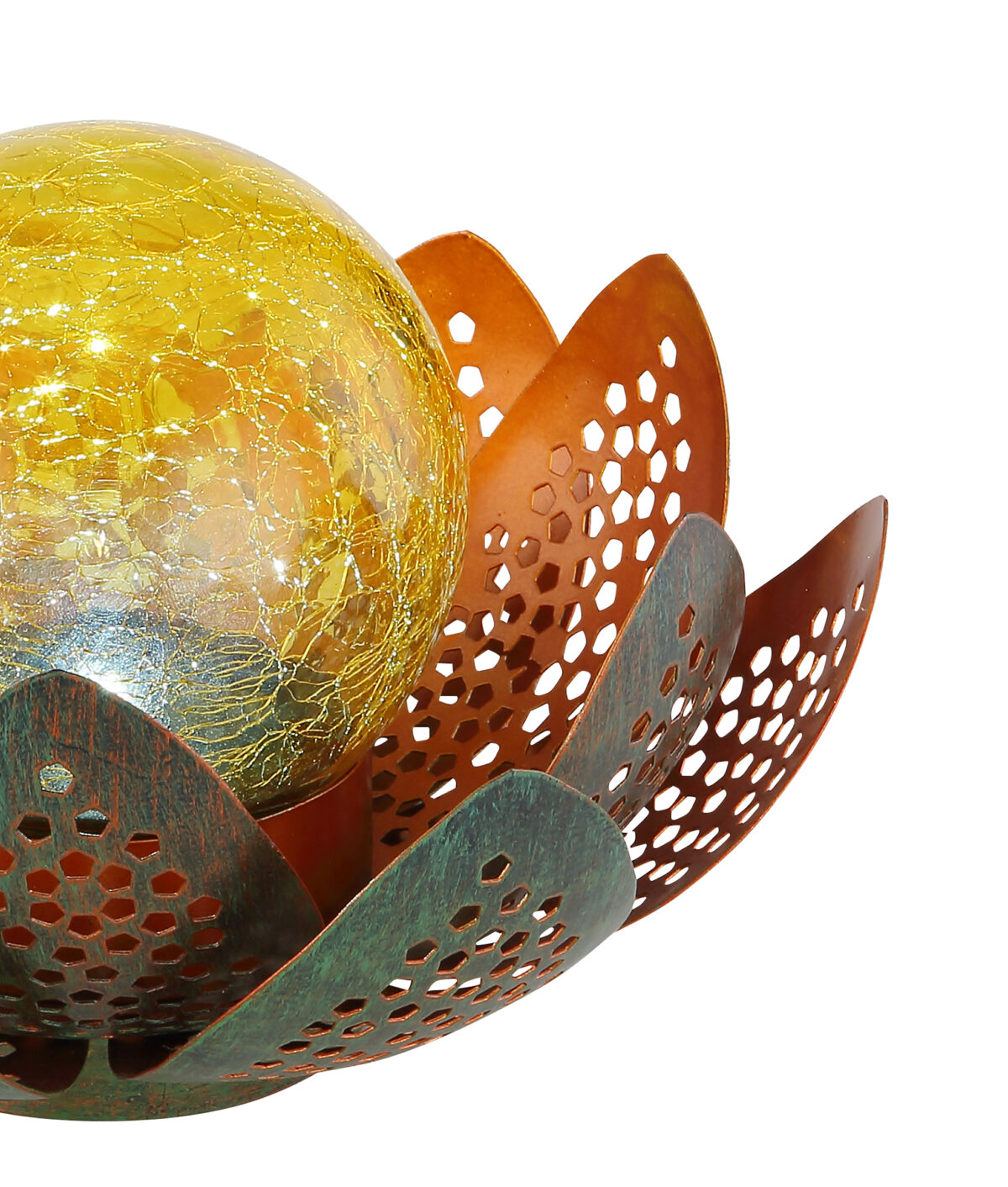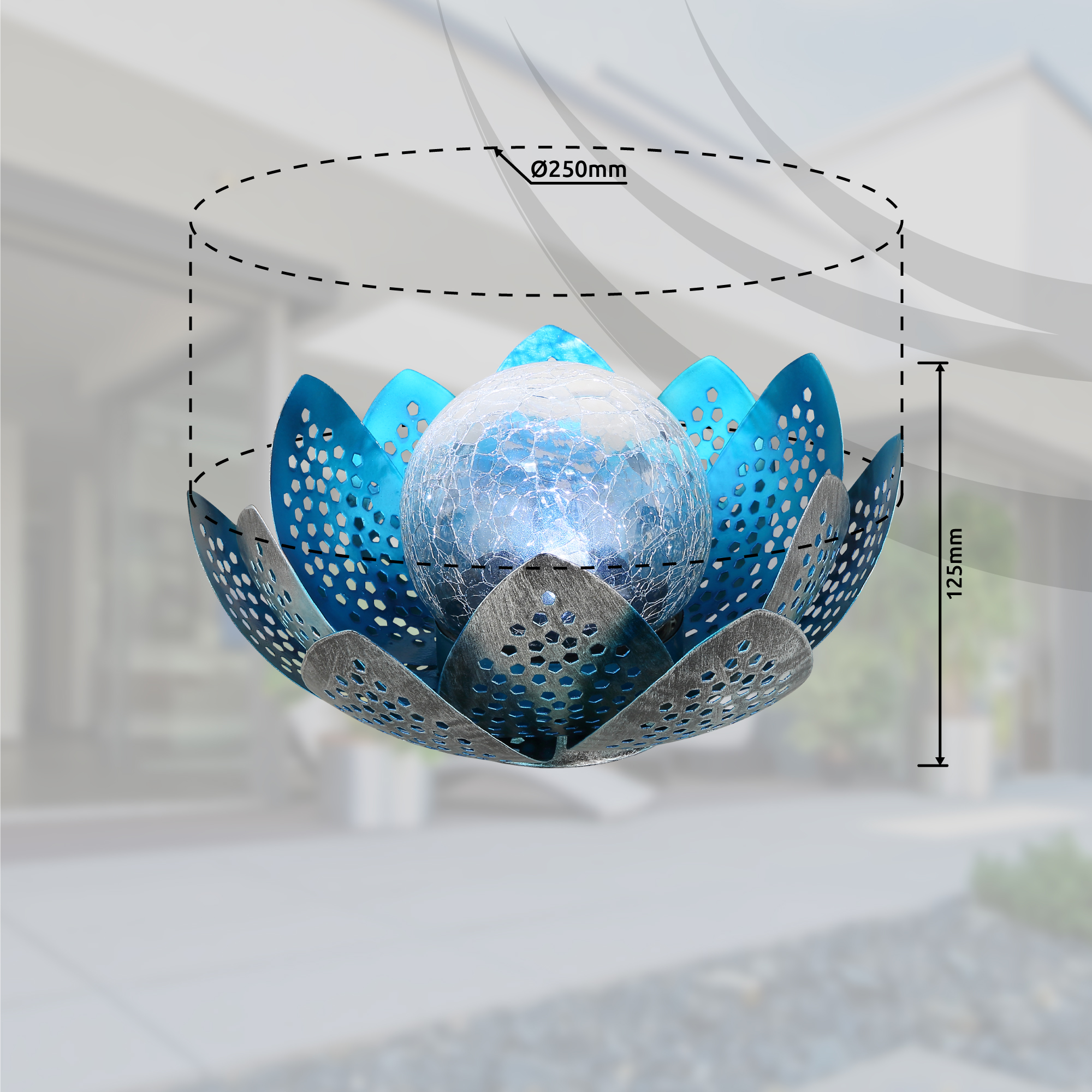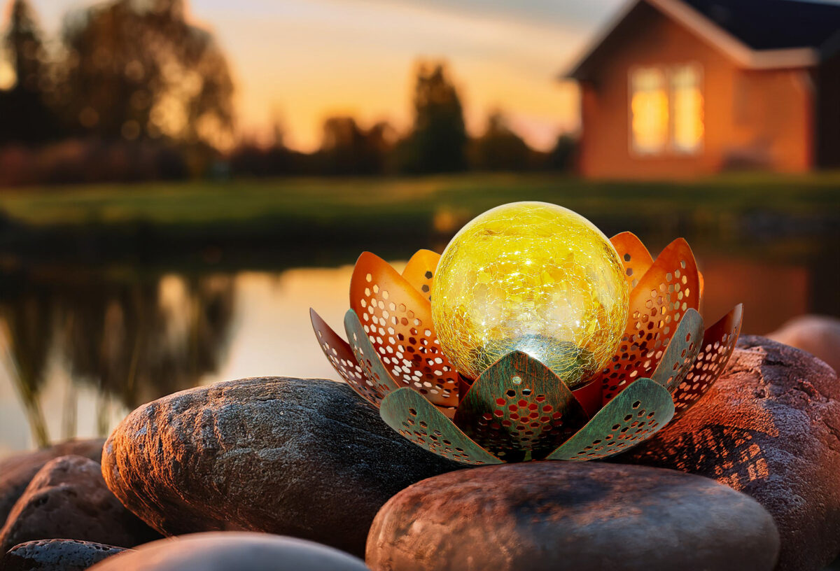 Ovo je solarna lampa u obliku egzotičnog cvijeta, koja je prekrasan dodatak svakom vanjskom prostoru. U sredini lampe nalazi se staklena kugla boje ćilibara sa optikom pucketanja, okružena izbušenim laticama od metala zelene i zlatne boje. Pretvorite svoju baštu u oazu blagostanja uz ovaj SolarLotus cvijet. Tokom dana lampa služi kao dekorativni element, a u sumrak solarna lampa počinje da sija i stvara magičnu igru svetlosti. Osim toga, ova solarna lampa radi isključivo na solarnu energiju i postiže vrijeme gorenja do 8 sati kada je baterija potpuno napunjena. Zahvaljujući stepenu zaštite IP44, koji štiti od prskanja vode, ovaj proizvod se bez oklijevanja može koristiti na otvorenom.