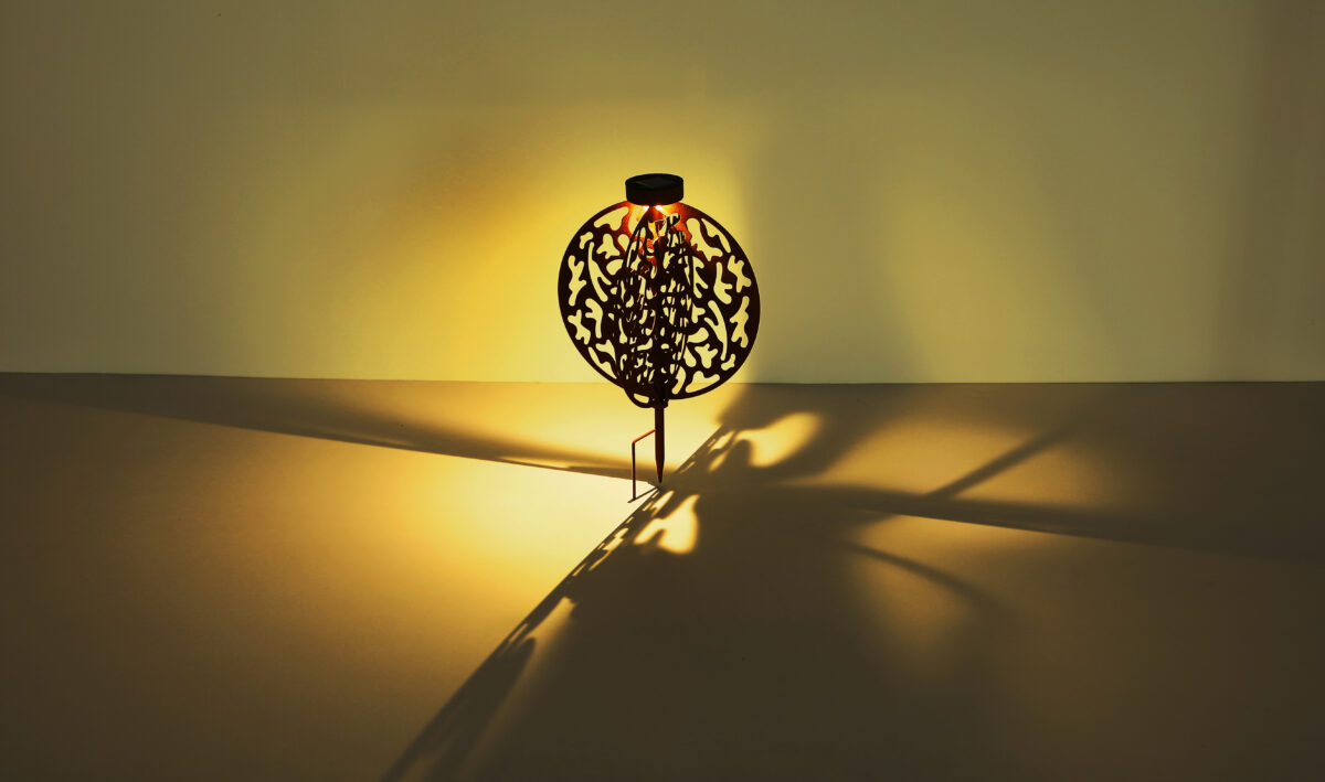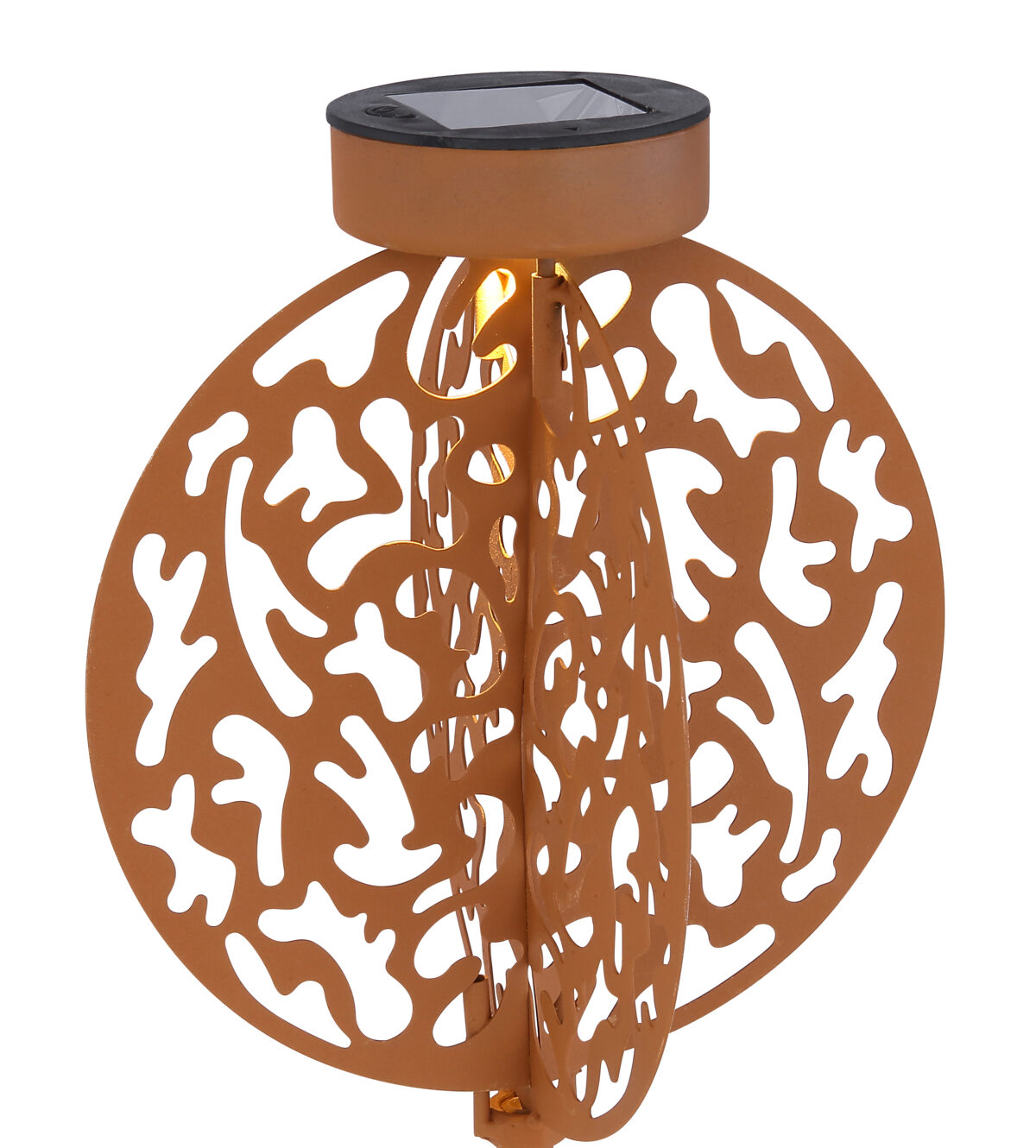 Ova solarna lampa od metala boje hrđe (klasa zaštite IP44) je prekrasan dodatak vašem vrtu. Uz pomoć zemljanih vrhova može se lako i fleksibilno postaviti u meko tlo. Prijatno toplo bijelo svjetlo (3000 Kelvina) LED sijalice na solarni pogon sija odozgo na ekstravagantni uzorak u dvije ortogonalno zakačene metalne ploče (ø 20 cm svaka) i tako doprinosi atmosferskom ambijentu u vašem vanjskom prostoru.