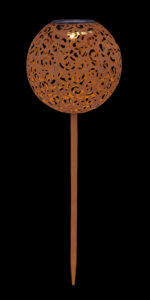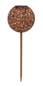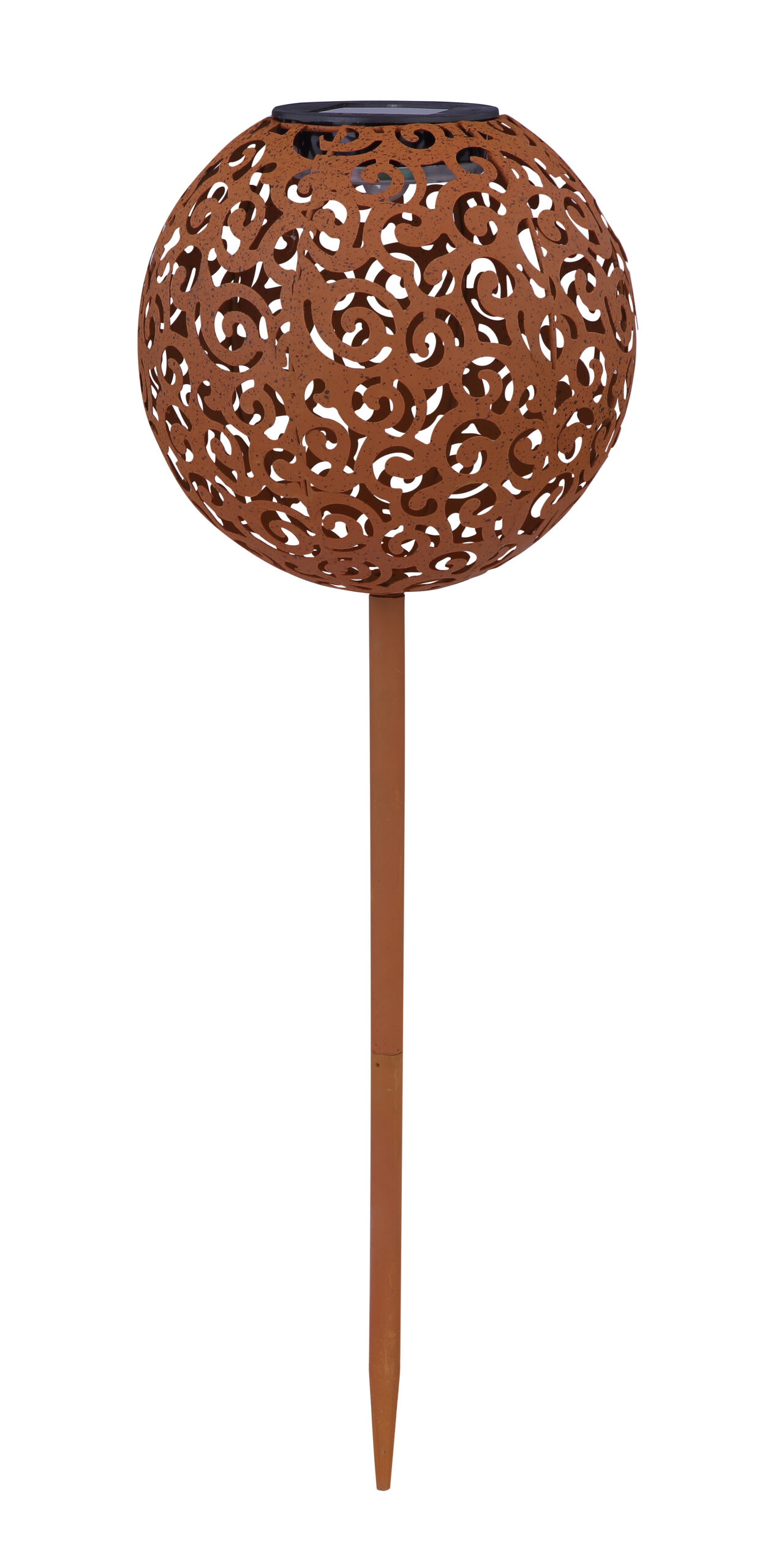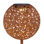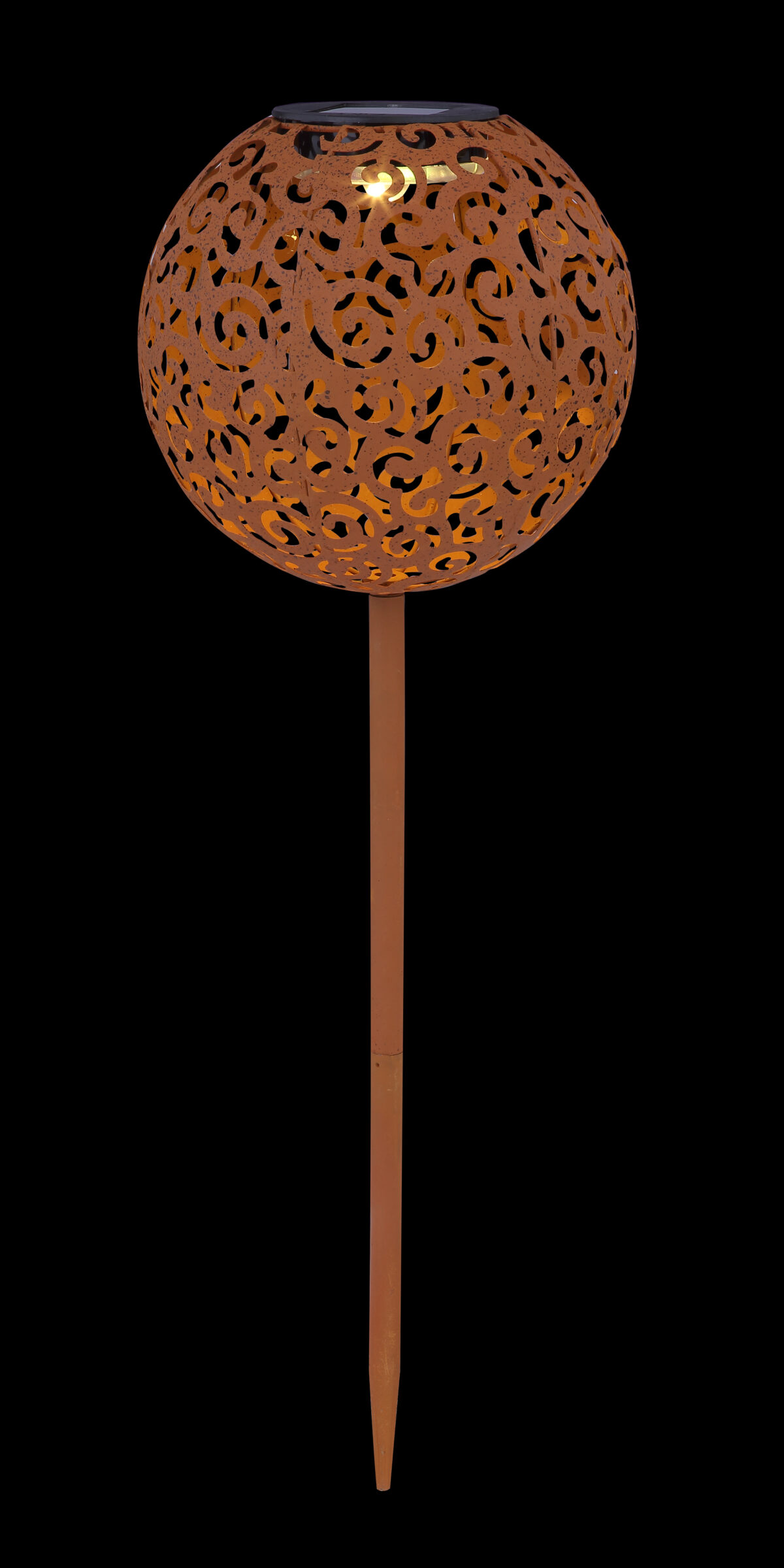 Ova metalna solarna lampa boje hrđe obogatit će vaš vrt svojim starinskim dizajnom. Ova solarna lampa je pričvršćena pomoću tačke za uzemljenje. Vrhunac je lopta pričvršćena na najvišu tačku sa prekrasnom ukrasnom mrežicom. Uz toplo bijelo svjetlo od 3000K, vanjski prostor će biti osvijetljen do 8 sati. Sa stepenom zaštite IP44, ova solarna lampa je idealna za upotrebu na otvorenom.