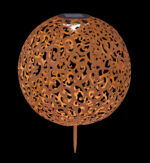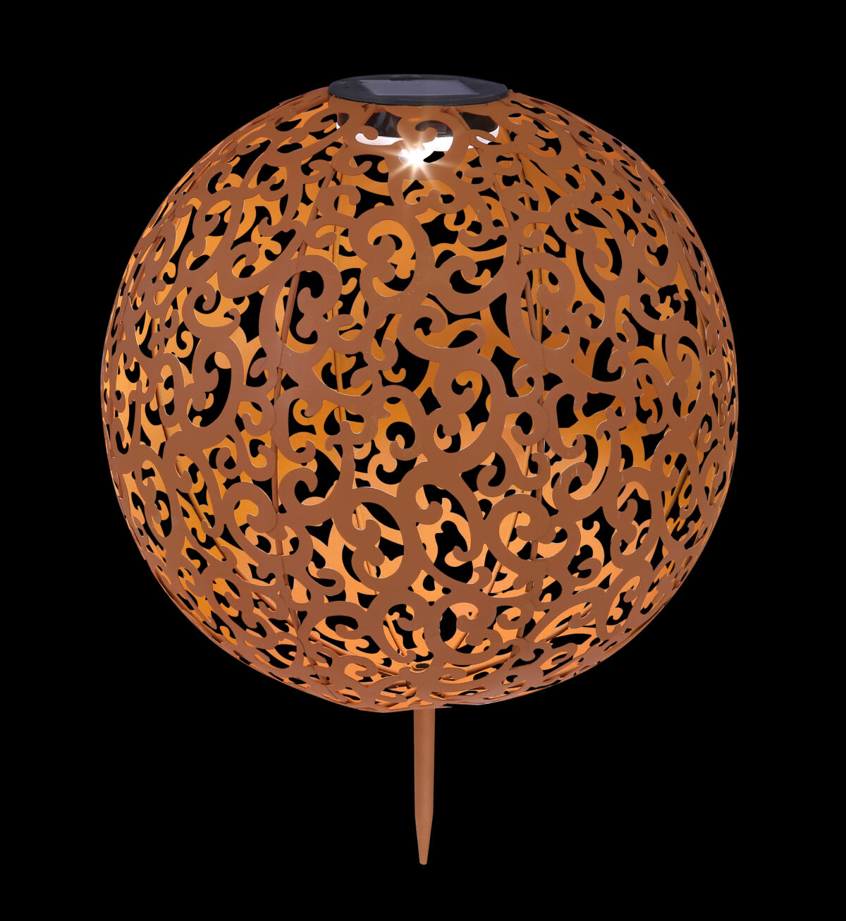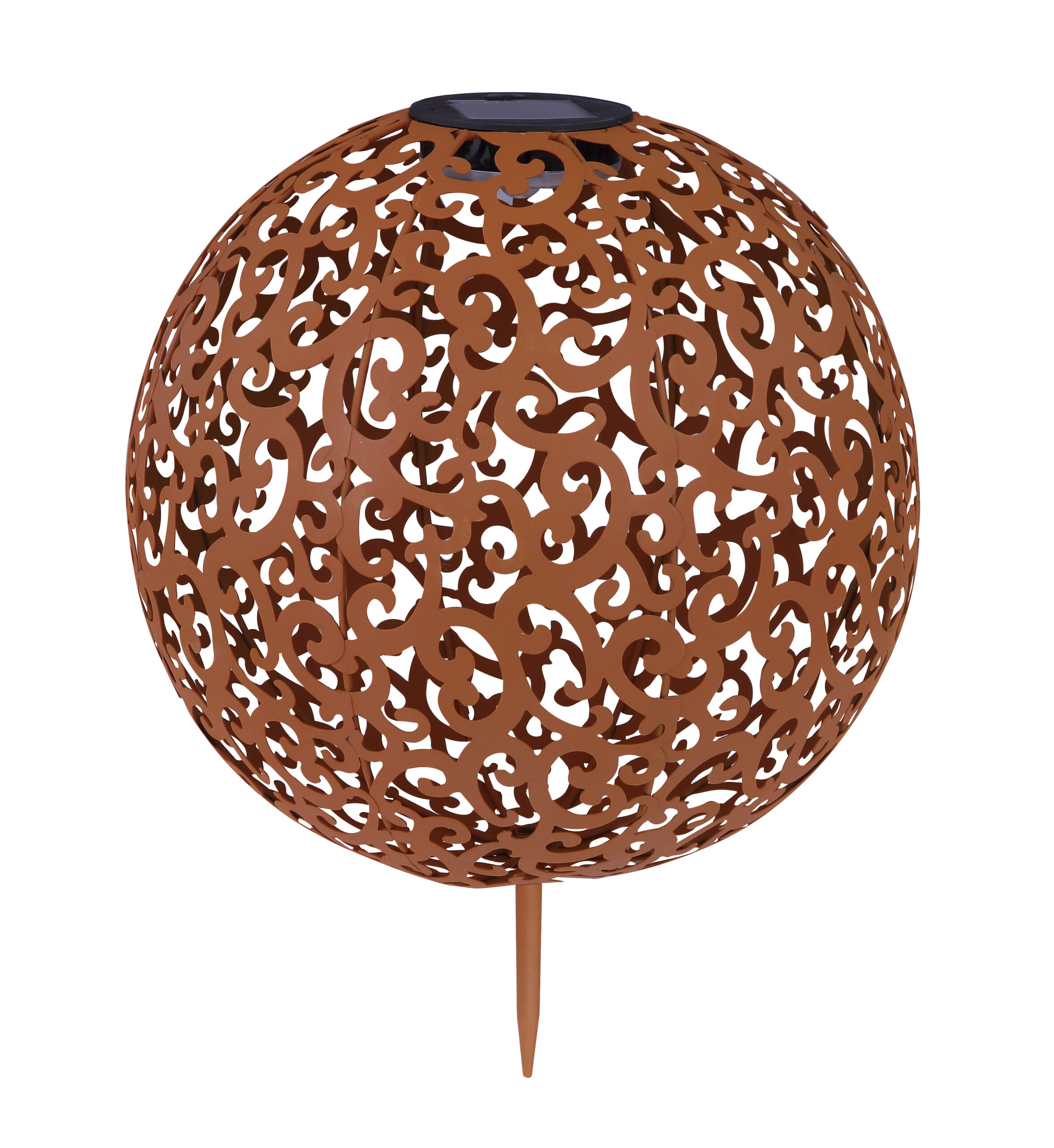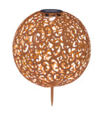 Ova metalna solarna lampa u boji rđe, visoka 40 cm, obogaćuje vaš vrt svojim starinskim dizajnom. Prekrasna lopta (Ø 28,5 cm) sa utisnutim uzorkom čini da svjetlost vanjske lampe djeluje posebno efektno. Lampa sija ugodno toplim 3000 Kelvina do 8 sati zahvaljujući integriranoj bateriji. Zahvaljujući IP44, ovo LED solarno svjetlo je idealno za upotrebu na otvorenom.