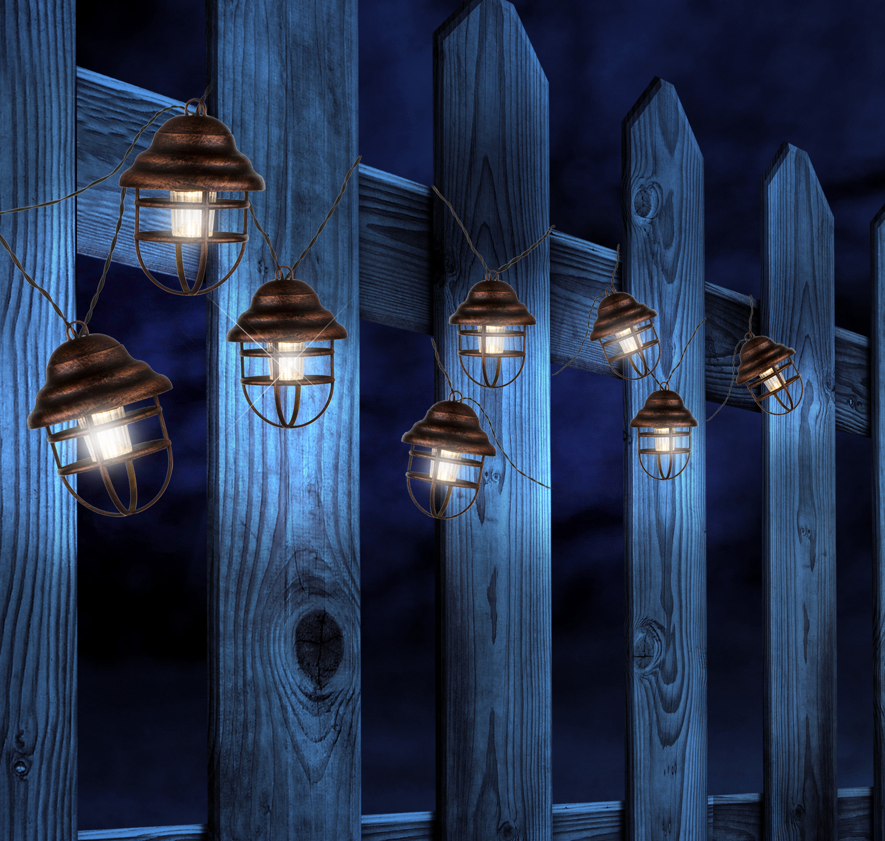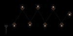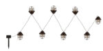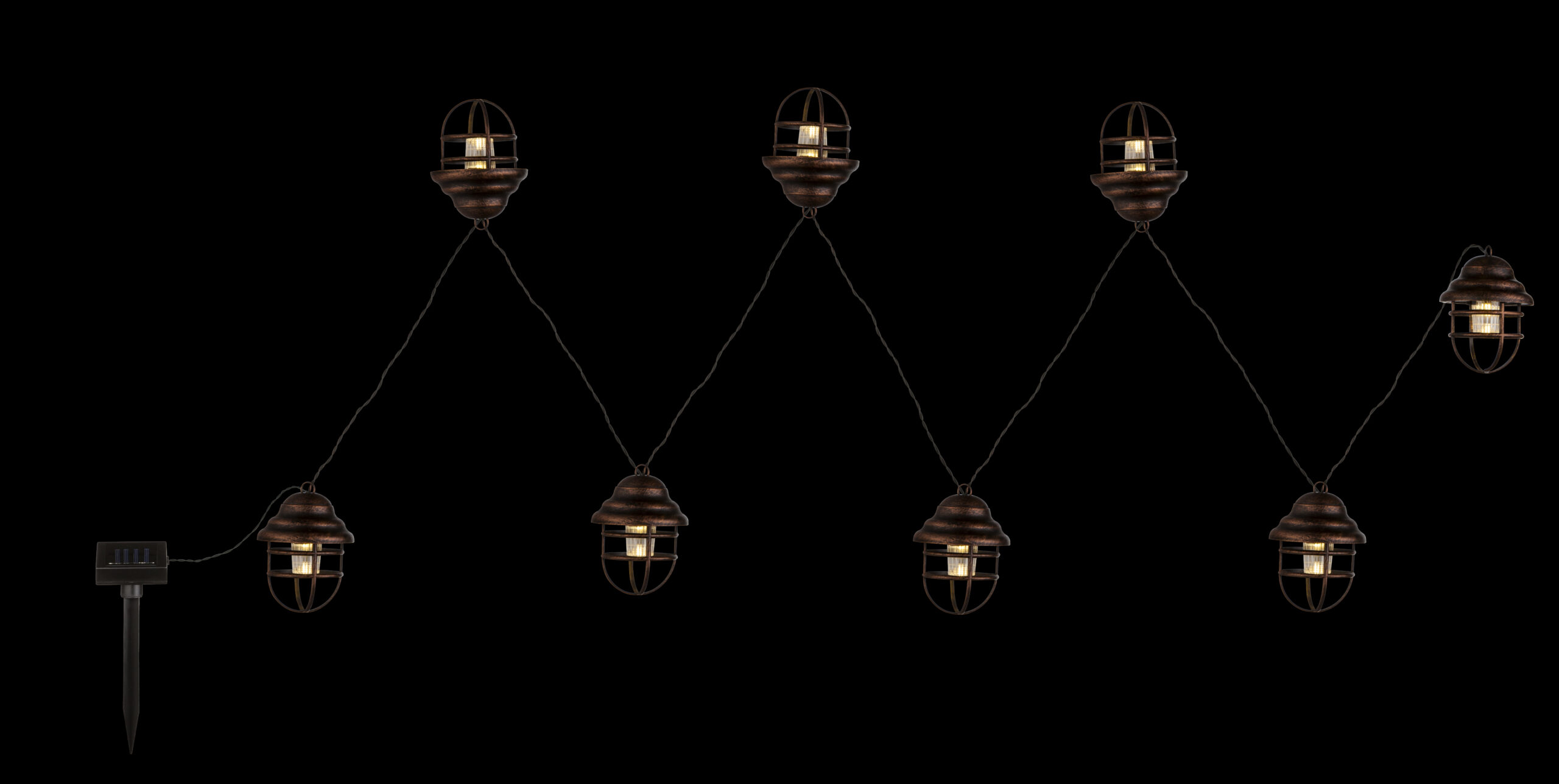 Ovaj solarni svjetlosni lanac sastoji se od osam crnih plastičnih lampiona. Oni su postavljeni u intervalima od 10 cm na lancu, a odvojeni solarni panel daje potrebnu energiju za oko osam sati svjetlosti. Navedeni IP44 stepen zaštite čini ih apsolutno pogodnim za upotrebu na otvorenom.