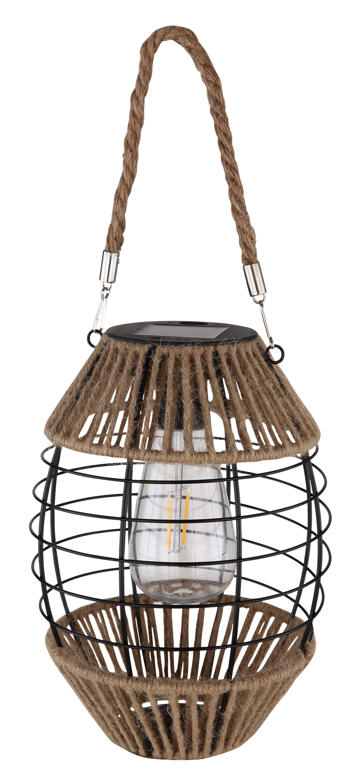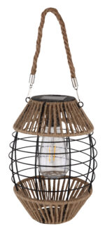 Ova solarna lampa ima crnu mat metalnu osnovu, okvir od nehrđajućeg čelika, crni plastični poklopac ukrašen konopljom u prirodnoj boji i prozirnu plastičnu ploču za ugodnu distribuciju svjetlosti. Lampa ima prekidač pritiska i punjivu bateriju (AA 600mAh 1.2V) koja je uključena. Lampa ima IP44 klasu zaštite i može se postaviti ili okačiti. Dimenzije su ø165mm i H405mm. Svetiljka ima integrisanu LED sa 2W i naponom od 3V, koja obezbeđuje toplo belo svetlo na temperaturi od 3000K. Svetiljka se puni pomoću solarnih panela i može da skladišti energiju tokom dana da bi osvetlila noću kada je to potrebno.
