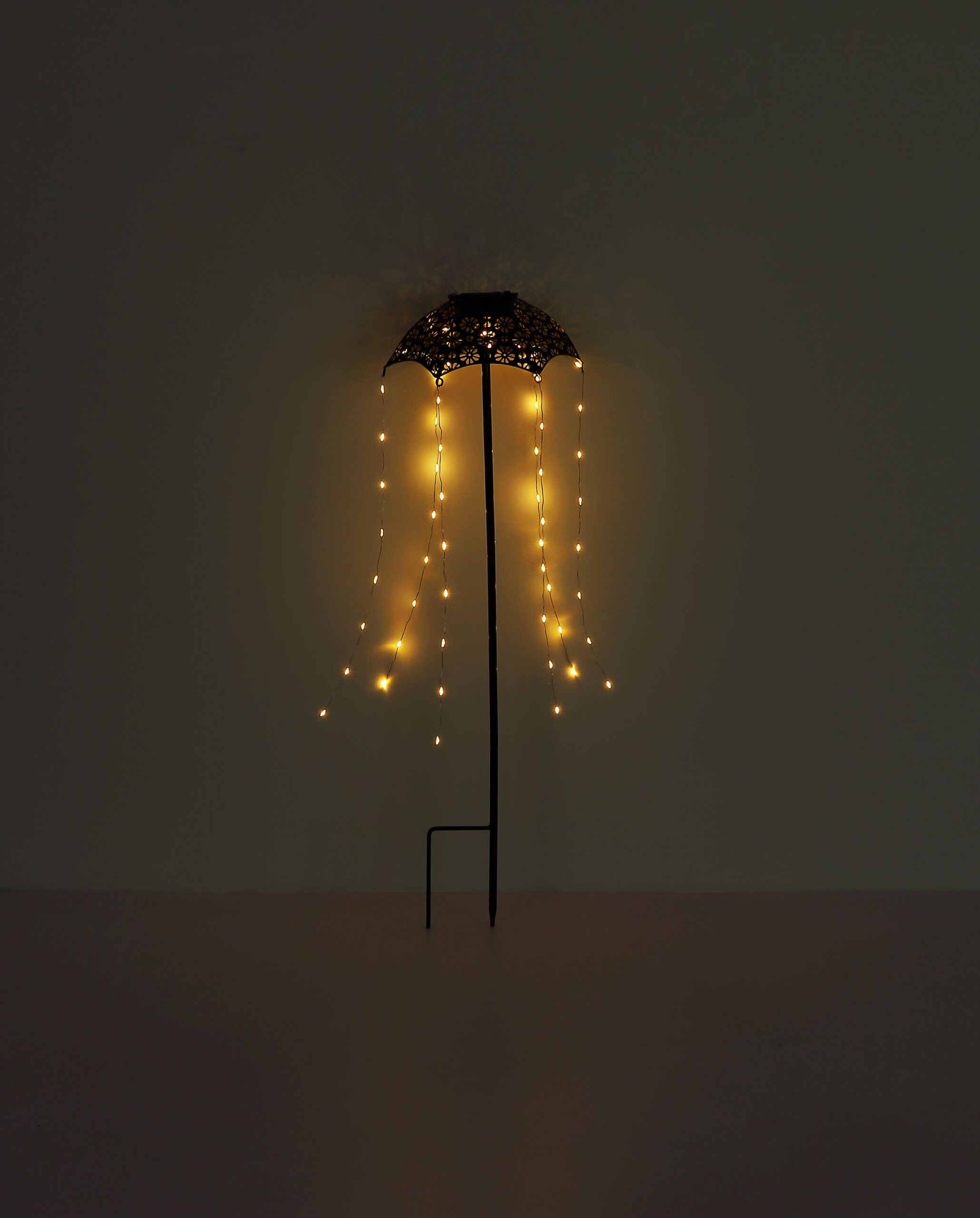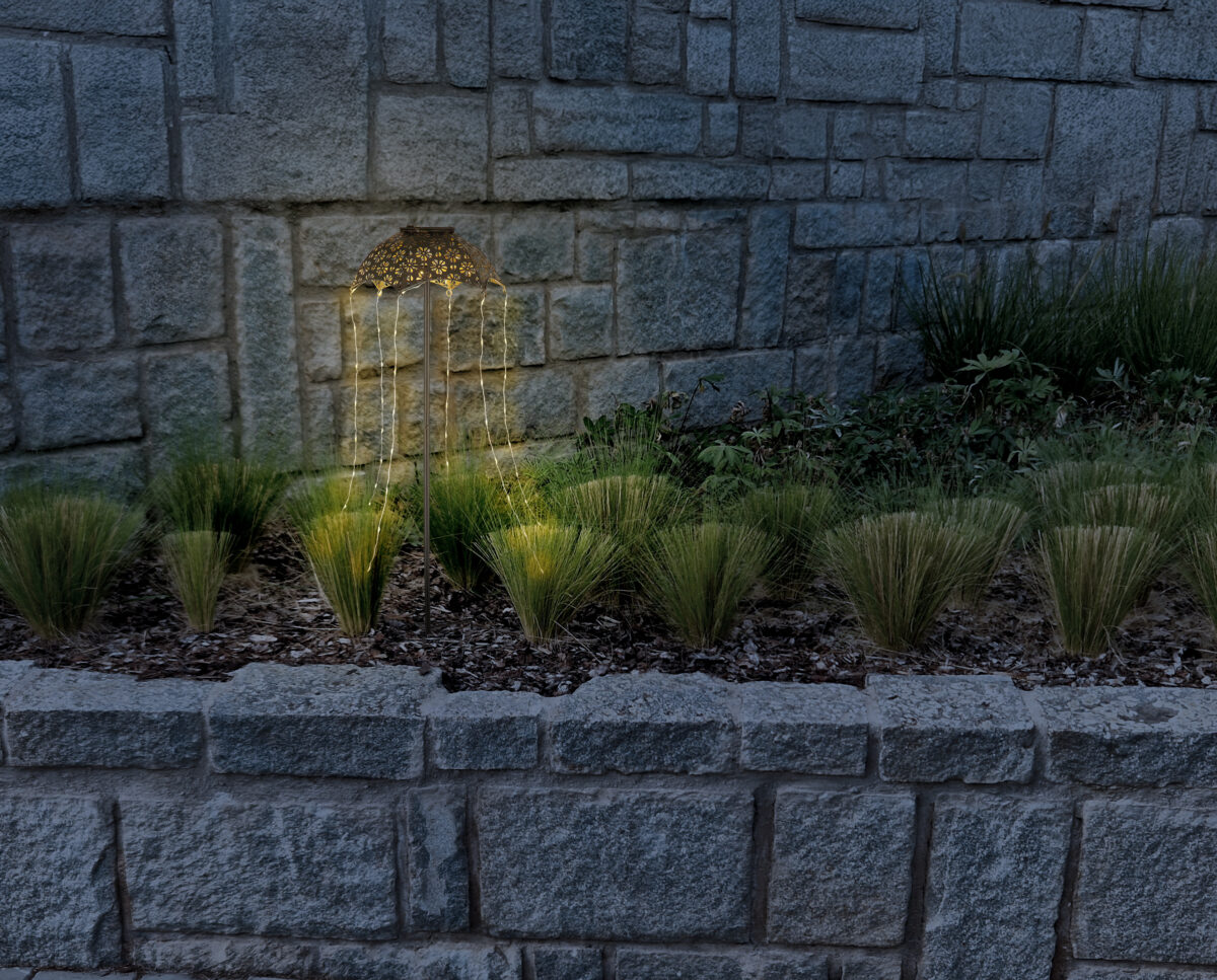 SOLAR LIGHT METAL BLACK MATT sa dizajnom kišobrana upečatljiv je dodatak vašem vanjskom prostoru. Crno i bakreno metalno kućište i prozirna plastična sjenila pružaju elegantan izgled. Sa 60 LED dioda, svetiljka pruža pouzdano osvetljenje i idealna je za bašte i staze. Stepen IP44 osigurava da svjetiljka može izdržati sve vremenske uvjete. Moderan i praktičan izbor za vaš vanjski prostor.