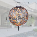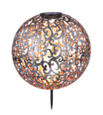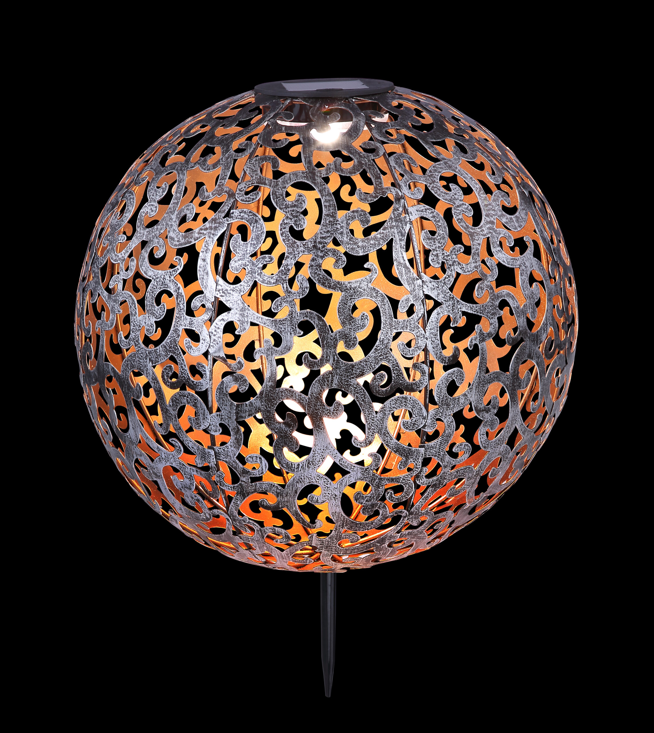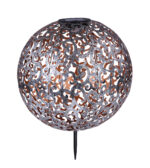 Ova metalna solarna lampa srebrne boje visine 40 cm obogaćuje vaš vrt svojim starinskim dizajnom. Prekrasna lopta (Ø 28,5 cm) sa izbušenim uzorkom čini svjetlo posebno efektnim. Lampa sija s ugodno toplim 3000 Kelvina zahvaljujući integriranoj bateriji do 8 sati. Zahvaljujući IP44, ova solarna svetiljka je idealna za spoljašnju upotrebu.