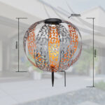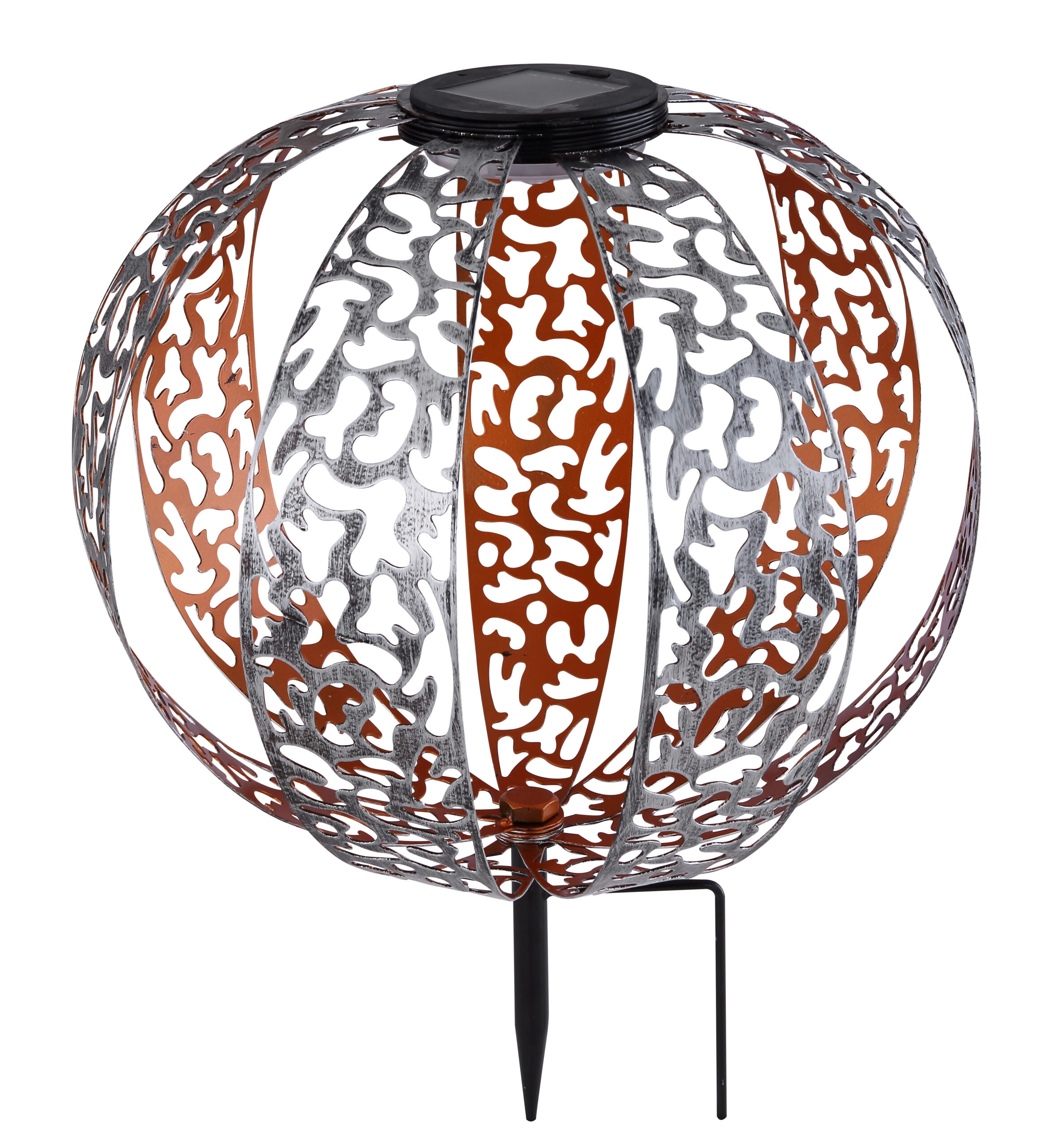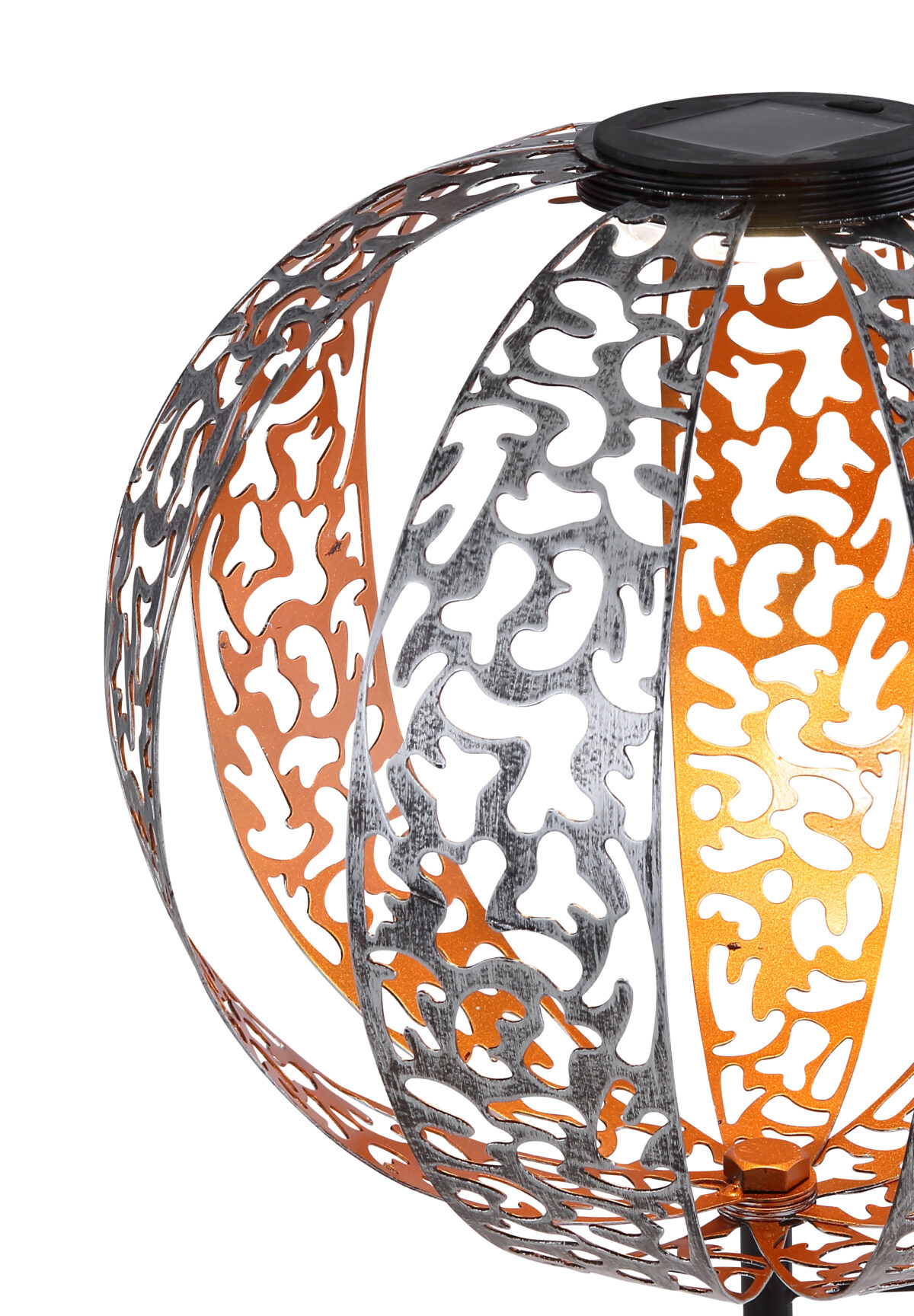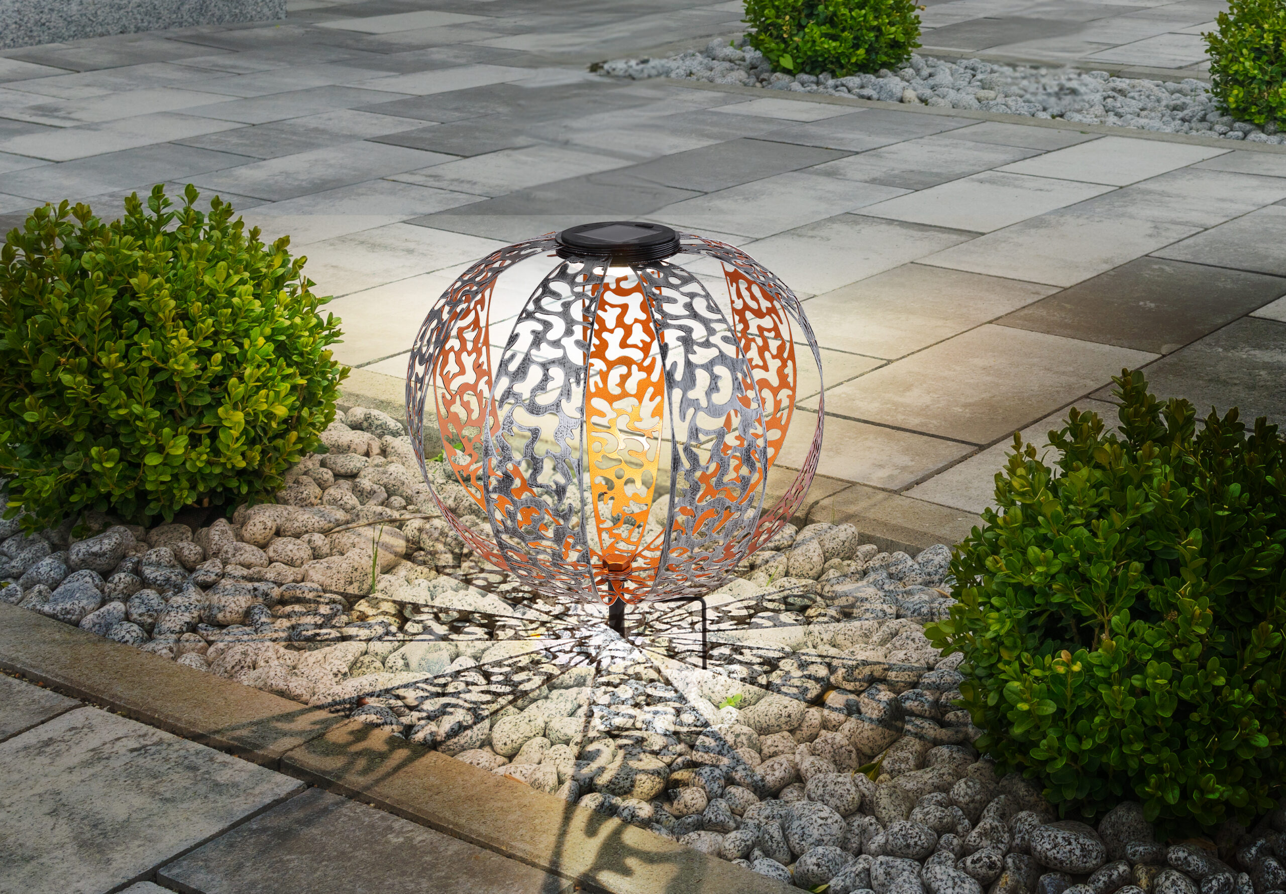 Ova okrugla solarna lampa (ø30 cm) sa klasom zaštite IP44 je atmosferski dodatak vašem vrtu. Vrh zemlje omogućava fleksibilno i nekomplikovano postavljanje srebrne solarne svjetlosti u meko tlo. Kroz unutrašnje zlatno zatamnjene bočne panele, na pod se projektuje stilski uzorak, koji zajedno sa toplom belom svetlošću (3000 Kelvina) LED sijalice na solarni pogon može doprineti predivnom ambijentu u vašem otvorenom prostoru.