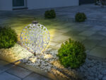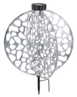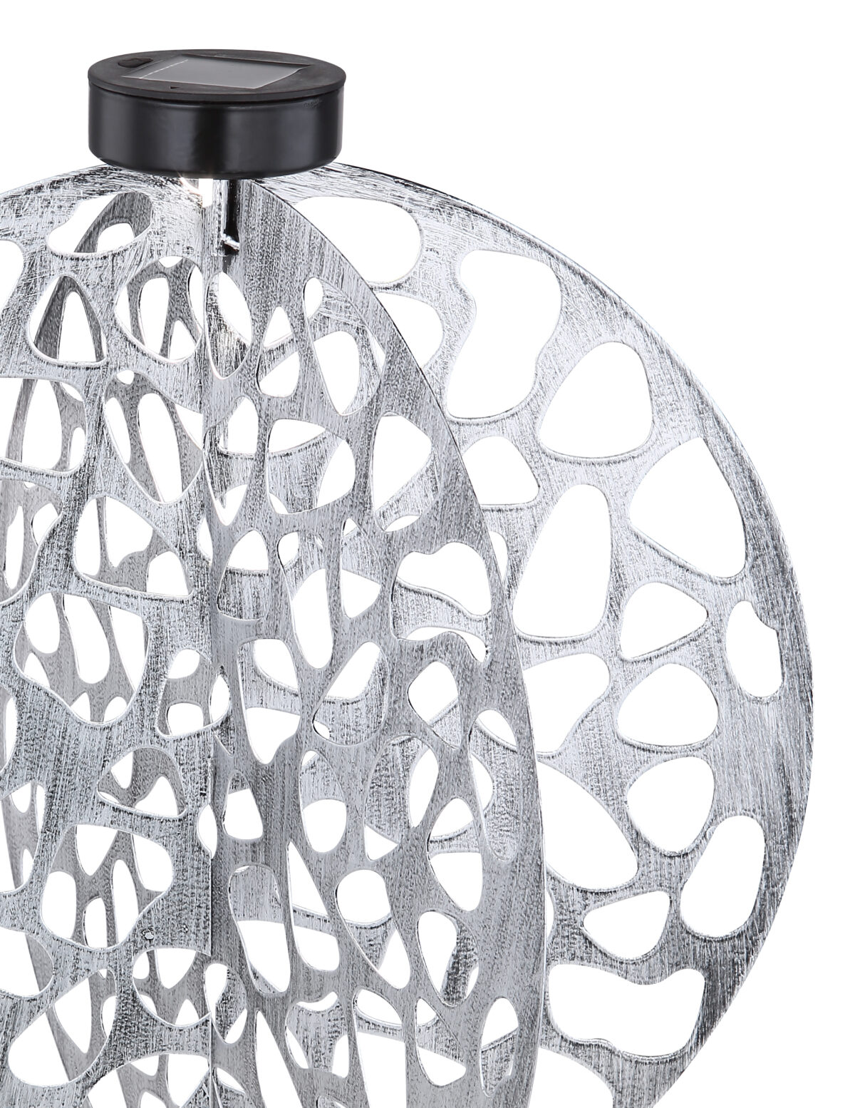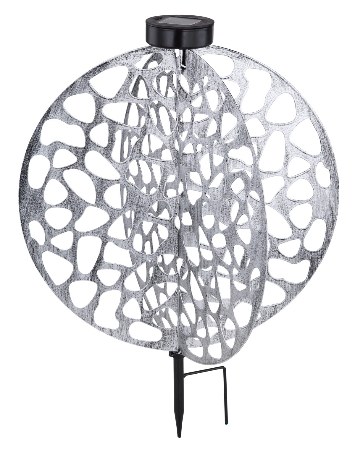 Ova solarna lampa od srebrnog metala (klasa zaštite IP44) je prekrasan dodatak vašem vrtu. Uz pomoć zemljanih vrhova može se lako i fleksibilno postaviti u meko tlo. Ugodno toplo bijelo svjetlo (3000 Kelvina) LED sijalice na solarni pogon sija odozgo na elegantnom uzorku u dvije ortogonalno zakačene metalne ploče (ø 40 cm svaka) i tako doprinosi atmosferskom ambijentu u vašem vanjskom prostoru.