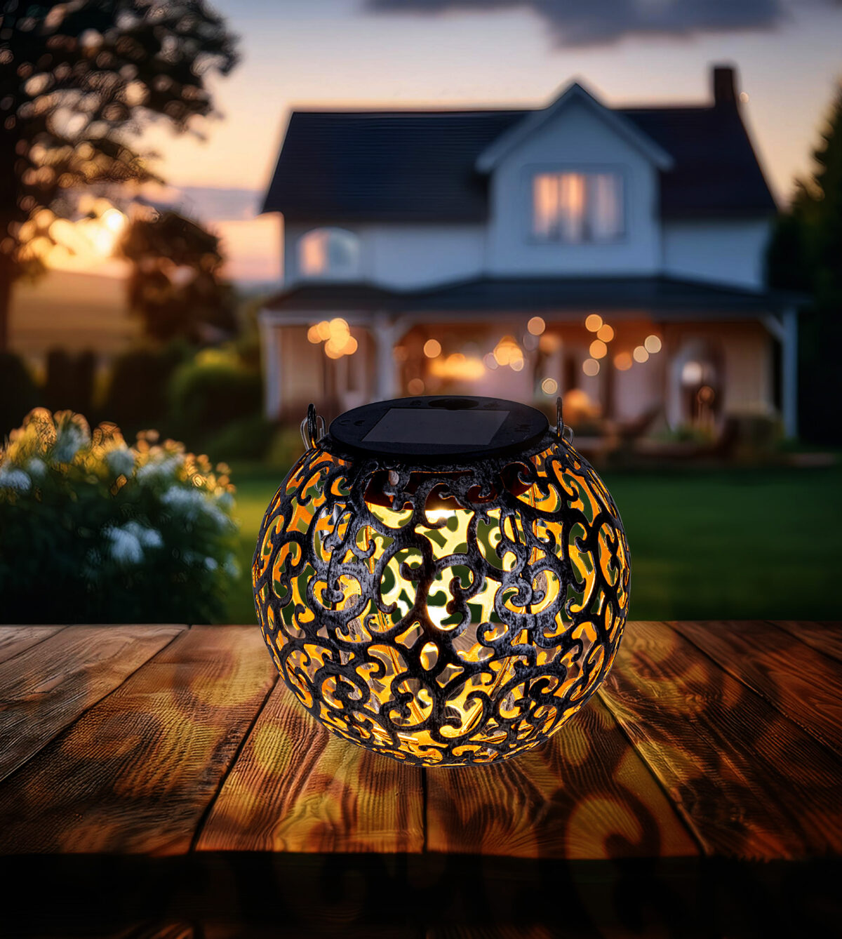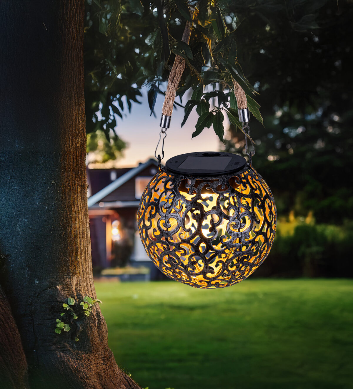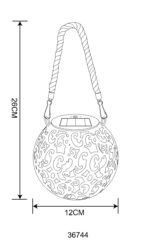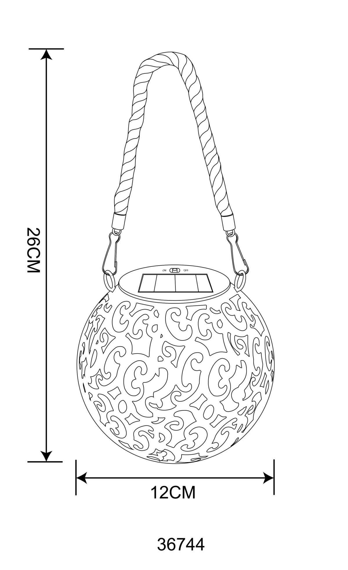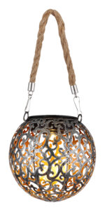 Solarna svjetlost u starinskom srebrno-sivom i metalu bakrene boje, s crnom plastikom i omotačem od konoplje, atraktivan je i ekološki dodatak svakom vanjskom prostoru. Sa prekidačem pritiska i uključenom AAA baterijom, svjetlo je jednostavno za korištenje i nudi IP44 zaštitu od prskanja vode. Lampa se može okačiti ili postaviti i ima dimenzije ø 120mm x H 260mm. Integrirani LED sa 0,06W i 3000K pruža ugodno svjetlo u mraku.