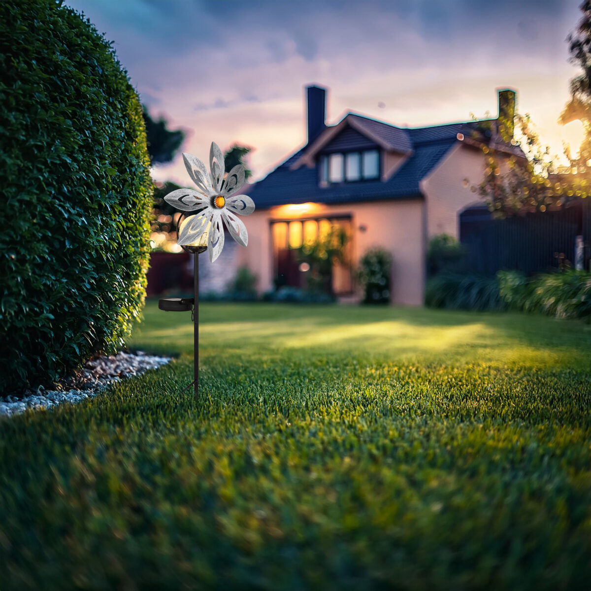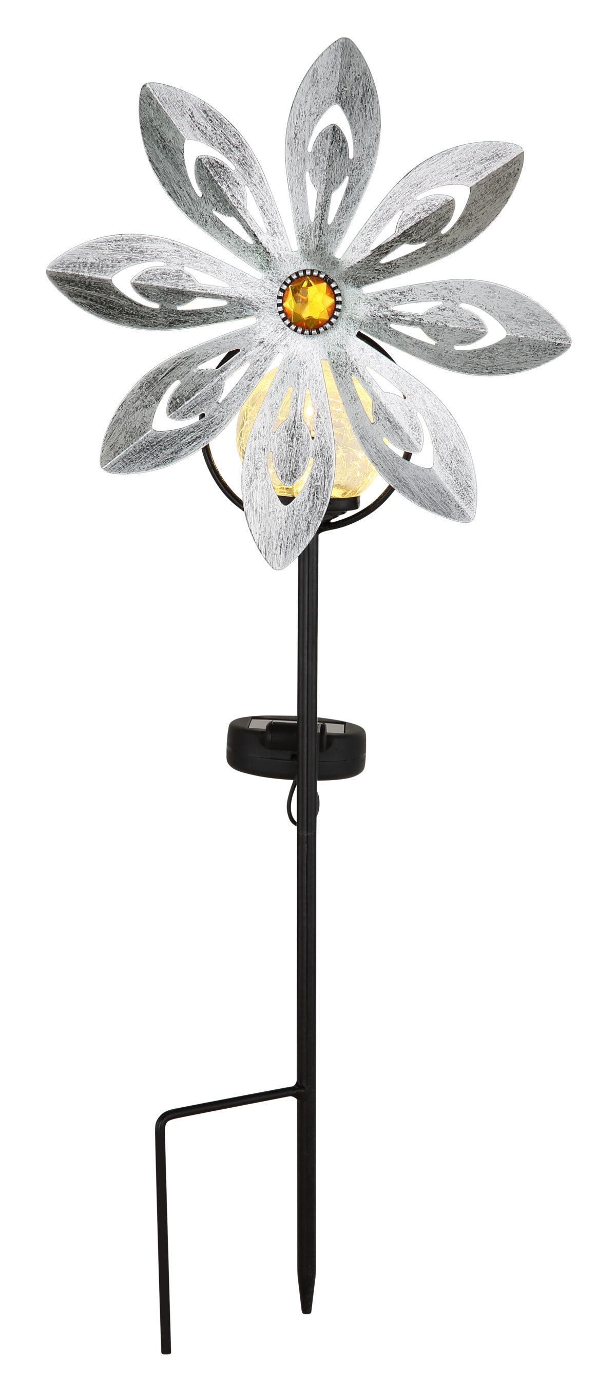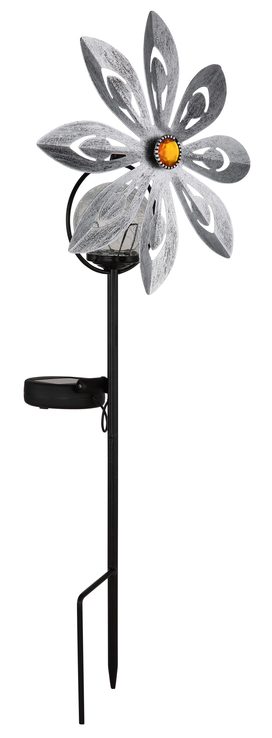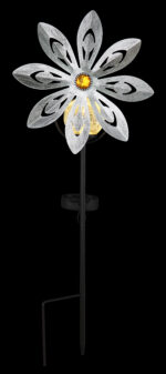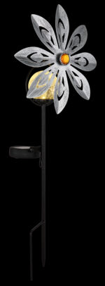 SOLAR LIGHT METAL SILVER GREY u dizajnu vjetroturbina daje vašem vrtu elegantan dodir. Srebrno-sivo metalno tijelo i prozirna staklena kuglasta sjenila sa žutim staklenim kristalima pružaju elegantno i jako osvjetljenje. Opremljeno svjetlosnom temperaturom od 3000K i presostatom, ovo solarno svjetlo nudi i dekorativnost i funkcionalnost. IP44 ocjena jamči da je otporan na vremenske uvjete i da se može pouzdano koristiti na otvorenom.