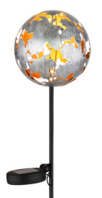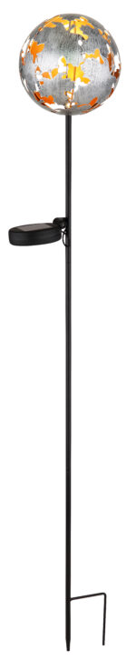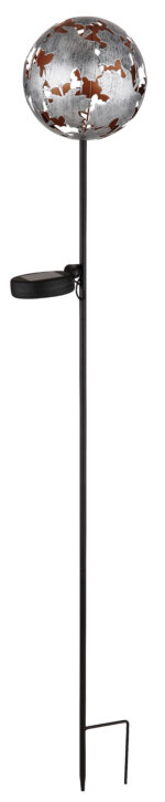 SOLARNA LAMPA METAL SREBRNO SIVA u sfernom obliku sa javorovim lišćem je elegantno rješenje za rasvjetu za vaš vrt. Srebrno-sivo metalno kućište i prekidač na dugme pružaju moderan dizajn. Sa svetlosnom temperaturom od 3000 K, svetiljka obezbeđuje toplo svetlo. Stepen IP44 garantuje da je ova solarna lampa otporna na vremenske uslove i da pouzdano radi u različitim vremenskim uslovima. Idealno za elegantnu i funkcionalnu vrtnu rasvjetu.