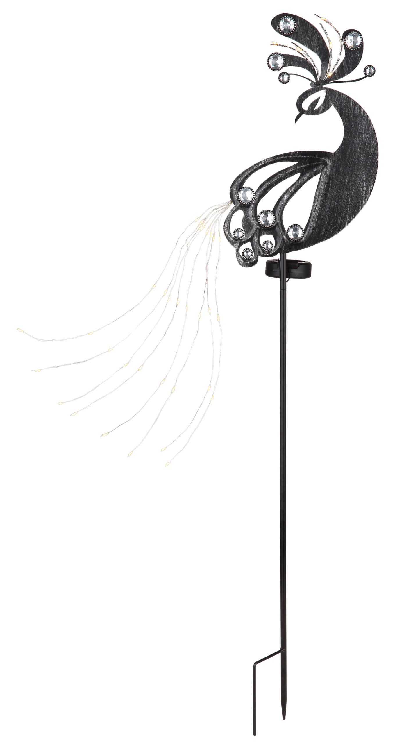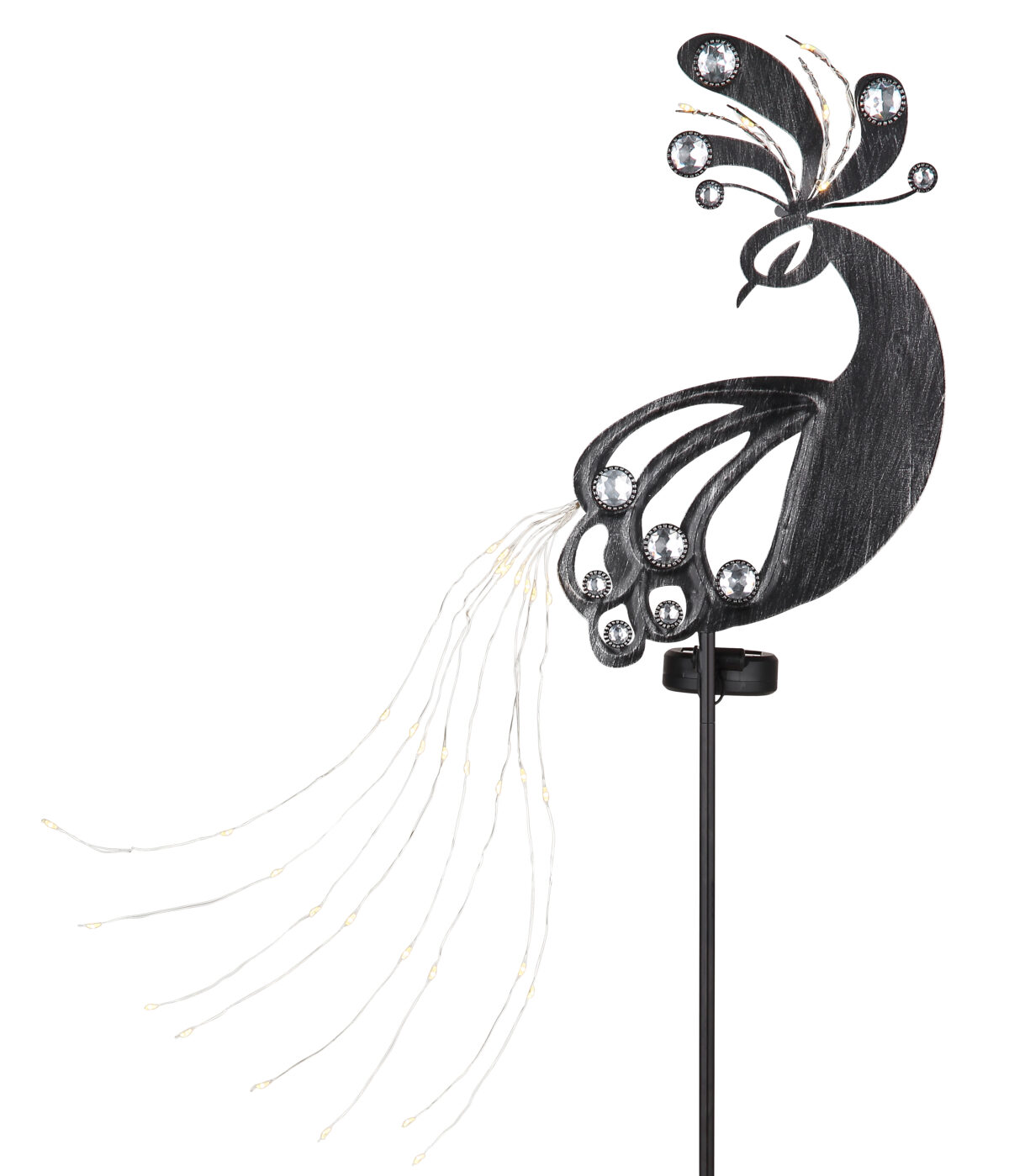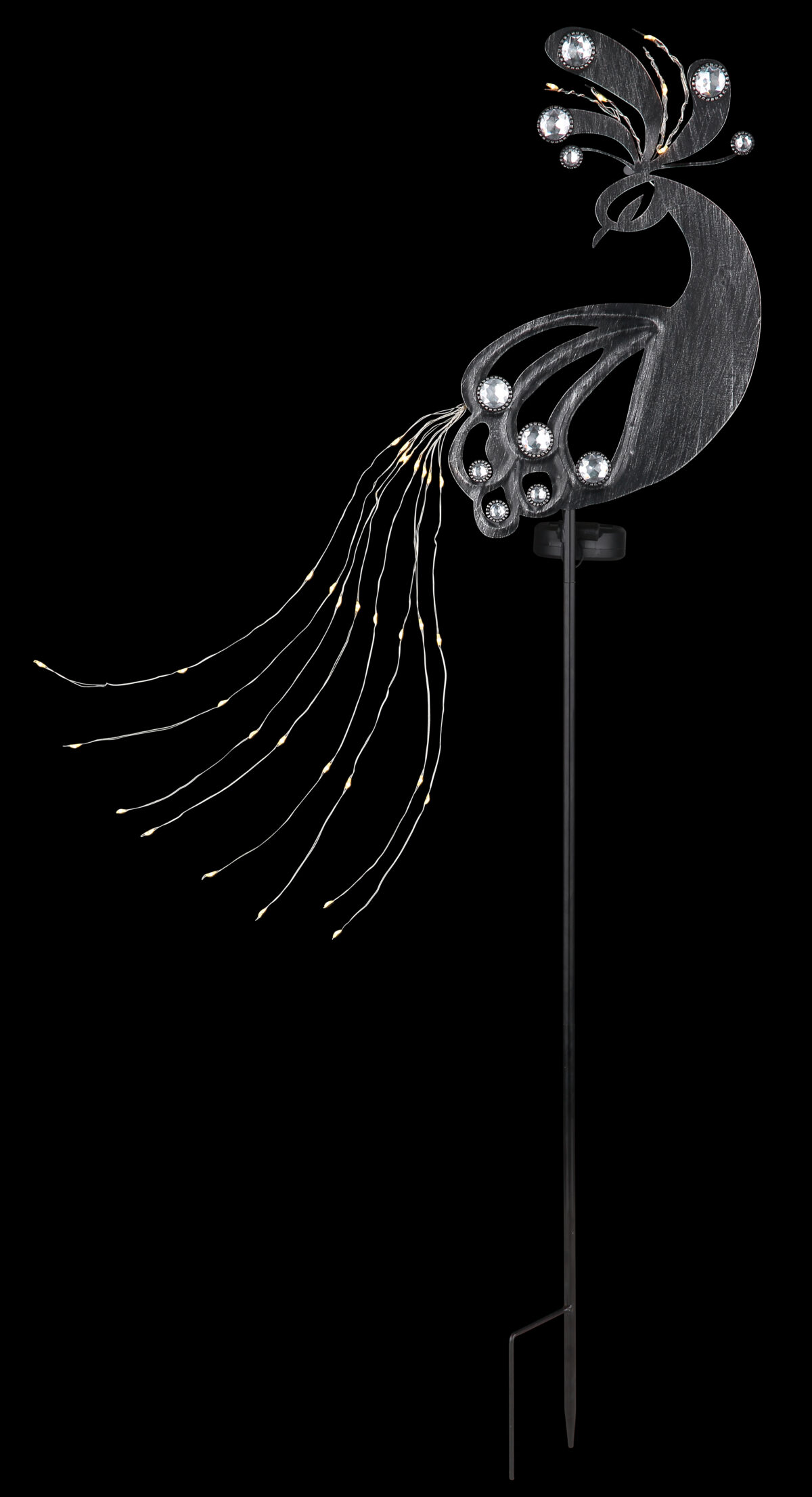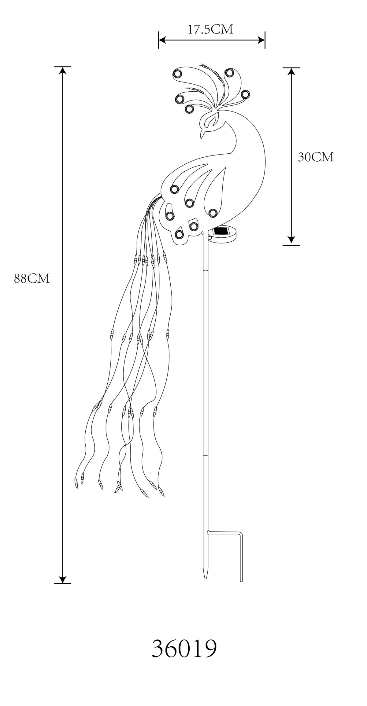 Ova prekrasna solarna lampa izrađena od metala u srebrno-sivoj antiknoj boji je prava privlačnost za oči u svakoj bašti. S baterijom koja uključuje AAA 300mAh 1,2V i prekidačem pritiska, svjetlo je jednostavno za korištenje i ima IP44 certifikat za upotrebu na otvorenom. Lampa je dimenzija DxŠxV: 175x45x880mm, a visina pauna je 30 cm. Sa ukupno 39 LED lampi od 0,06W 3,2V svaka i toplom bijelom temperaturom boje od 3000K, lampa stvara ugodnu atmosferu na otvorenom.