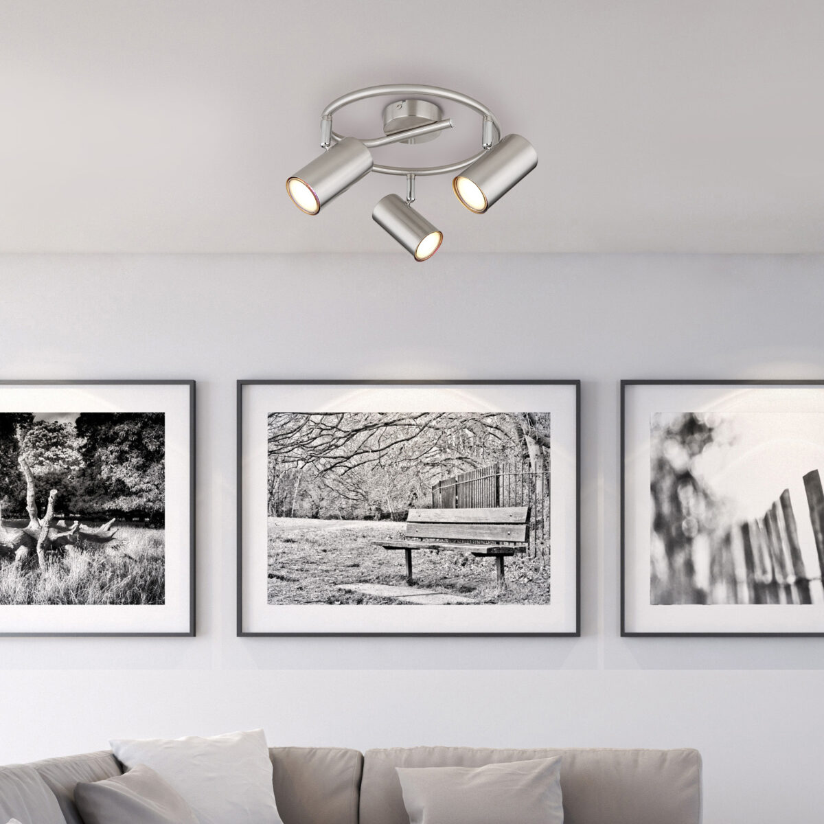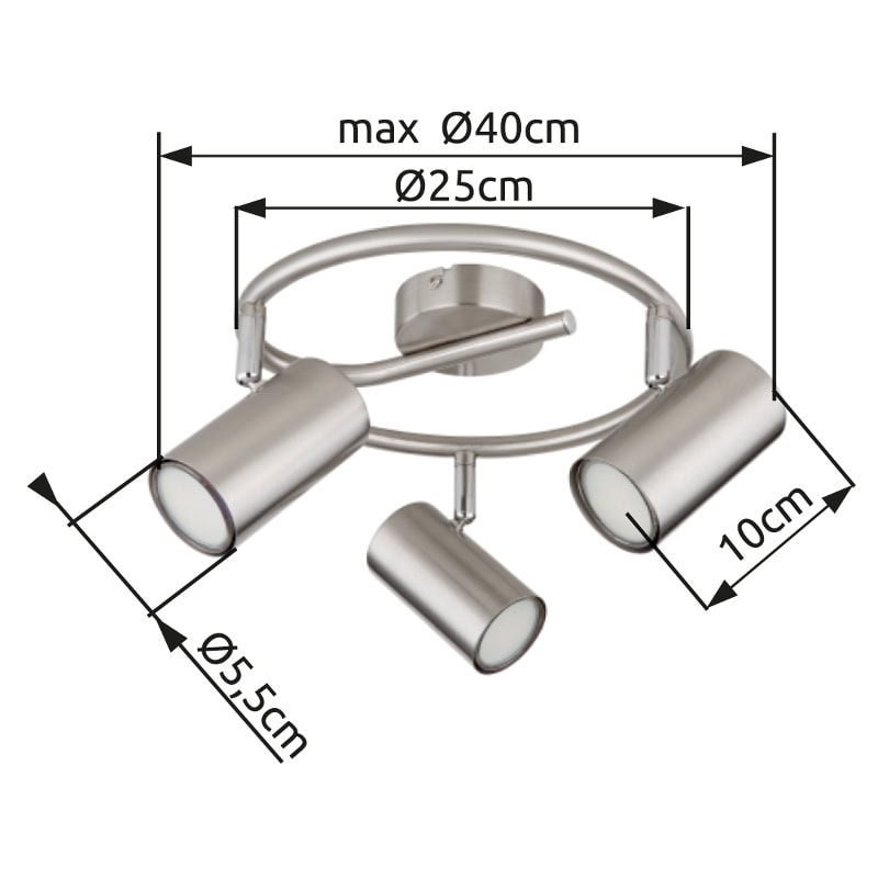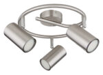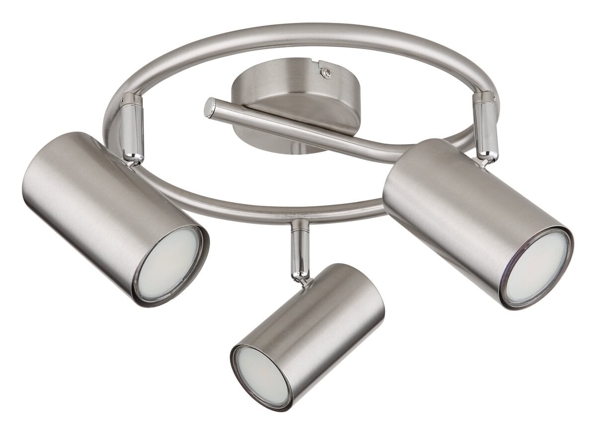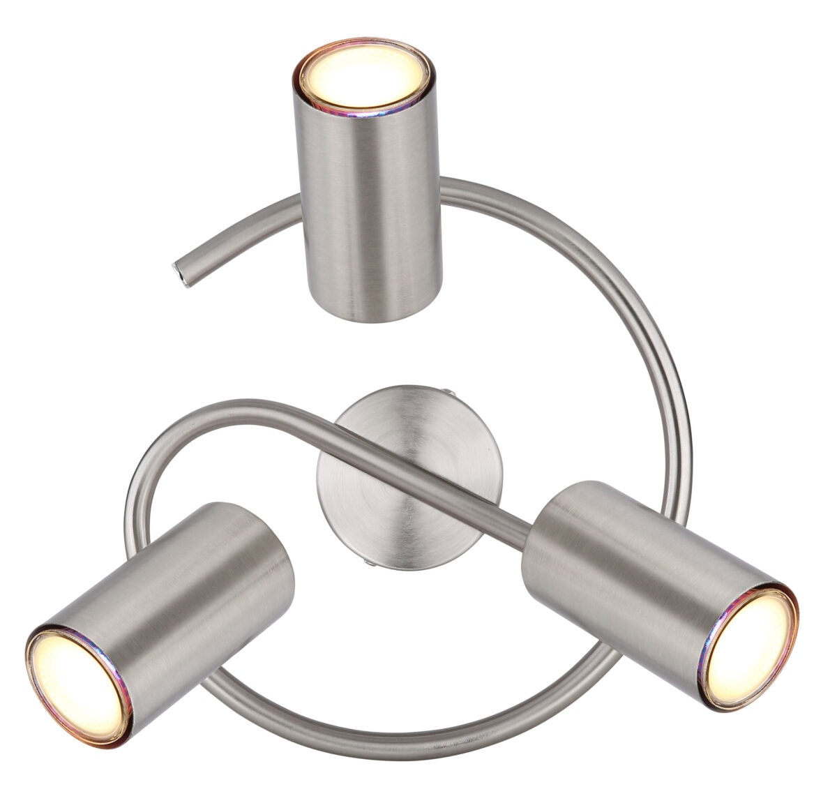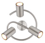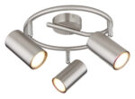Ovaj jednostavan reflektor inspirira sjajnim dizajnom. Zakrivljena metalna šipka promjera 25 cm vodi od kromiranog okruglog stropnog tijela. Postoje tri rotirajuća zgloba, svaki sa GU10 nastavkom. Oni vam daju maksimalnu snagu od 25 vati da sami odredite boju svjetla i svjetlinu. Zbog dugovečnosti i uštede energije preporučujemo LED sijalice.