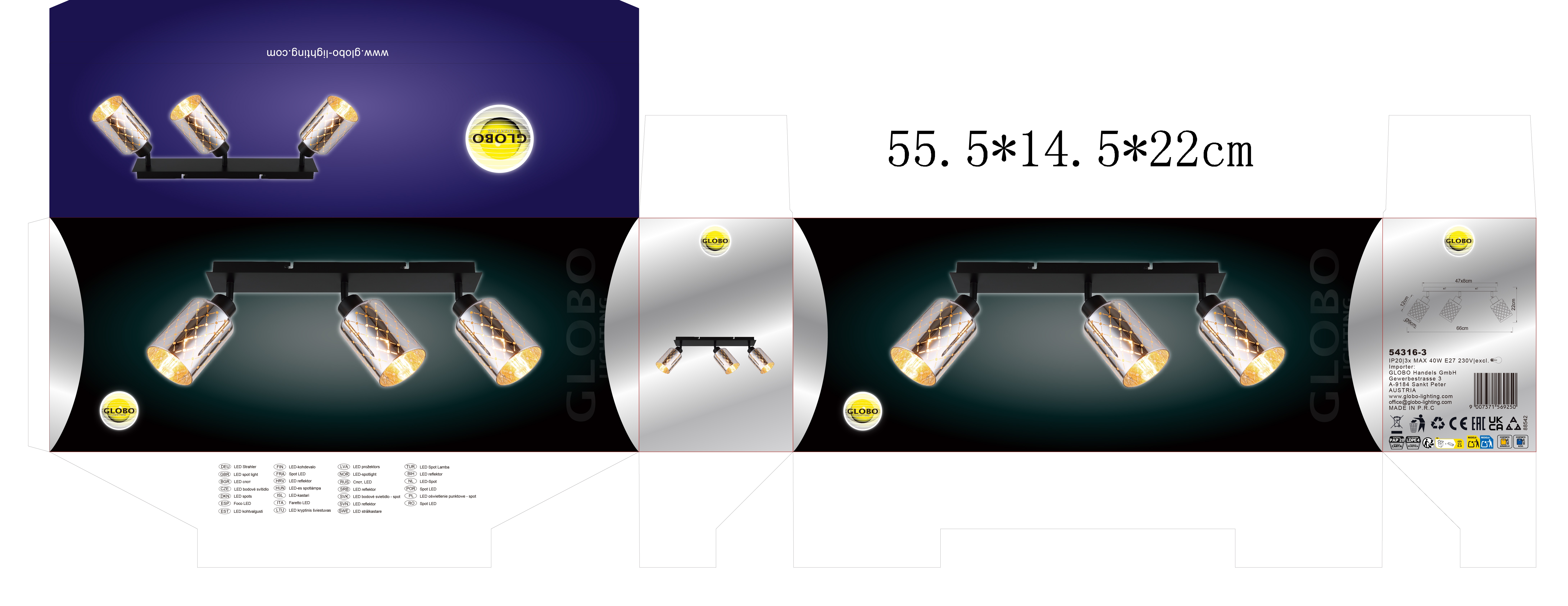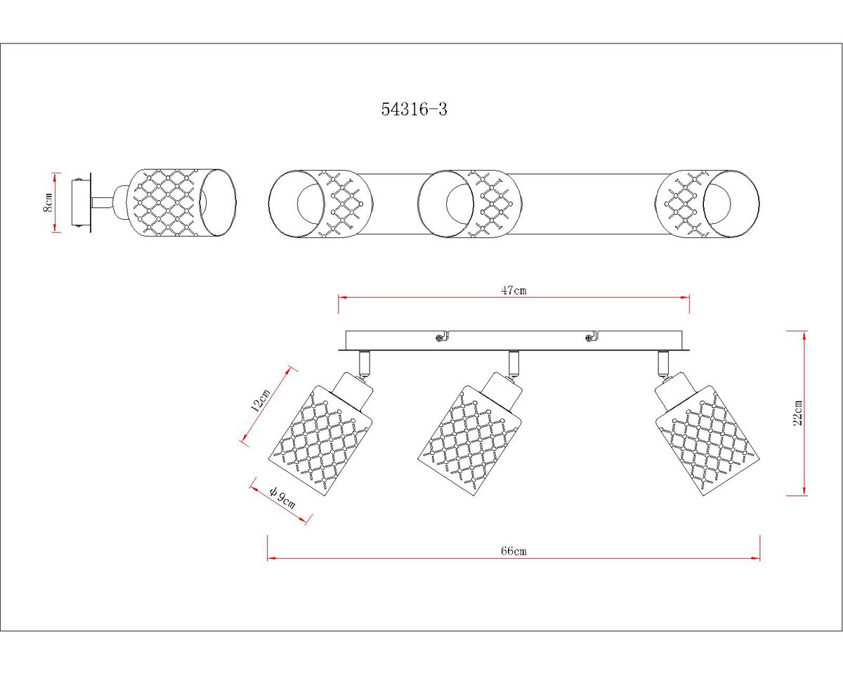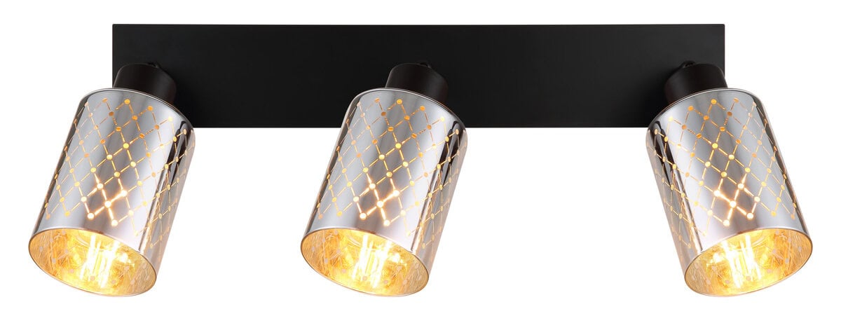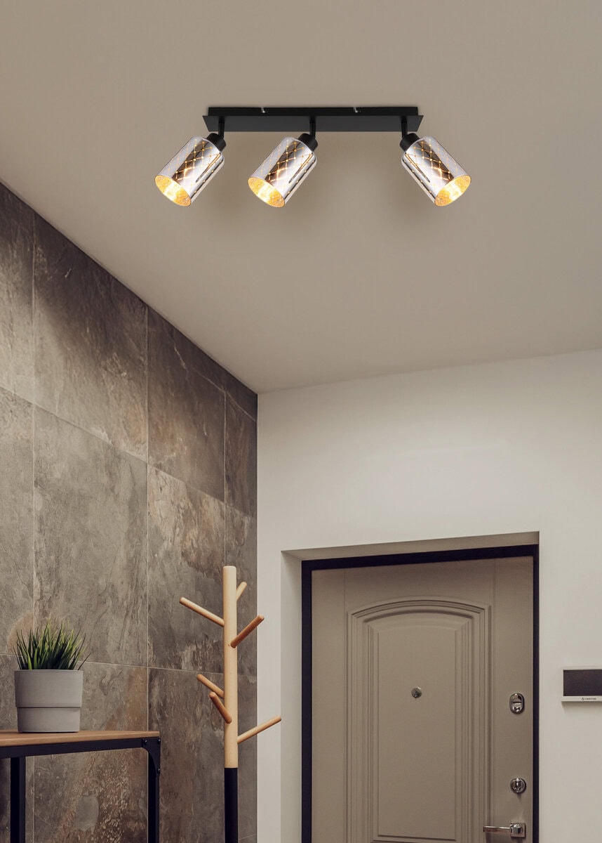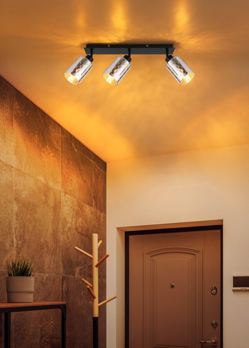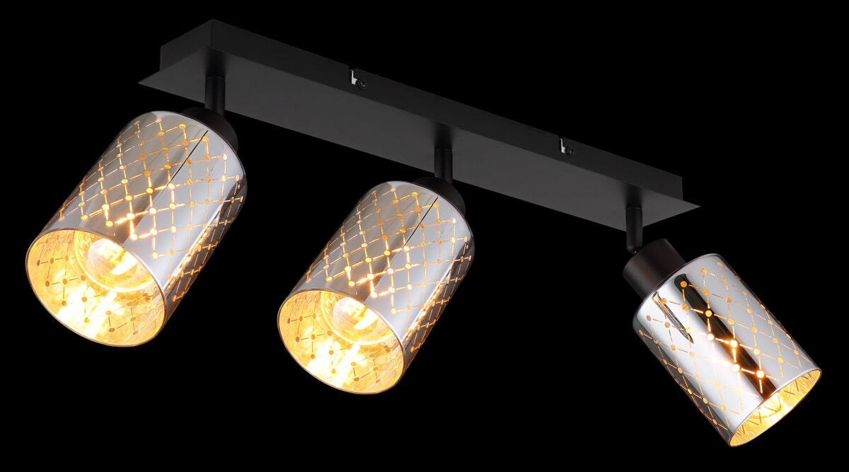 ALONSO METAL BLACK MATT reflektor kombinuje moderan dizajn sa dekorativnom elegancijom. Tri cilindrična sjenila od prozirnog, hromiranog stakla pričvršćena su na pravougaoni nosač dimenzija 470 x 90 mm, koji pružaju posebnu igru svjetla zahvaljujući finom dekorativnom štancanju. Kućište izrađeno od mat crnog metala čini moderan kontrast sjajnom staklu i daje reflektorima elegantan, ali moderan izgled. Bilo u hodniku, dnevnom boravku ili iznad ogledala – ovaj reflektor postavlja ciljane svjetlosne akcente i donosi elegantnu atmosferu u svaku prostoriju. Zahvaljujući grlima E27 (osim sijalica), izvor svjetlosti se može individualno odabrati i prilagoditi vašim potrebama. ALONSO predstavlja uspješnu kombinaciju funkcionalnosti i dizajna – privlačan izgled koji kombinira moderan štih s daškom vintage. Idealno za sve koji cijene posebna svjetla sa karakterom i visokom kvalitetom izrade.