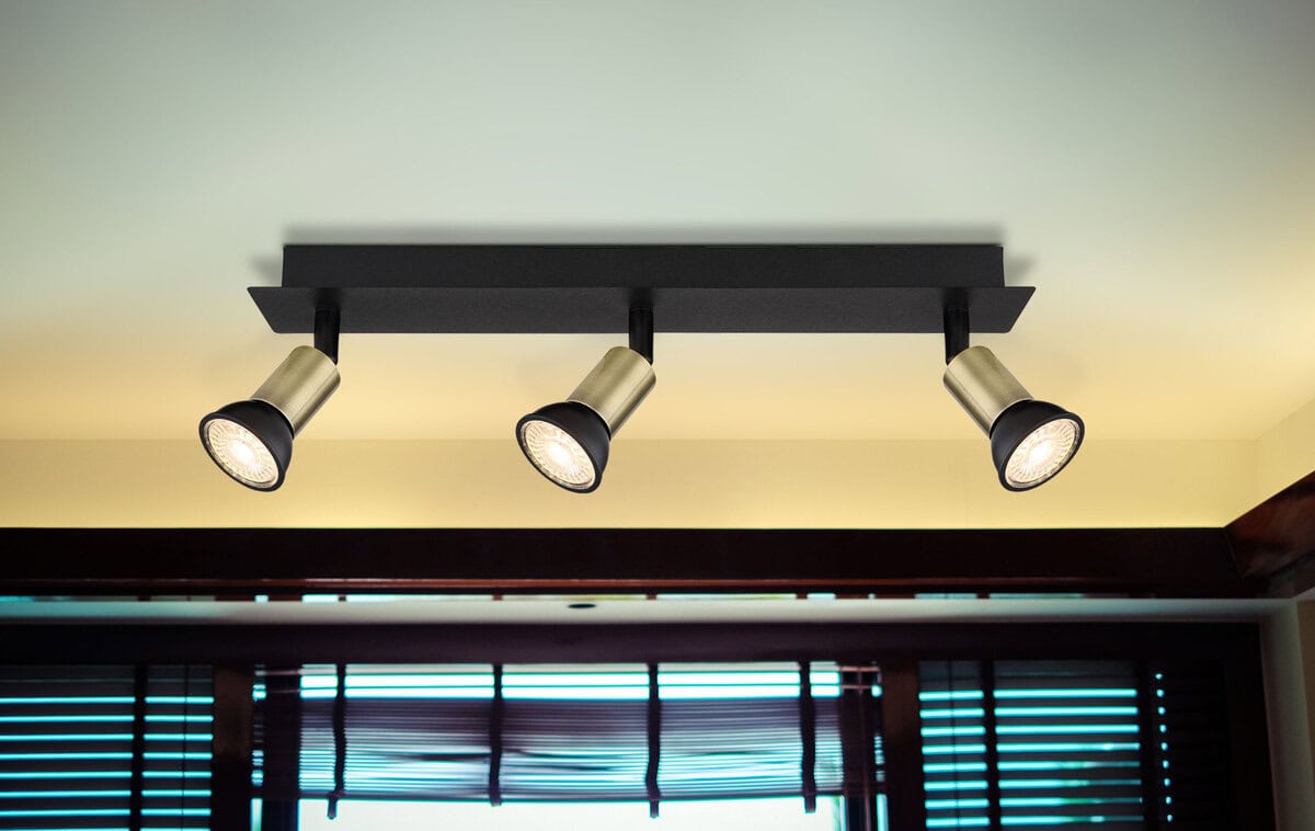 Ovaj jednostavan plafonski reflektor iz serije Drew impresionira svojim plemenitim dizajnom. Okretni reflektor od metala u crnoj i zlatnoj boji opremljen je sa tri GU10 utičnice i dužine je 40cm. Slobodnim odabirom izvora svjetlosti možete odrediti vlastitu boju i snagu svjetla do maksimalne snage od 35 vati. Zbog uštede energije i dugovečnosti preporučujemo LED lampe.