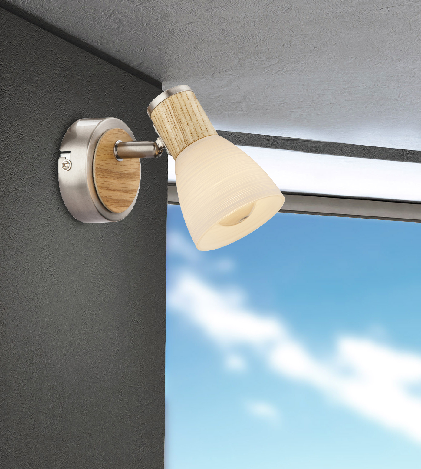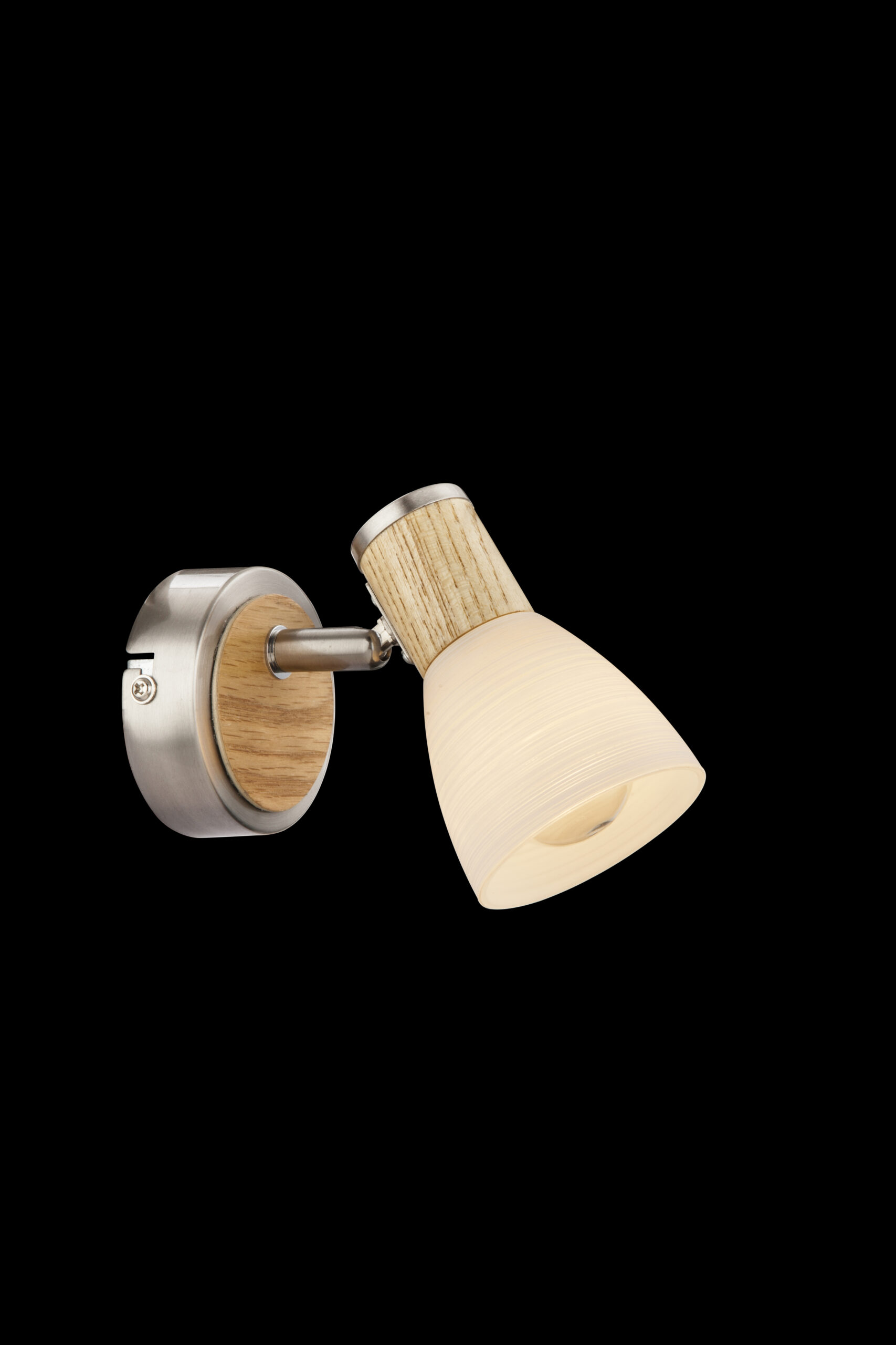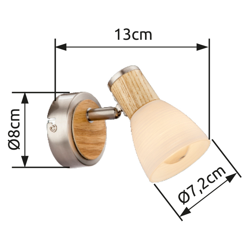 Gylfi serija se oslanja na plemeniti dizajn zajedno sa drvenim elementima. Na drvenoj ukrasnoj ploči nalazi se nikl mat reflektor s pričvršćenom sjenilom od prugastog opalnog stakla. Lampa je veličine 11 cm i preko E14 grla na vama je koju sijalicu (maks. 40W) želite koristiti. Zbog uštede energije i dugovečnosti preporučujemo LED lampe.