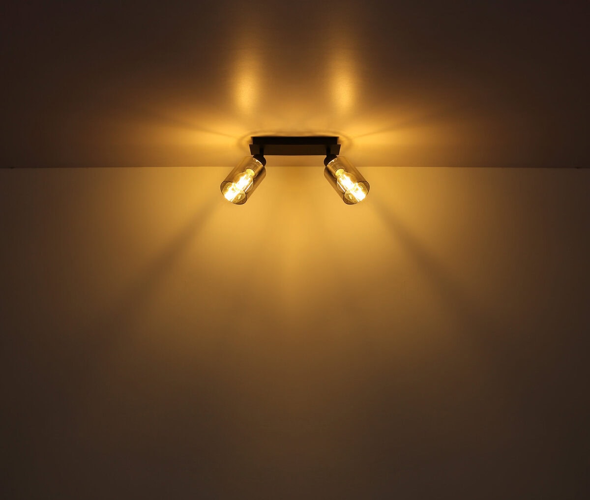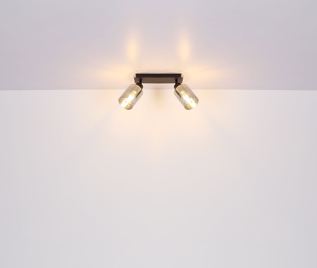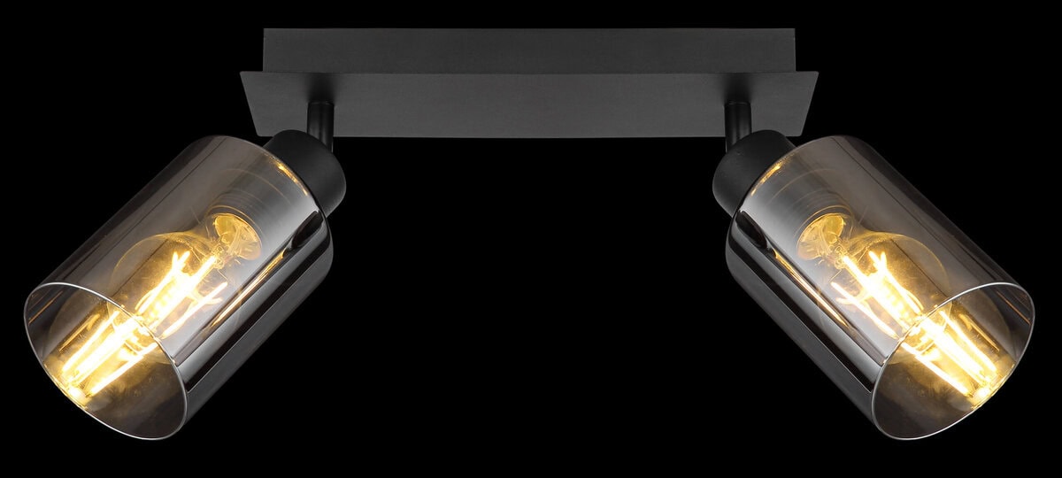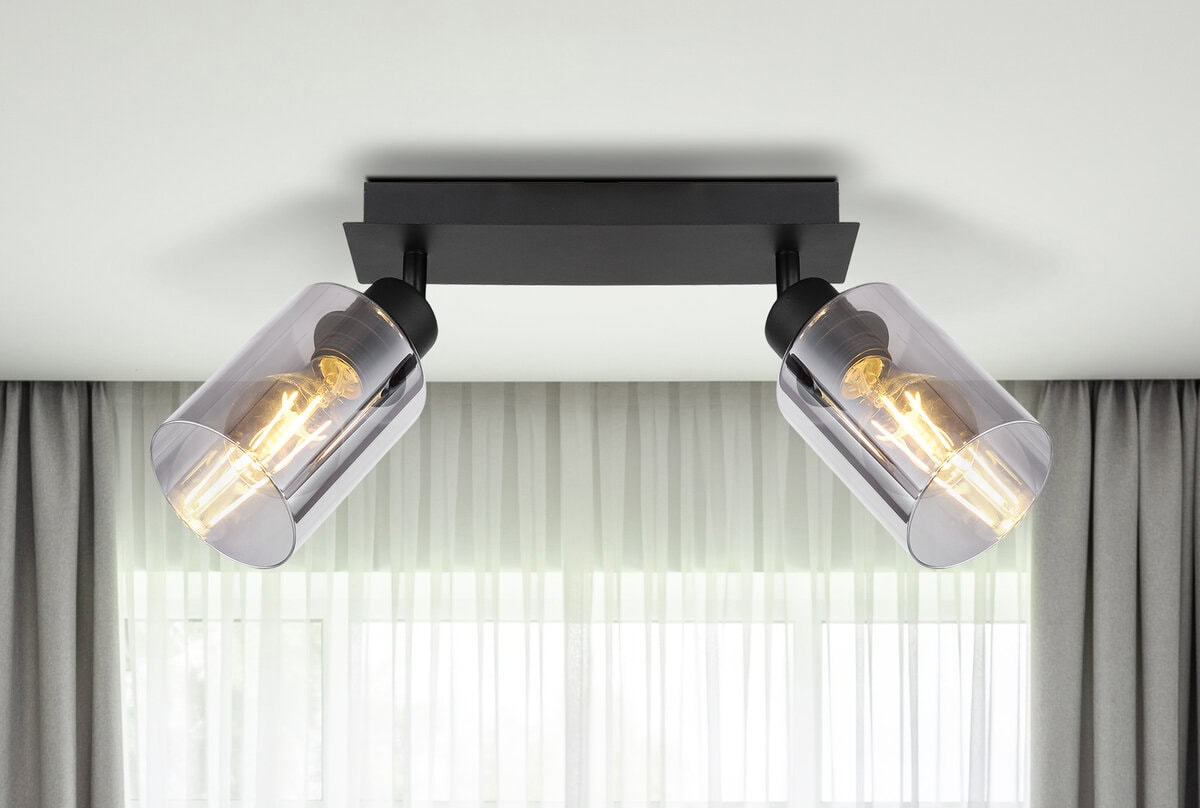 Ovaj prekrasni reflektor inspirira sjajnim dizajnom. Na uskom crnom mat metalnom kućištu (27x9cm) nalaze se dvije E27 utičnice, svaka opremljena prekrasnim cilindričnim sjenilom (Ø9cm) u dimnim bojama. Oni vam daju slobodan izbor da odredite boju svjetla i svjetlinu do maksimalne snage od 40 vati.