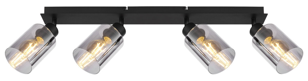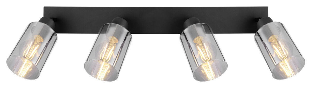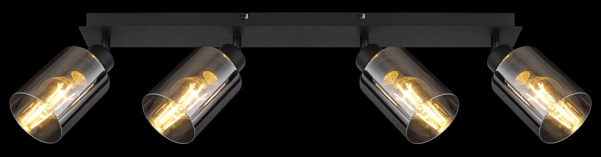 Ovaj prekrasni reflektor inspirira sjajnim dizajnom. Na uskom crnom mat metalnom kućištu (67x9cm) nalaze se četiri E27 utičnice, svaka opremljena prekrasnim cilindričnim sjenilom (Ø9cm) u dimnim bojama. Oni vam ostavljaju slobodan izbor da odredite boju svjetla i svjetlinu do maksimalne snage od 40 vati.
