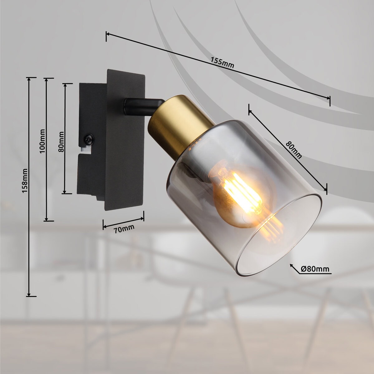 Otkrijte jedinstveni šarm HOLLSY! Napravljeni od crnog mat metala i mat metala zlatne boje, naši reflektori će dodati sofisticiranu atmosferu svakoj prostoriji. Dimljeno staklo sa jasnim gradijentom dizajna dodaje dašak elegancije vašem domu. Sa praktičnim preklopnim prekidačem na artiklu, imate potpunu kontrolu nad osvjetljenjem. Sa dimenzijama 80x158mm (širina x visina) i dužinom od 155mm, HOLLSY reflektor savršeno se uklapa u vaš enterijer. E14 utičnica vam omogućava da sami odredite boju svjetla i svjetlinu do maksimalne snage od 25 vati. Preuzmite HOLLSY sada i doživite sofisticiranu rasvjetu u svom domu!