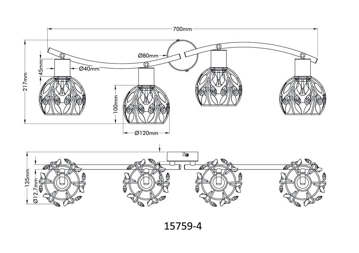 Mika reflektor kombinuje praktičnost sa elegantnim dizajnom i obogaćuje svaki dom elegantnim svetlom. Sa dva zakrivljena, zakrivljena kraka, ovaj reflektor nije samo pomičan, već se i fleksibilno prilagođava vašim potrebama za rasvjetom. Kućište od mat crno lakiranog metala daje mu modernu, ali u isto vrijeme tradicionalnu estetiku. Umjetnički dizajnirane nijanse u zlatno-patiniranom metalu i elegantnoj crnoj boji ukrašene su filigranskim listovima i svjetlucavim kristalima. Ovi elementi odražavaju svjetlost na jedinstven način i stvaraju atmosferu dobrodošlice. Sa četiri E14 grla (osim E14), imate mogućnost odabira pravih sijalica i prilagođavanja osjećaja svjetla. Idealan za dnevne sobe, urede ili hodnike, Mika reflektor je savršen izbor za one koji žele spojiti elegantan dizajn s funkcionalnošću. Unesite svjetlost i šarm u svoj dom!