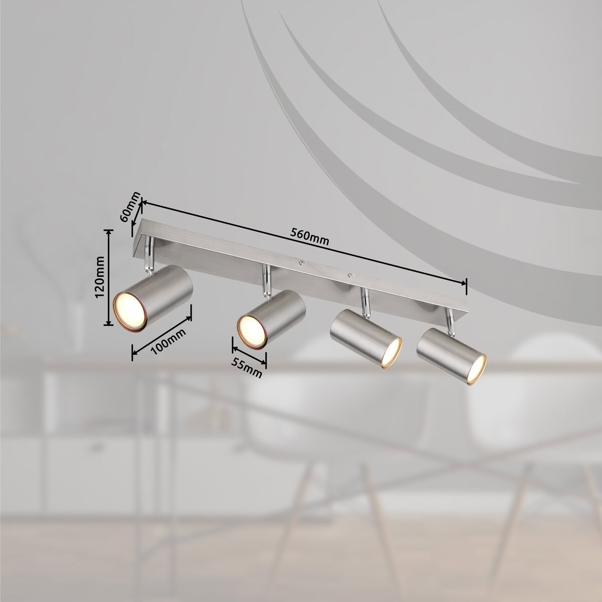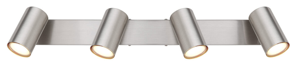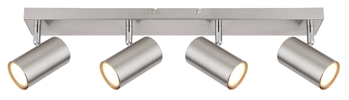 Ovaj jednostavan reflektor Robby serije inspiriše dizajnom i bojama. Na pravougaonom plafonskom nosaču od nikla (56x6cm) nalaze se četiri GU10 utičnice, svaka pokrivena cilindričnom bojom. Grlo GU10, omogućava vam da slobodno birate sijalice, do maksimalne snage 35 vati.