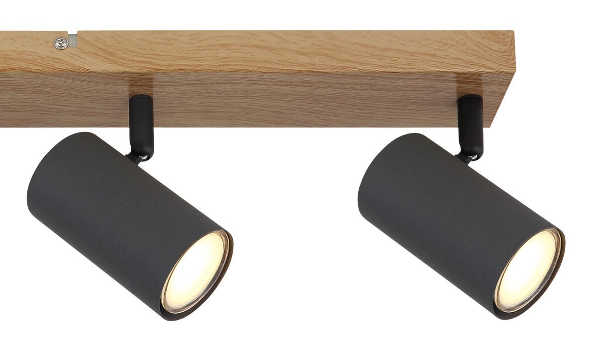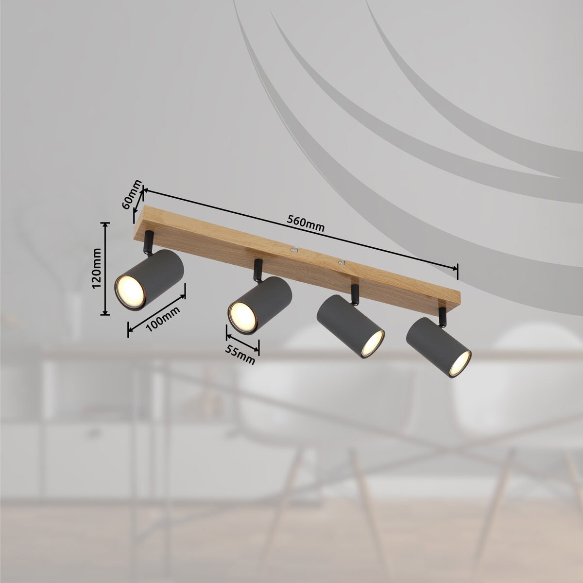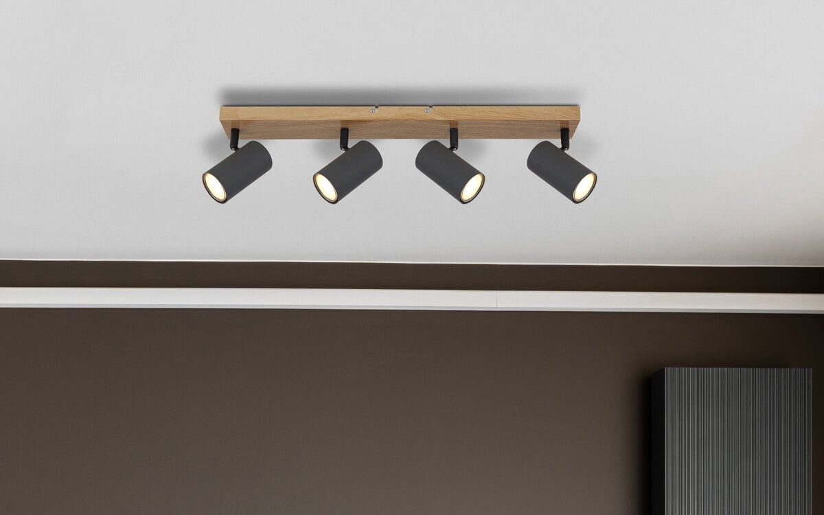 Ovaj jednostavan reflektor Robby serije inspiriše dizajnom i bojama. Na pravougaonom plafonskom nosaču u drvenom dizajnu (56x6cm) nalaze se četiri GU10 utičnice, svaka prekrivena cilindričnim sjenilom od mat grafita. Grlo GU10, omogućava vam da slobodno birate sijalice, do maksimalne snage 35 vati.