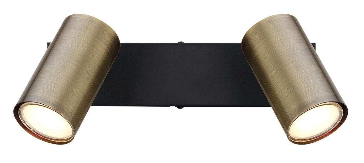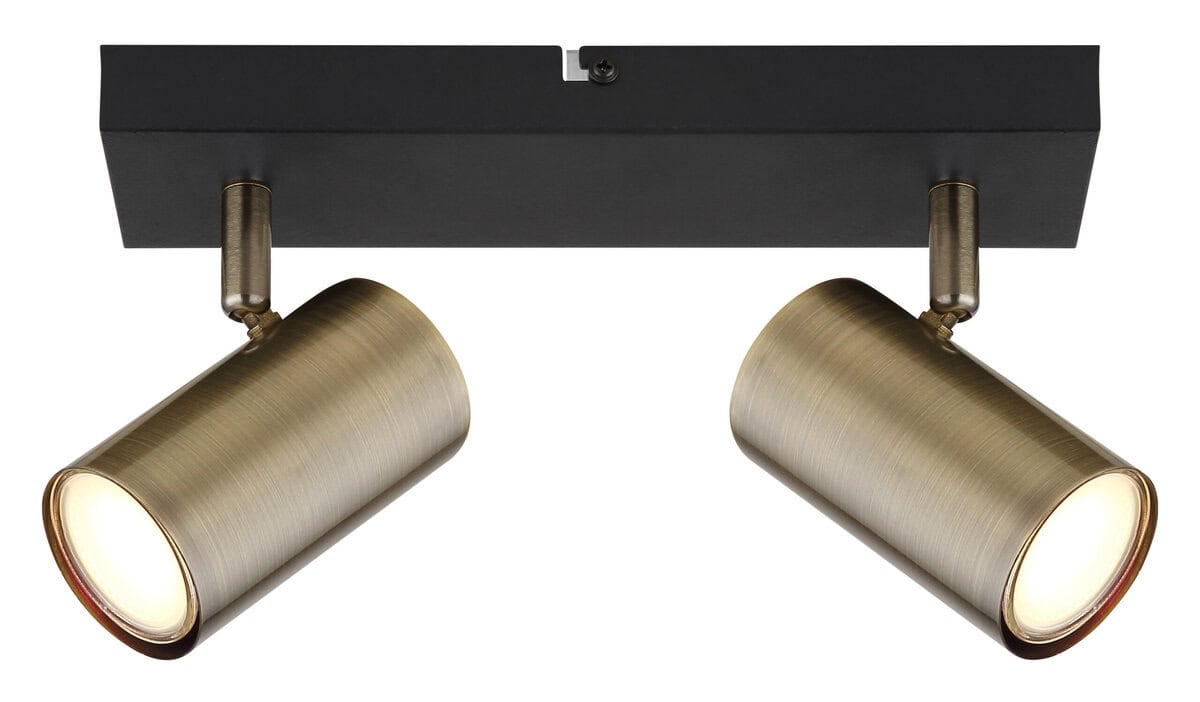Ovaj jednostavan reflektor Robby serije inspiriše dizajnom i bojama. Na pravougaonom plafonskom nosaču (26x6cm) u mat crnoj boji nalaze se dvije GU10 utičnice, svaka pokrivena cilindričnim sjenilom u boji starog mesinga. GU10 grlo vam omogućava da slobodno birate sijalice, do maksimalne snage od 35 W.