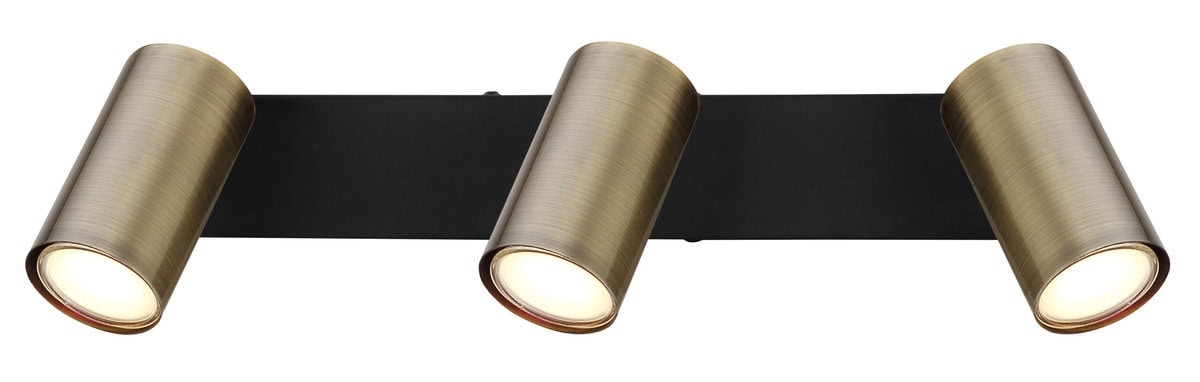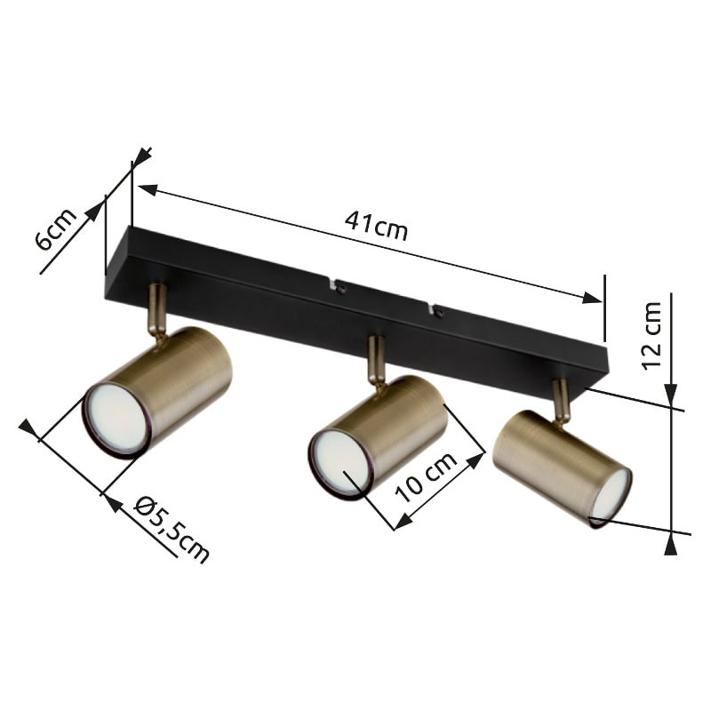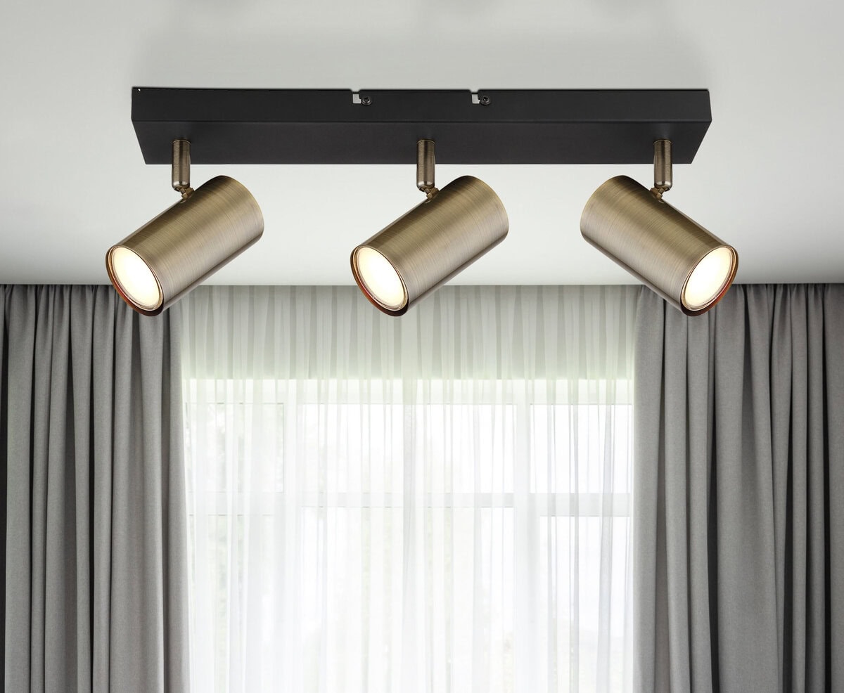 Ovaj jednostavan reflektor Robby serije inspiriše dizajnom i bojama. Na pravougaonom plafonskom nosaču (41x6cm) u mat crnoj boji nalaze se tri GU10 utičnice, svaka pokrivena cilindričnim sjenilom u boji starog mesinga. Grlo GU10, omogućava vam da slobodno birate sijalice, do maksimalne snage 35 vati.