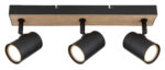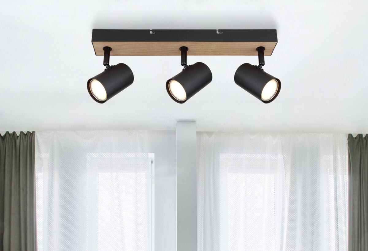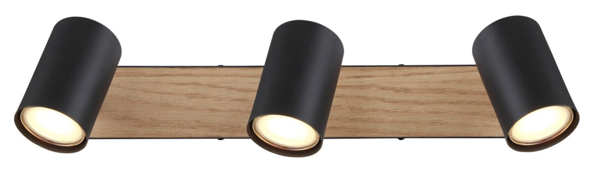 Ovaj jednostavan reflektor Robby serije inspiriše dizajnom i bojama. Na pravougaonom plafonskom nosaču od crnog mat metala i MDF-a u izgledu drveta (41 x 6cm) nalaze se tri GU10 utičnice, svaka pokrivena cilindričnim sjenilom. Grlo GU10, omogućava vam da slobodno birate sijalice, do maksimalne snage 35 vati.