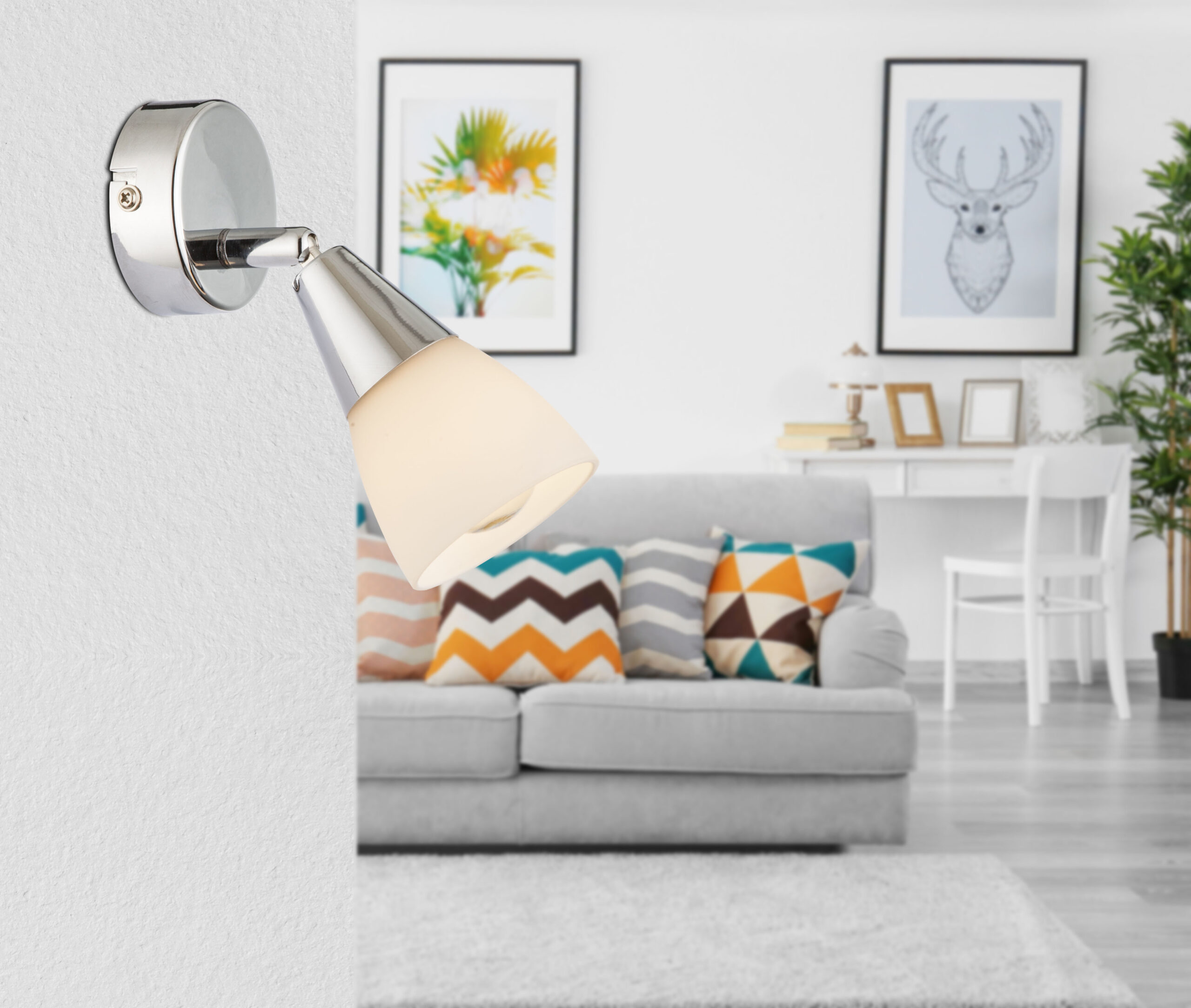 Moderni zidni reflektor Tadeus ističe svojim dizajnom i odličnim materijalima. Kromirani metal i opalno staklo glavne su komponente ove sjajne zidne lampe. Sijalicu za priključeno grlo E14 možete sami odrediti (max.40W). Zbog uštede energije i dugovečnosti preporučujemo LED lampe. Sa drugim lampama iste serije modela možete upotpuniti sliku u svom dnevnom boravku.