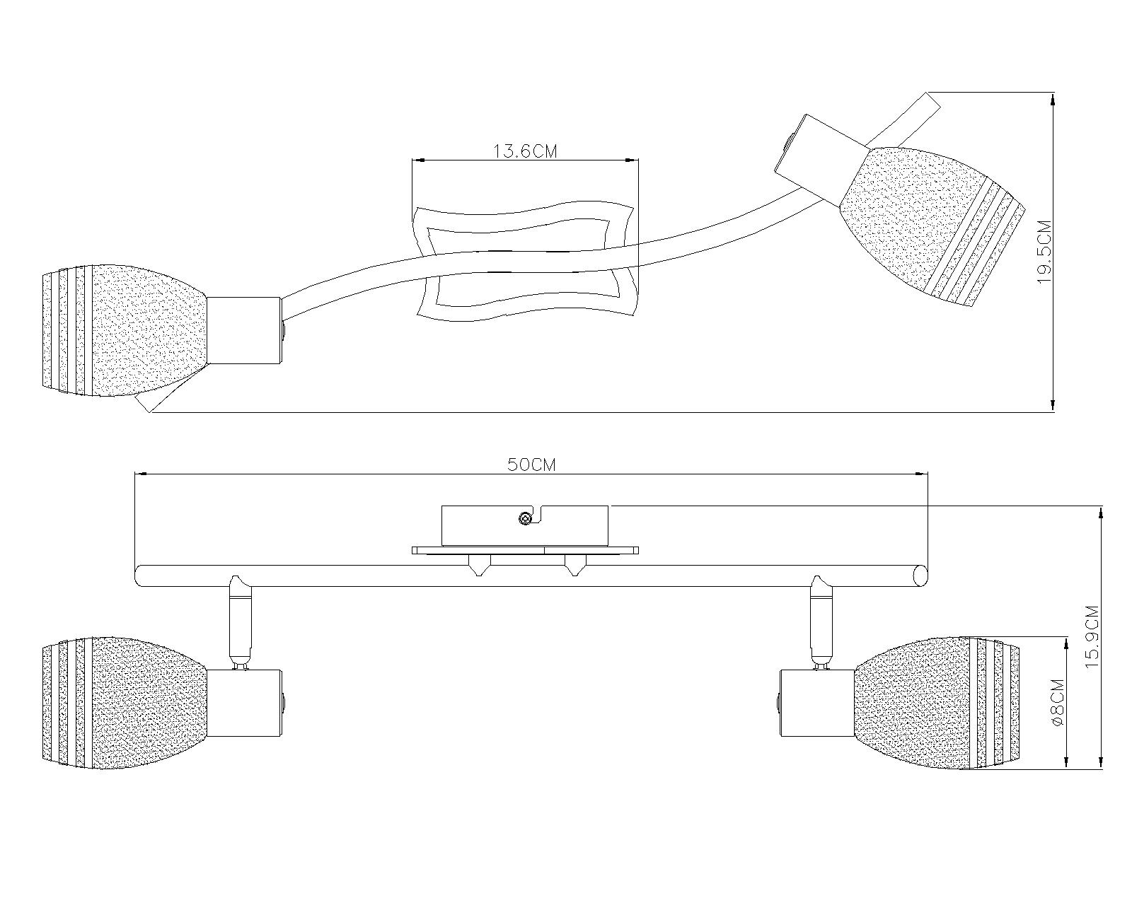 Svjetlo reflektora iz Toay porodice proizvoda uvjerava svojim jednostavnim, ali zanimljivim izgledom. Na zakrivljenim hromiranim gredama nalaze se dva reflektora sa sjenilima od sateniranog opalnog stakla, koji su također pokretni. Sa veličinom od 50 cm, ova lampa će sigurno naći dobro mjesto. Zbog dva grla E14 ostavljamo vam slobodu da odaberete odgovarajuću sijalicu (maks. 40W).