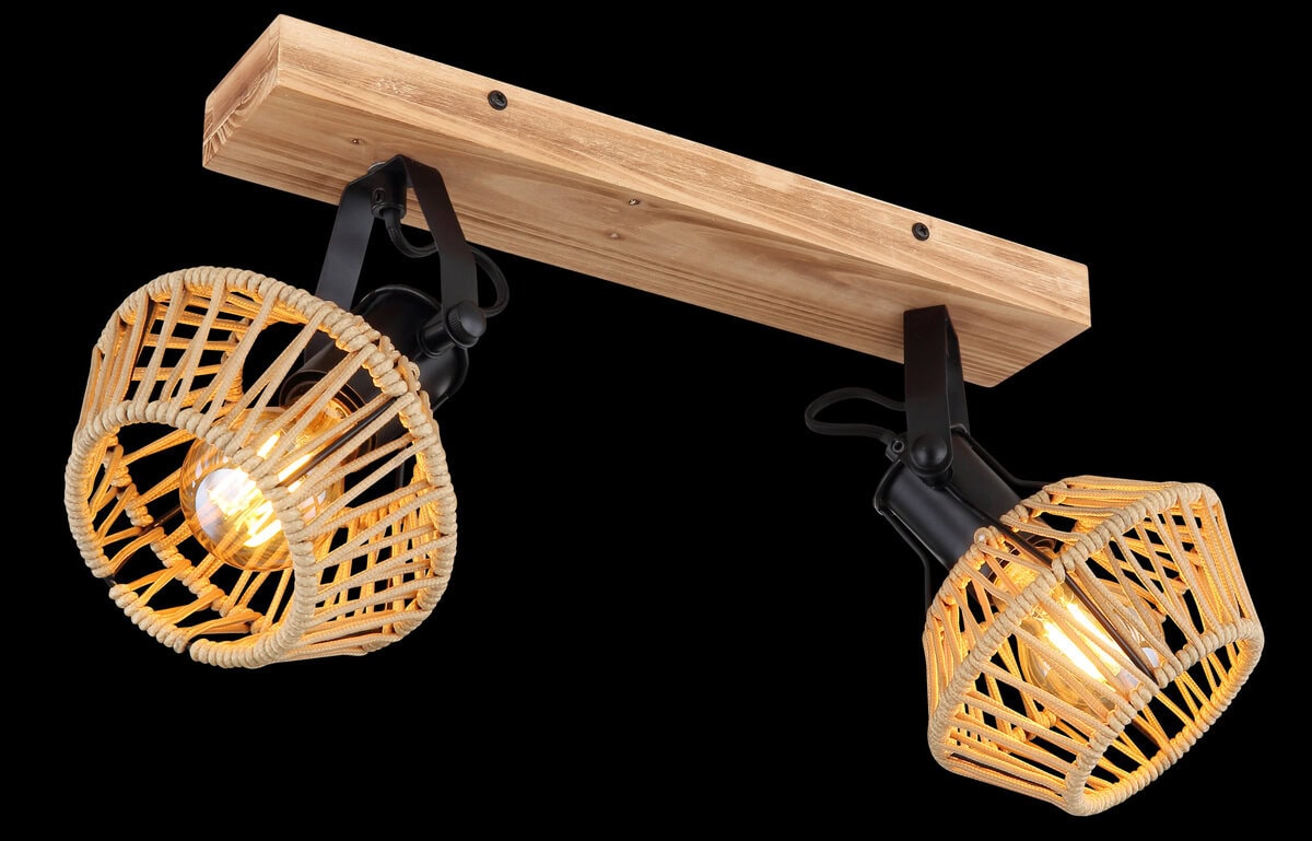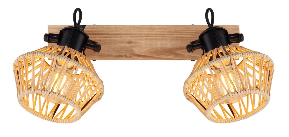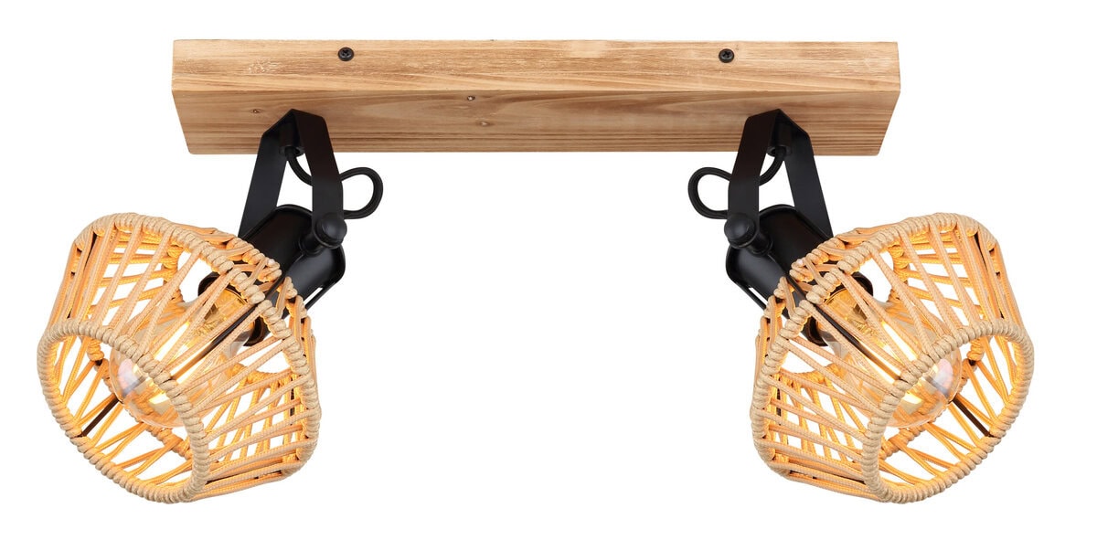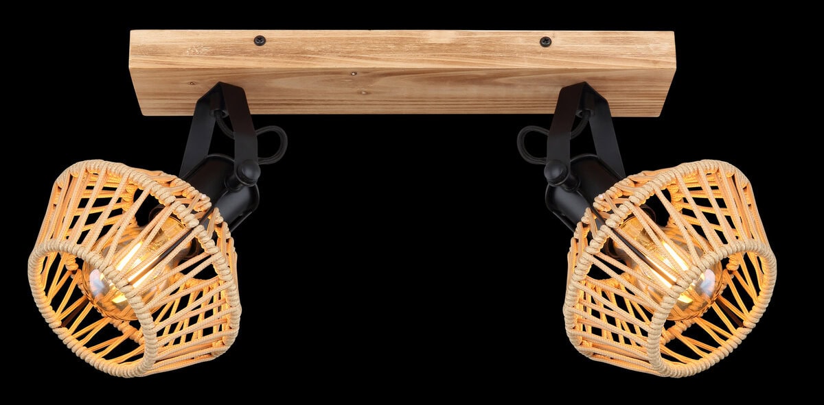 Ovaj prekrasni reflektor inspirira sjajnim dizajnom. Na uskom plafonskom nosaču u prekrasnom izgledu drveta (38x16cm) nalaze se dvije crne mat spojnice, svaka sa E27 nastavkom, opremljene kišobranom od užeta (Ø15,5cm). E27 utičnica vam daje priliku da odredite boju i svjetlinu do maksimalne snage od 60 vati. Uz ostale modele ove serije možete savršeno upotpuniti svoj dnevni boravak.