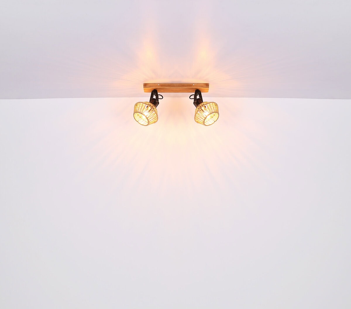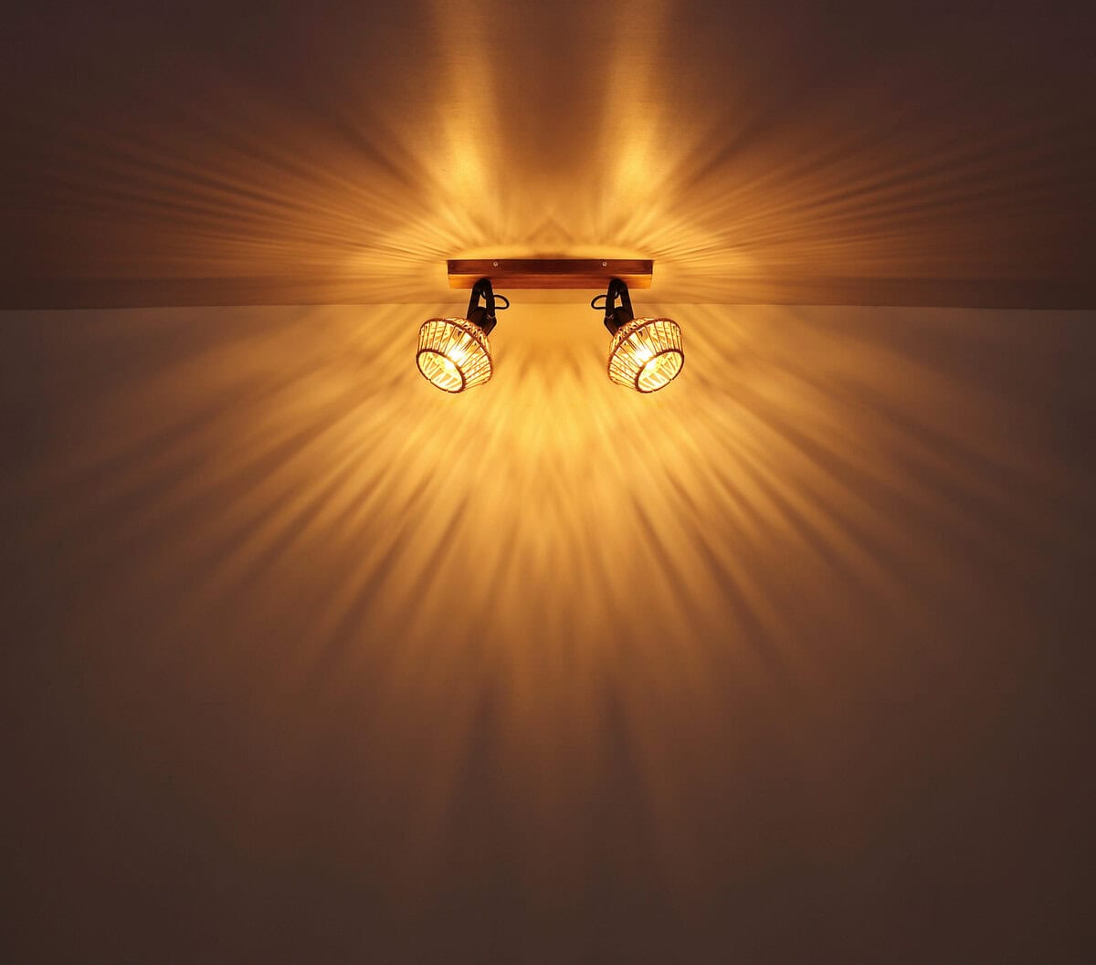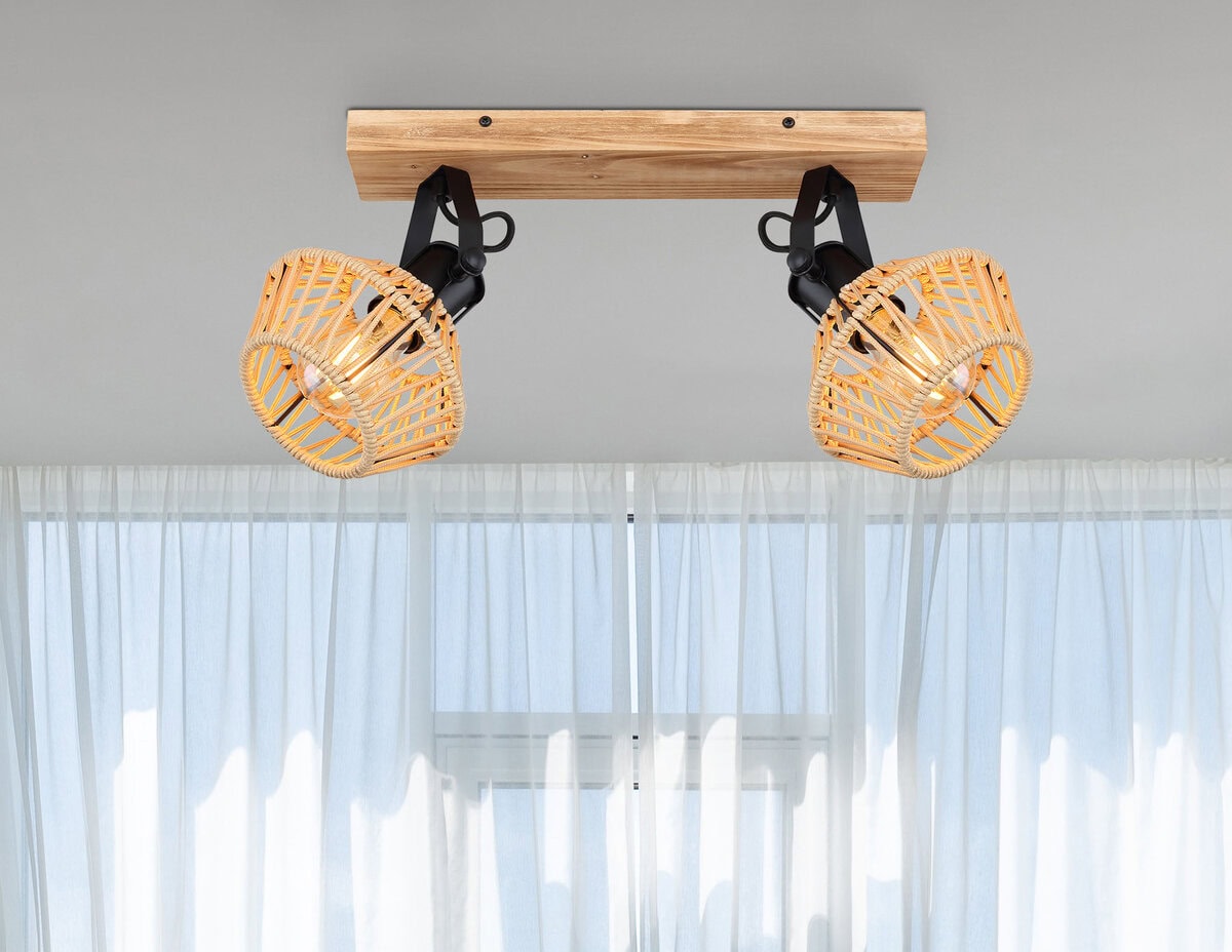 Ovaj prekrasni reflektor inspirira sjajnim dizajnom. Na uskom plafonskom nosaču u prekrasnom izgledu drveta (38x16cm) nalaze se dvije crne mat spojnice, svaka sa E27 nastavkom, opremljene kišobranom od užeta (Ø15,5cm). E27 utičnica vam daje priliku da odredite boju i svjetlinu do maksimalne snage od 60 vati. Uz ostale modele ove serije možete savršeno upotpuniti svoj dnevni boravak.