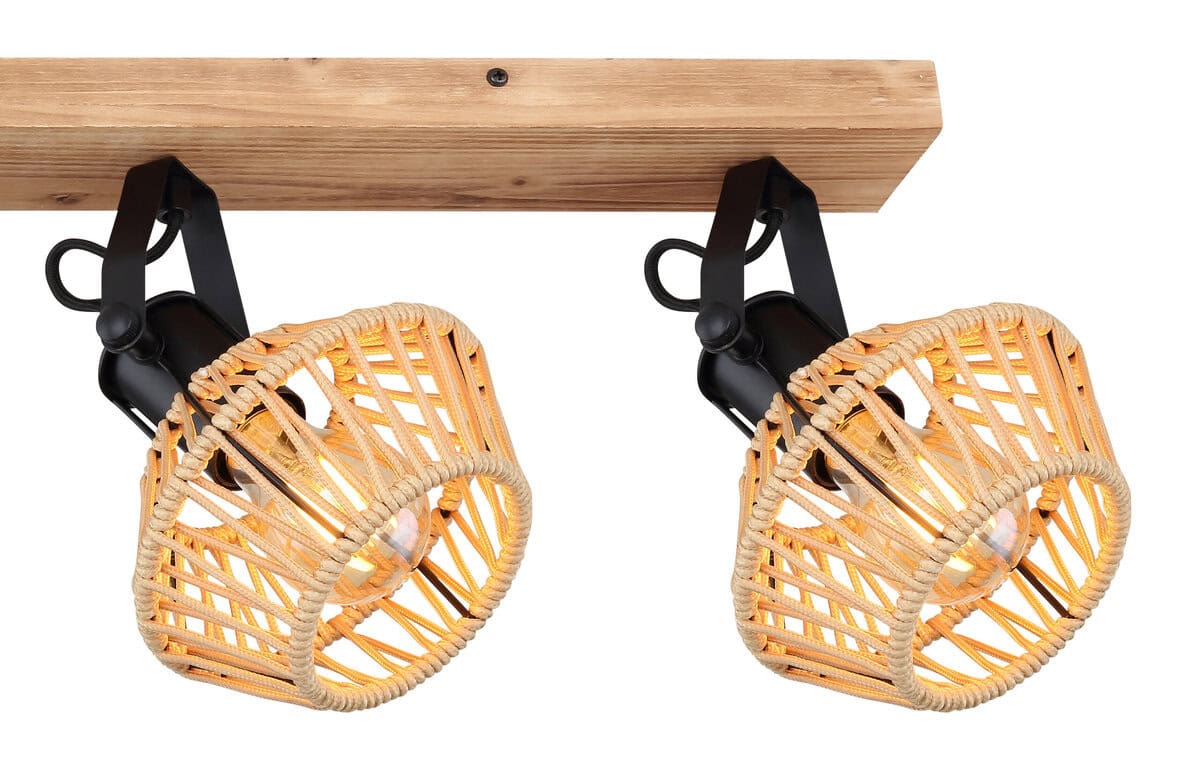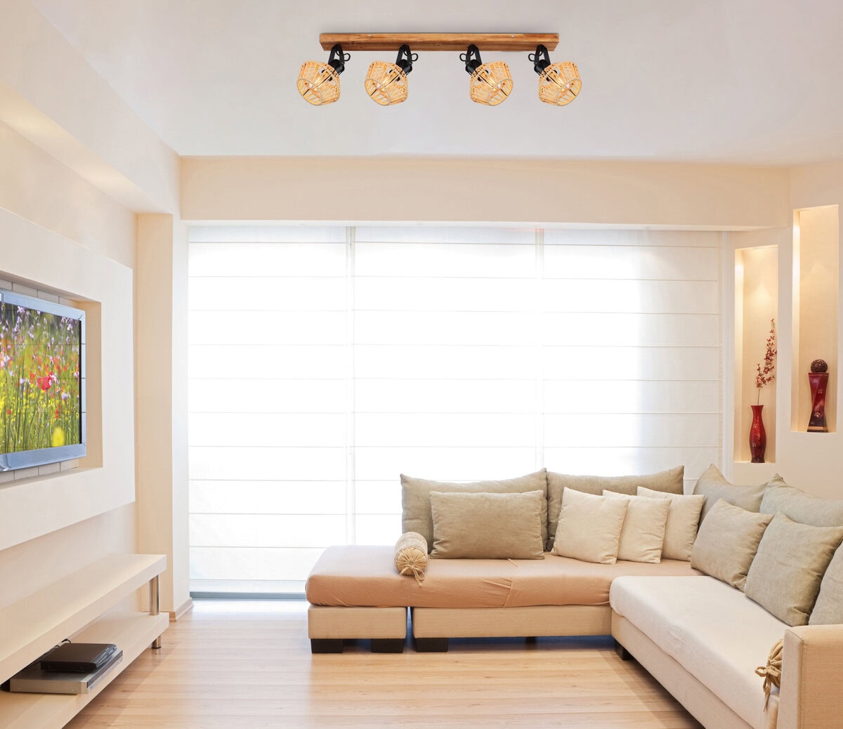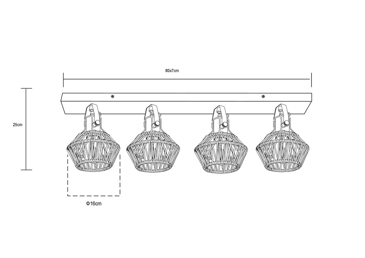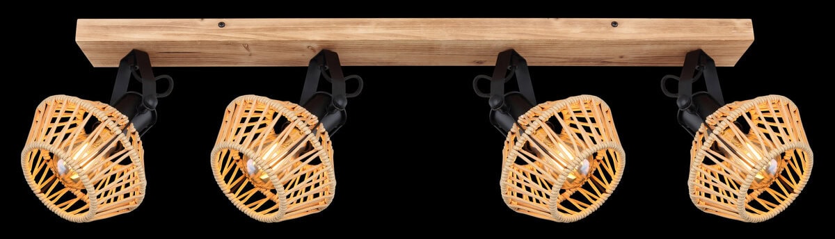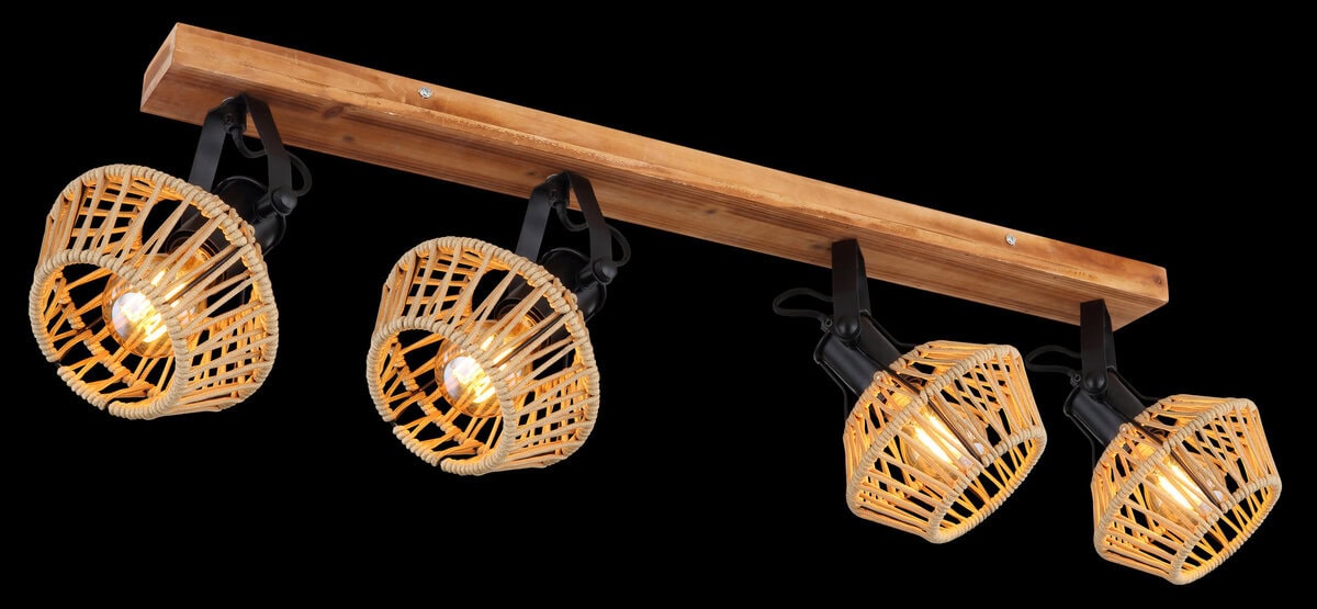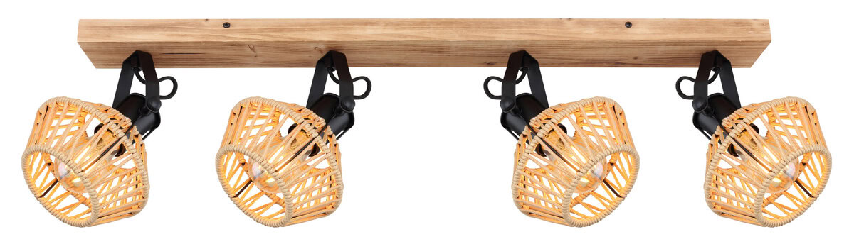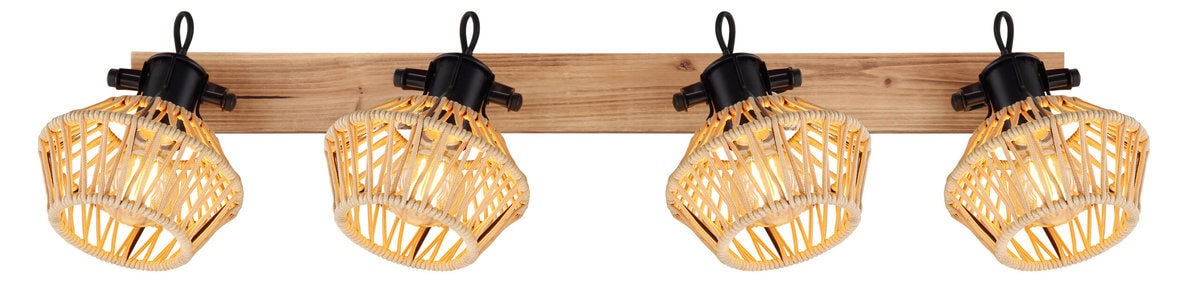 Ovaj prekrasni reflektor inspirira sjajnim dizajnom. Na uskom plafonskom nosaču u prekrasnom izgledu drveta (80x16cm) nalaze se četiri crne mat spojnice, svaka sa E27 nastavkom, opremljena ekranom od mreže od užeta (Ø15,5cm). E27 utičnica vam daje mogućnost da sami odredite boju svjetla i svjetlinu do maksimalne snage od 60 vati. Ostali modeli ove serije vam omogućavaju da savršeno upotpunite svoj dnevni boravak.