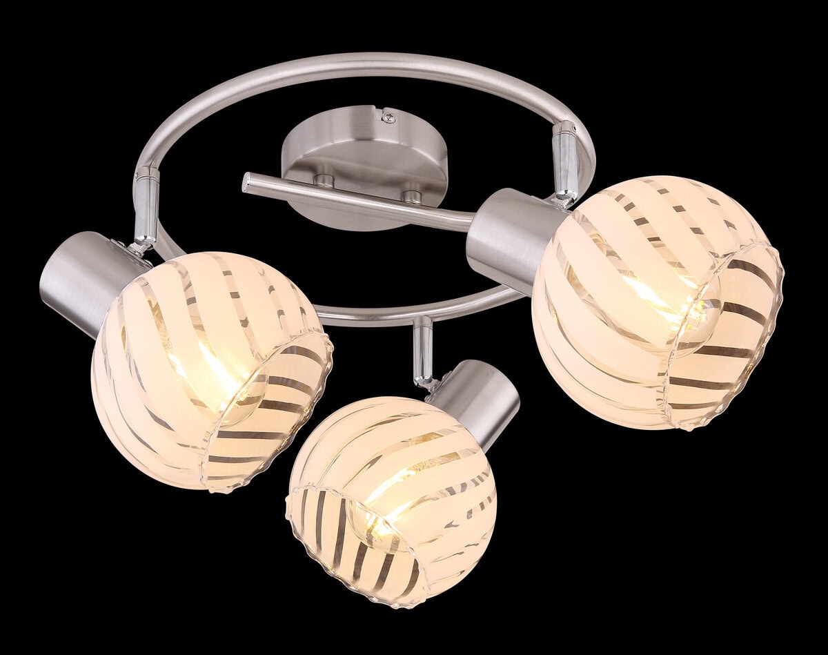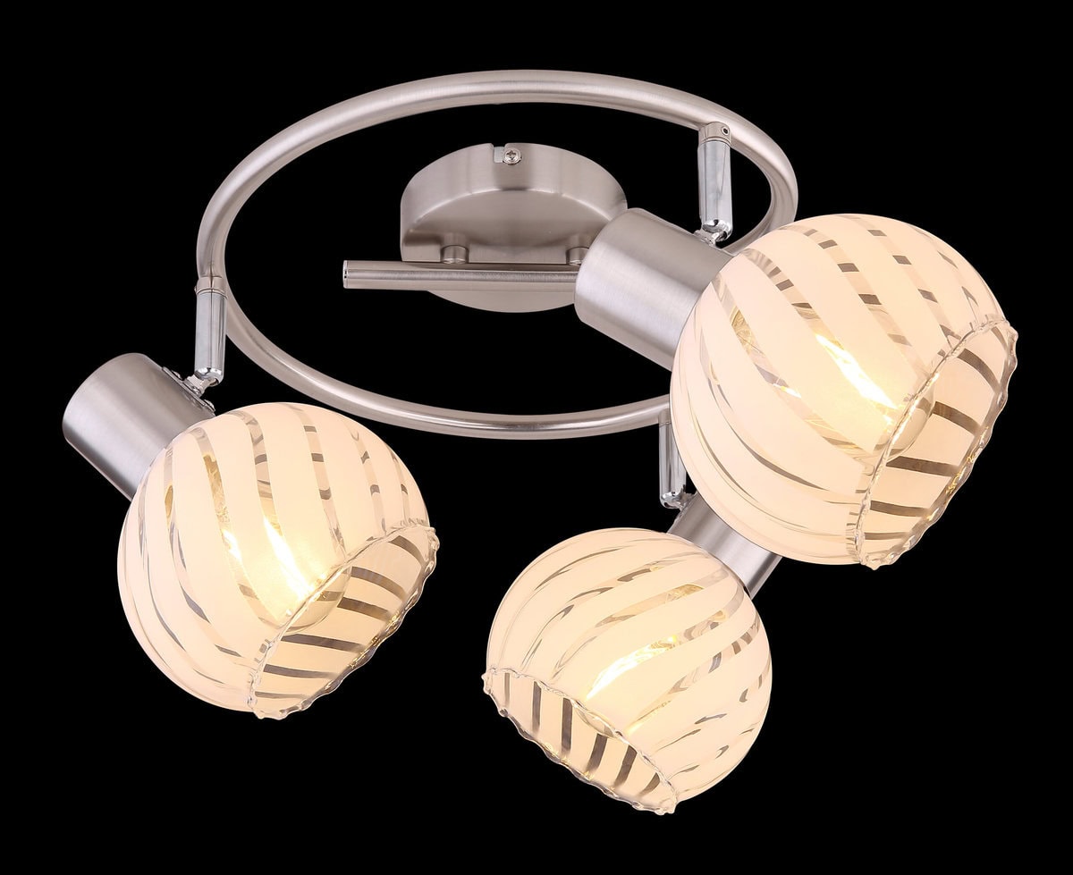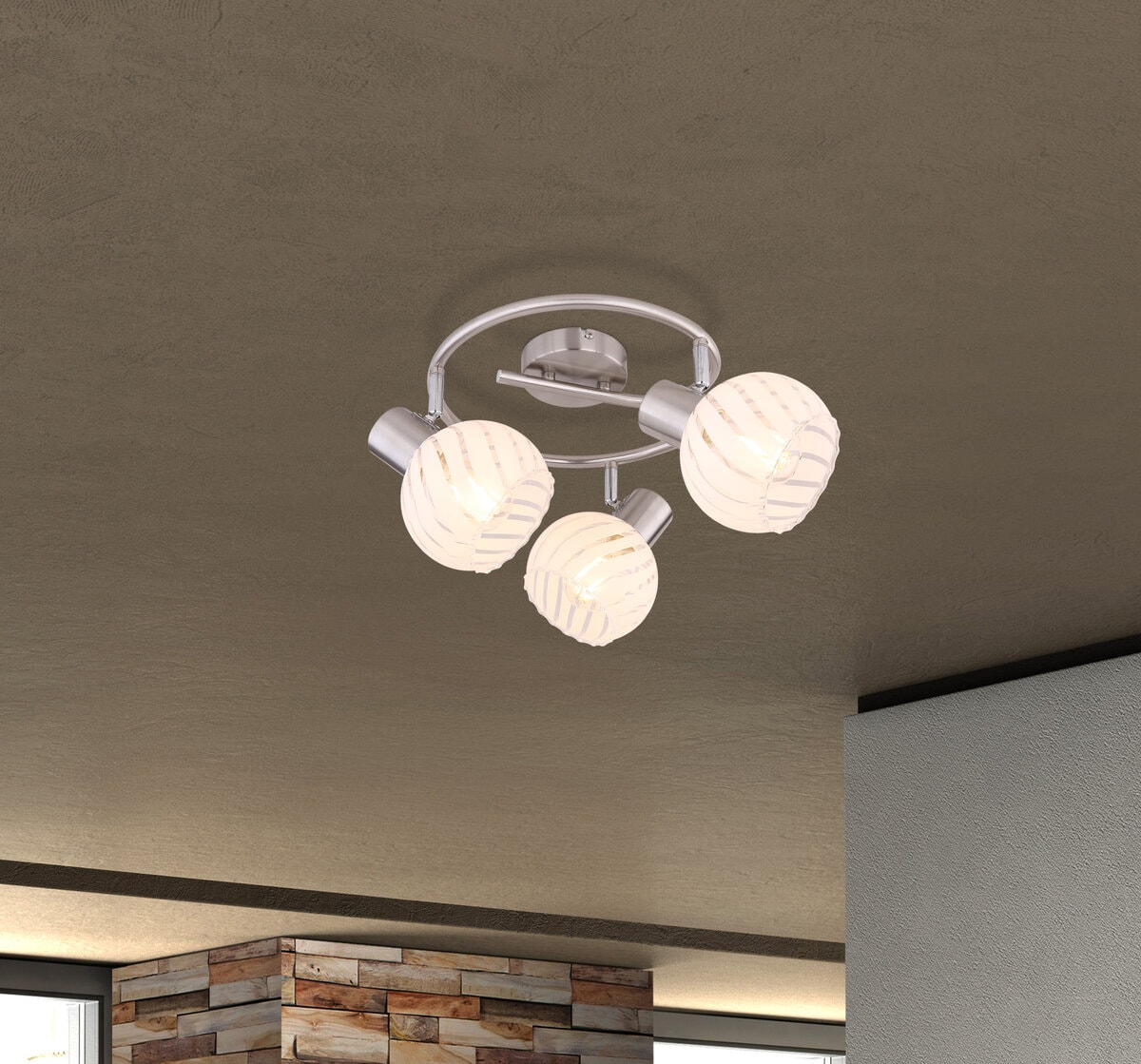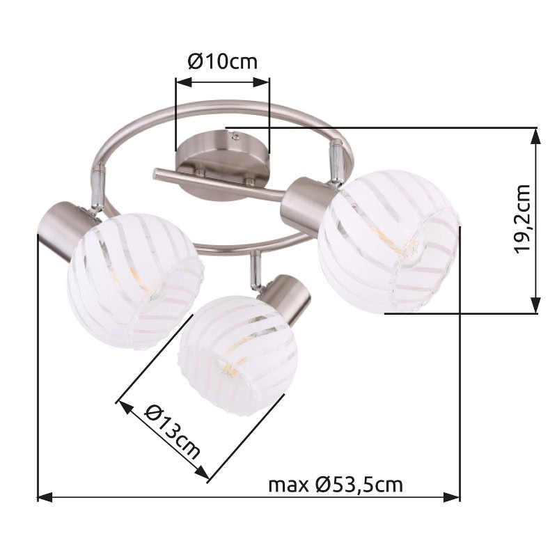 Stropna lampa WILLY ove serije proizvoda uvjerava kombinacijom dizajna i izrade. Kombinacija materijala nikl-mat metala i sfernih, užljebljenih i prugastih prozirno bijelih naočala pruža odličan izgled. Spotovi, koji su pričvršćeni za fiksnu zakrivljenu ruku u obliku e, opremljeni su sa tri E27 grla, što vam omogućava da sami odredite sijalicu (3 x max.40W) kako biste odlučili o intenzitetu svjetlosti i boji svjetla. Sa drugim reflektorima iste serije proizvoda možete upotpuniti sliku u svojim sobama.