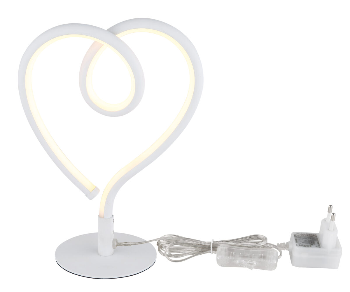 Elegantna rasvjeta za vaš dizajn interijera: AMORE stolna lampa! Ova elegantna rasvjeta sastoji se od kućišta u obliku srca od bijelog mat lakiranog metala, koje se nalazi na zakrivljenoj stabljici. Sjenilo od bijelog mat lakiranog aluminija i silikonskog opala stvara toplu i privlačnu rasvjetu. Upravljanje je moguće preko prekidača za navigaciju na kablu. AMORE dolazi sa adapterom i stoga se lako instalira. Snaga od 250 lumena pruža prijatno osvetljenje. Temperatura boje od 3000K stvara toplu i elegantnu atmosferu. AMORE je savršen za parove ili čak za interijere kojima je potreban bijeli dodir. Dopustite da vas očara romantična rasvjeta AMORE!
