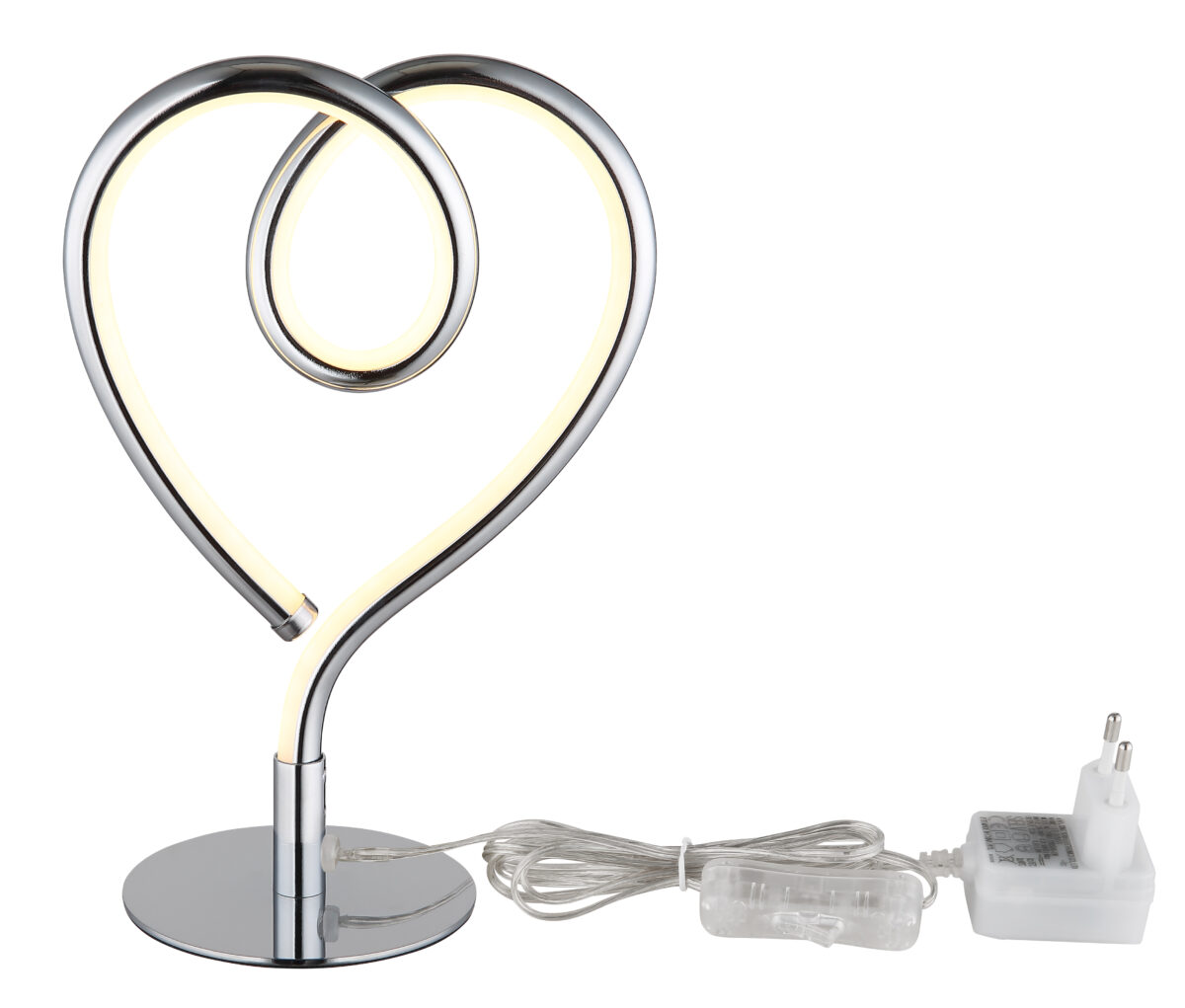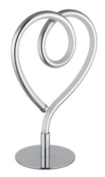 Otkrijte šarmantnu stonu lampu AMORE koja će vašem interijeru dodati romantičnu notu. AMORE se sastoji od tela u obliku srca napravljenog od hromiranog metala, koje se nalazi na zakrivljenoj stabljici. Sjenilo od kromiranog aluminija i silikonskog opala stvara toplo i prijateljsko osvjetljenje. Upravljanje je moguće preko prekidača za navigaciju na kablu. AMORE dolazi sa adapterom i stoga se lako instalira. Snaga od 250 lumena pruža prijatno osvetljenje. Temperatura boje od 3000K stvara toplu i privlačnu atmosferu. AMORE je idealan za parove ili za objekte kojima je potreban romantičan dodir.