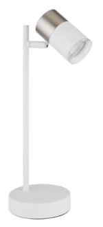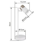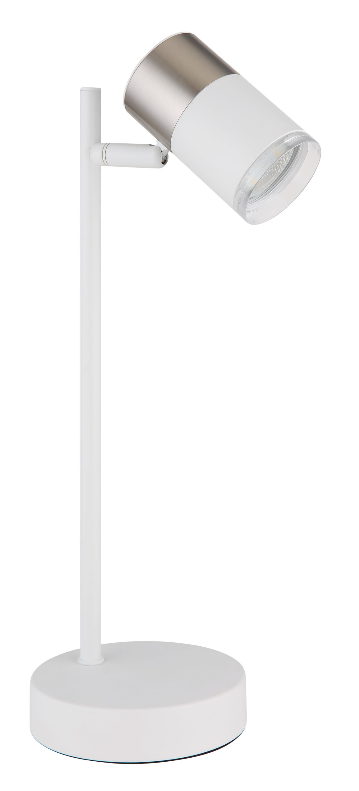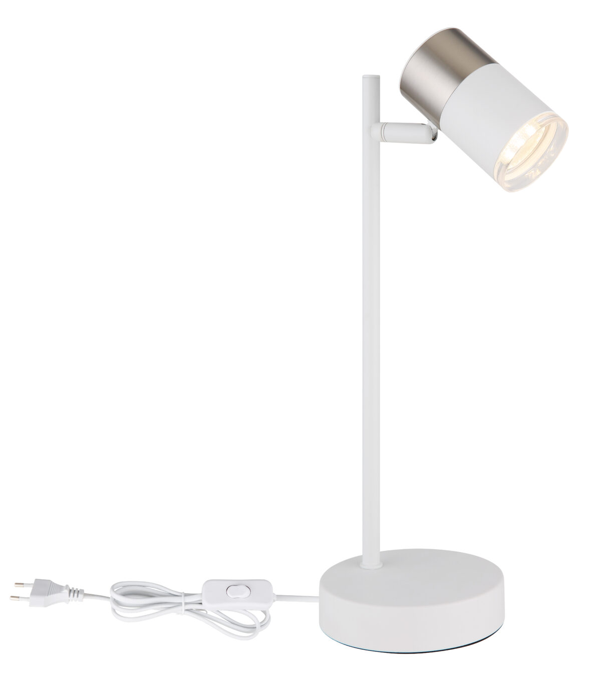 Elegantna stolna lampa s ravnom cijevi i cilindričnim reflektorom s ukrasnim prstenom je elegantna opcija rasvjete za vaš dnevni boravak. Stona lampa je izrađena od mat bijelog metala i ima GU10 LED reflektor snage 5W. Sjenilo lampe je izrađeno od visokokvalitetnog aluminija u mat nikal i bijeloj boji, kao i od prozirne plastike, što lampi daje moderan izgled. Sa dužinom od 132 mm i širinom od 120 mm, stona lampa savršeno se uklapa na vaš radni sto, noćni stočić ili bočni sto i pruža prijatno osvetljenje. Preklopni prekidač na kablu olakšava rukovanje svetiljkom. Unesite stil i svjetlinu u svoj dom s ovom bijelom metalnom stolnom lampom i stvorite ugodnu atmosferu suvremenog dizajna.