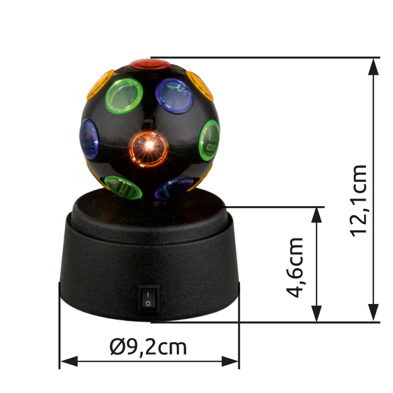 Ova stolna lampa napravljena od crne i šarene plastike pretvara svaki sto u privlačan pogled. Poput disko kugle, okreće se u krug i sija u mnogim jarkim bojama. Prekidač omogućava uključivanje i isključivanje lampe od 12 cm.