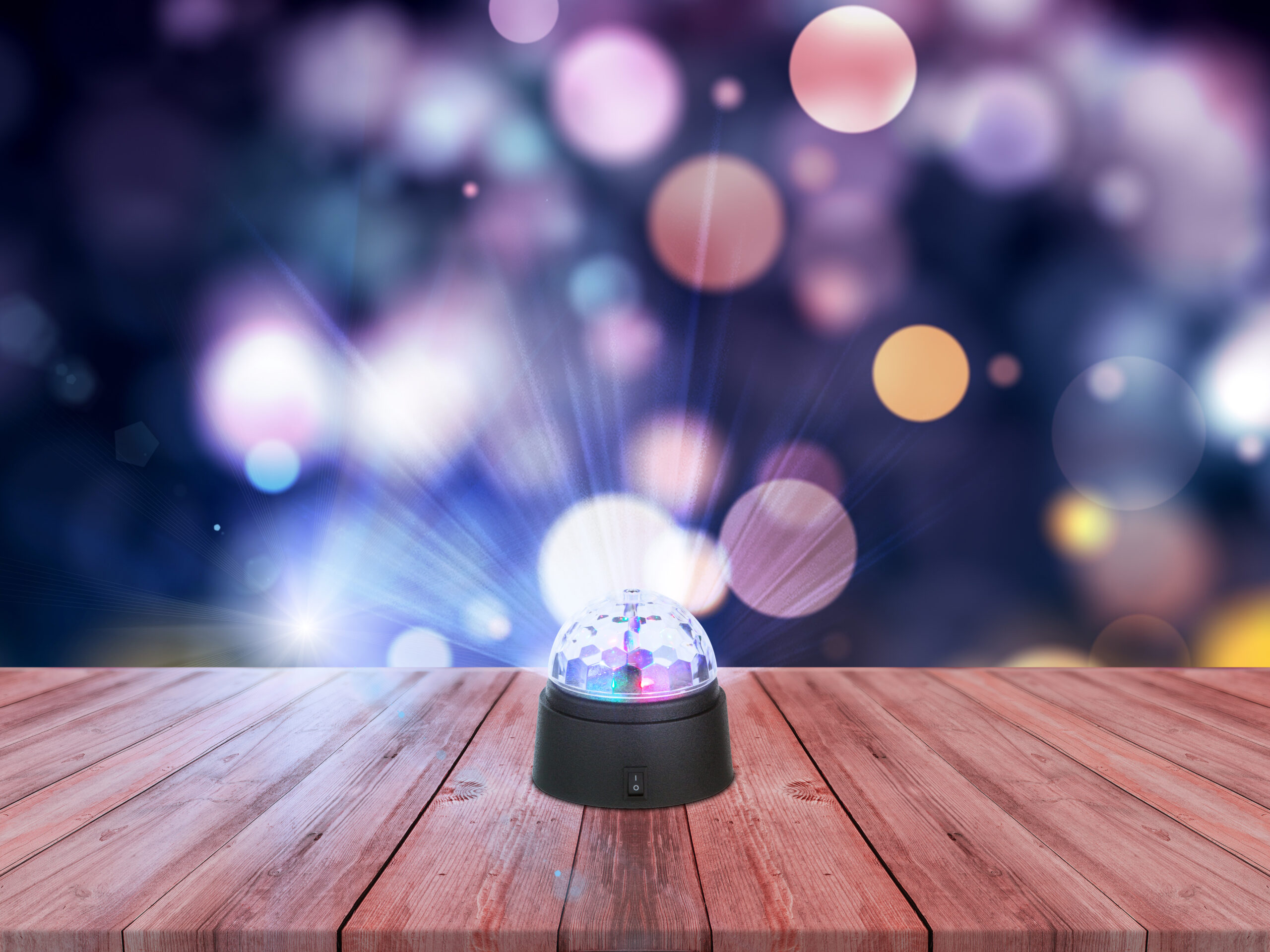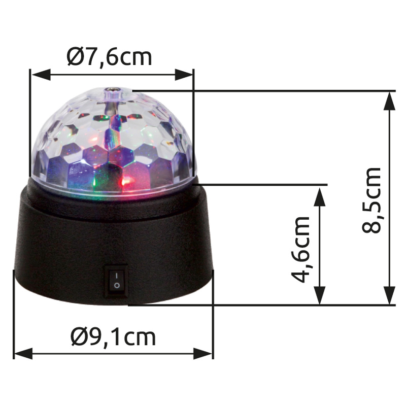 Ova stolna lampa izrađena od crne i prozirne plastike pretvara svaki sto u privlačno mjesto. Kroz disko svjetlo i kristalne zvijezde sija u mnogim jarkim bojama. Prekidač omogućava uključivanje i isključivanje lampe od 8,5 cm.