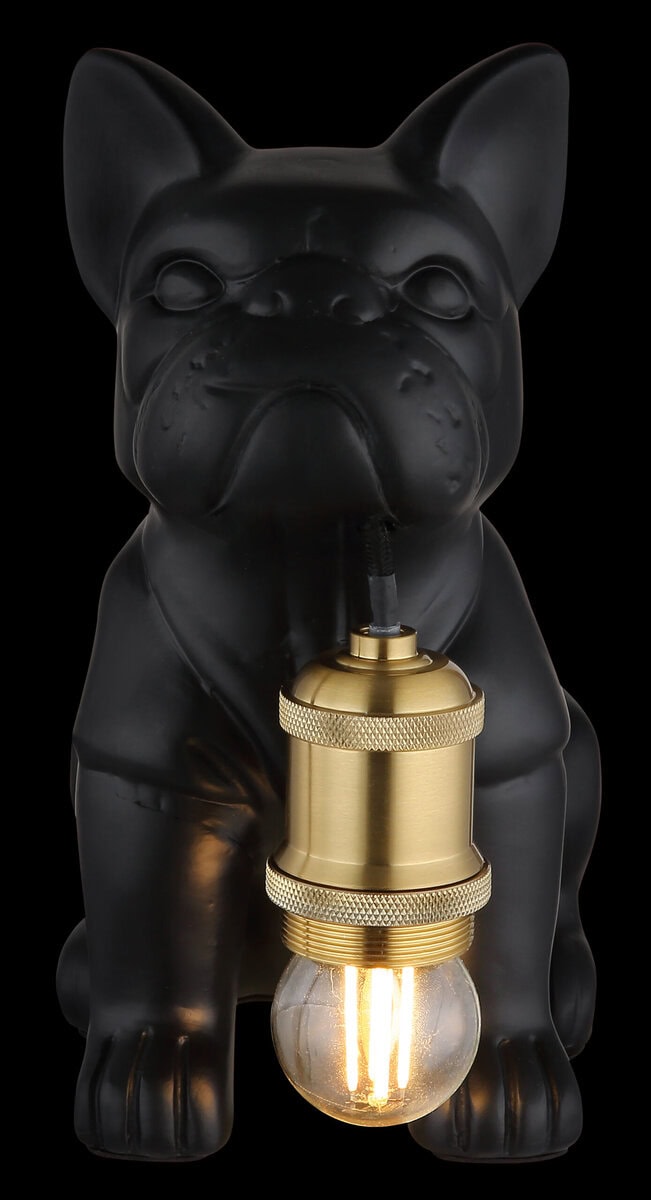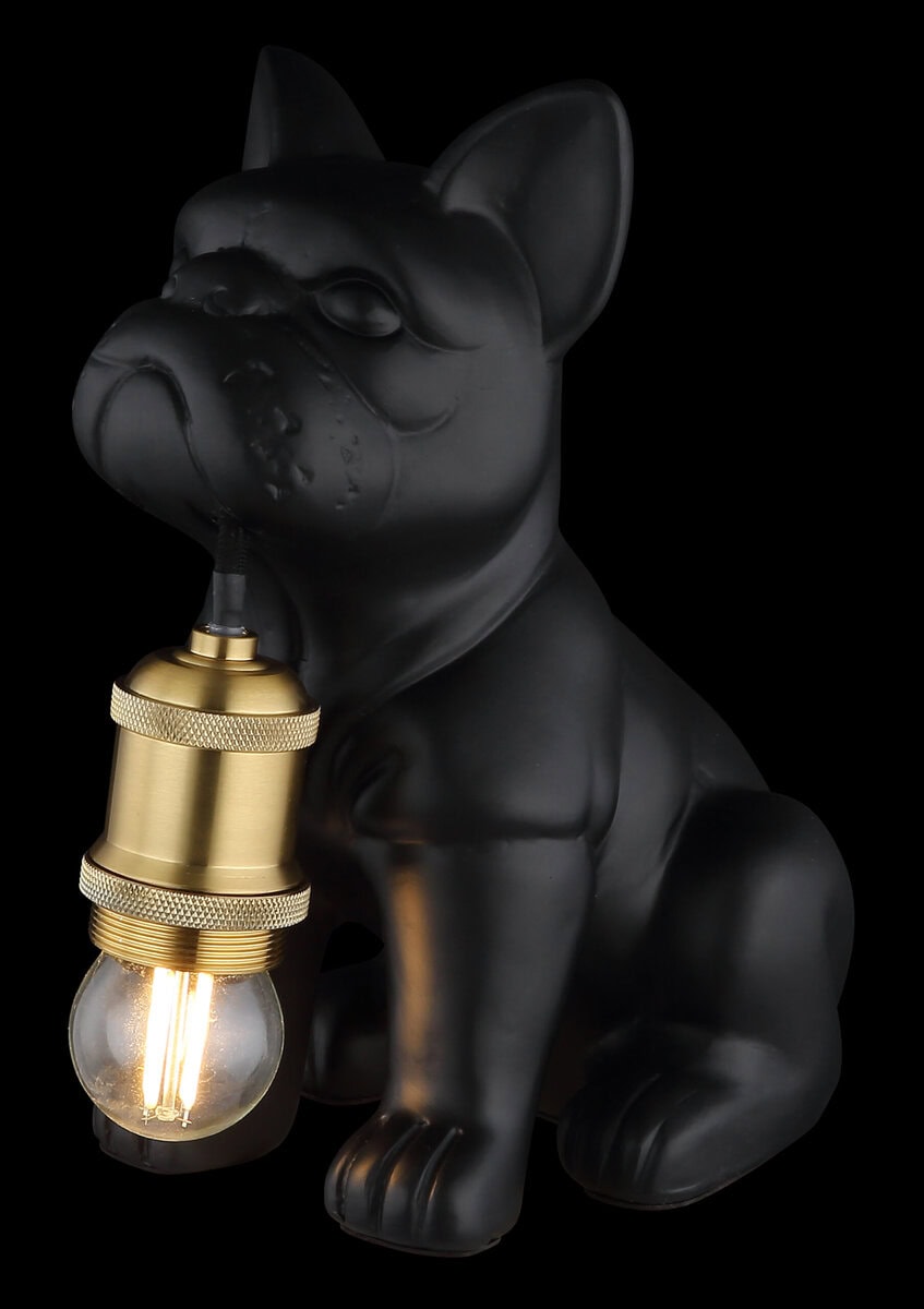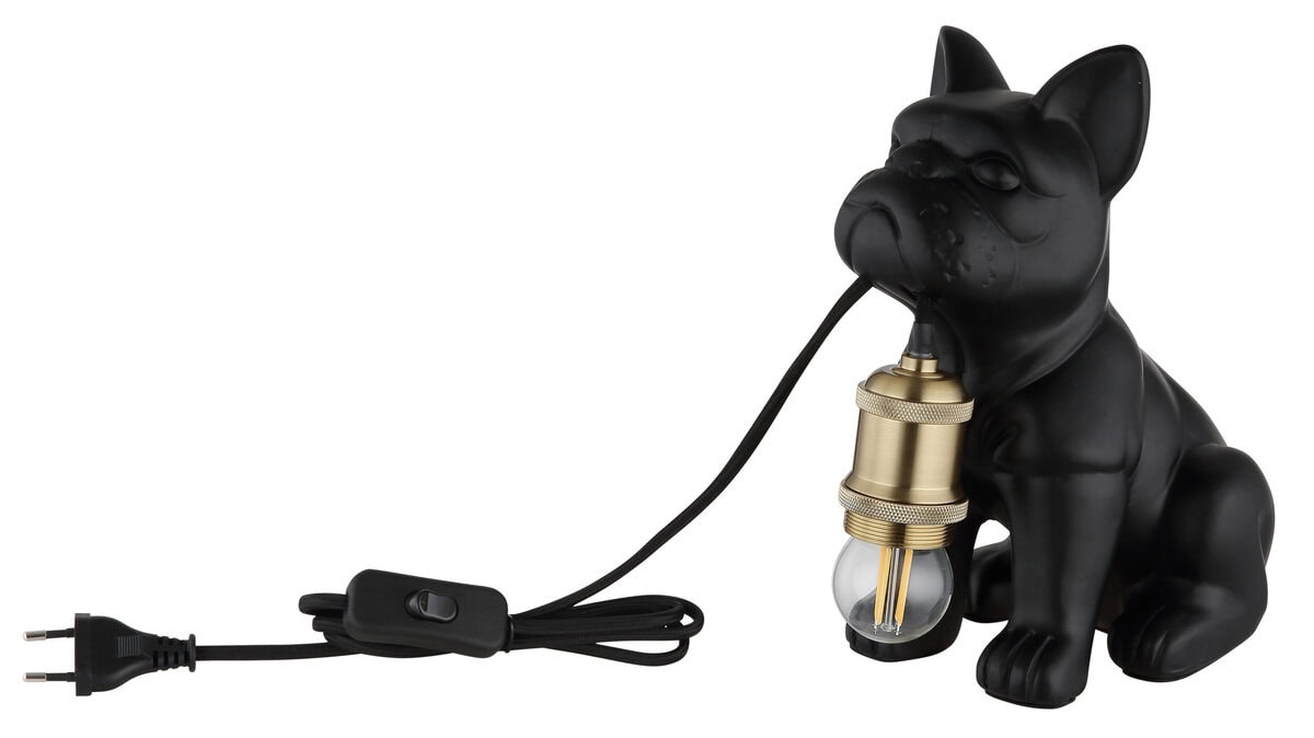 Stolna lampa DOGO CERAMIC BLACK MATT pravi je vrhunac za sve ljubitelje životinja i dizajna. Dekorativno postolje lampe u obliku psa koji sjedi od crne mat keramike daje lampi šarmantan, individualan izgled. Utičnica E27 je usmjerena prema dolje i stilski je dopunjena metalnom bojom bakra – uspješan kontrast materijala i boja koji stvara topao, ugodan svjetlosni ambijent. Svjetlom se može lako upravljati pomoću praktičnog prekidača na kabelu. Bilo kao atmosfersko osvjetljenje na ormaru, noćnom ormariću ili radnom stolu – DOGO stolna lampa nije samo funkcionalna, već je i dekorativni kućni dodatak sa karakterom. Lampa se isporučuje bez sijalice, tako da možete kreirati svjetlosno raspoloženje prema vašim zamislima. Šarmantan kućni dodatak za sve koji vole nešto posebno.